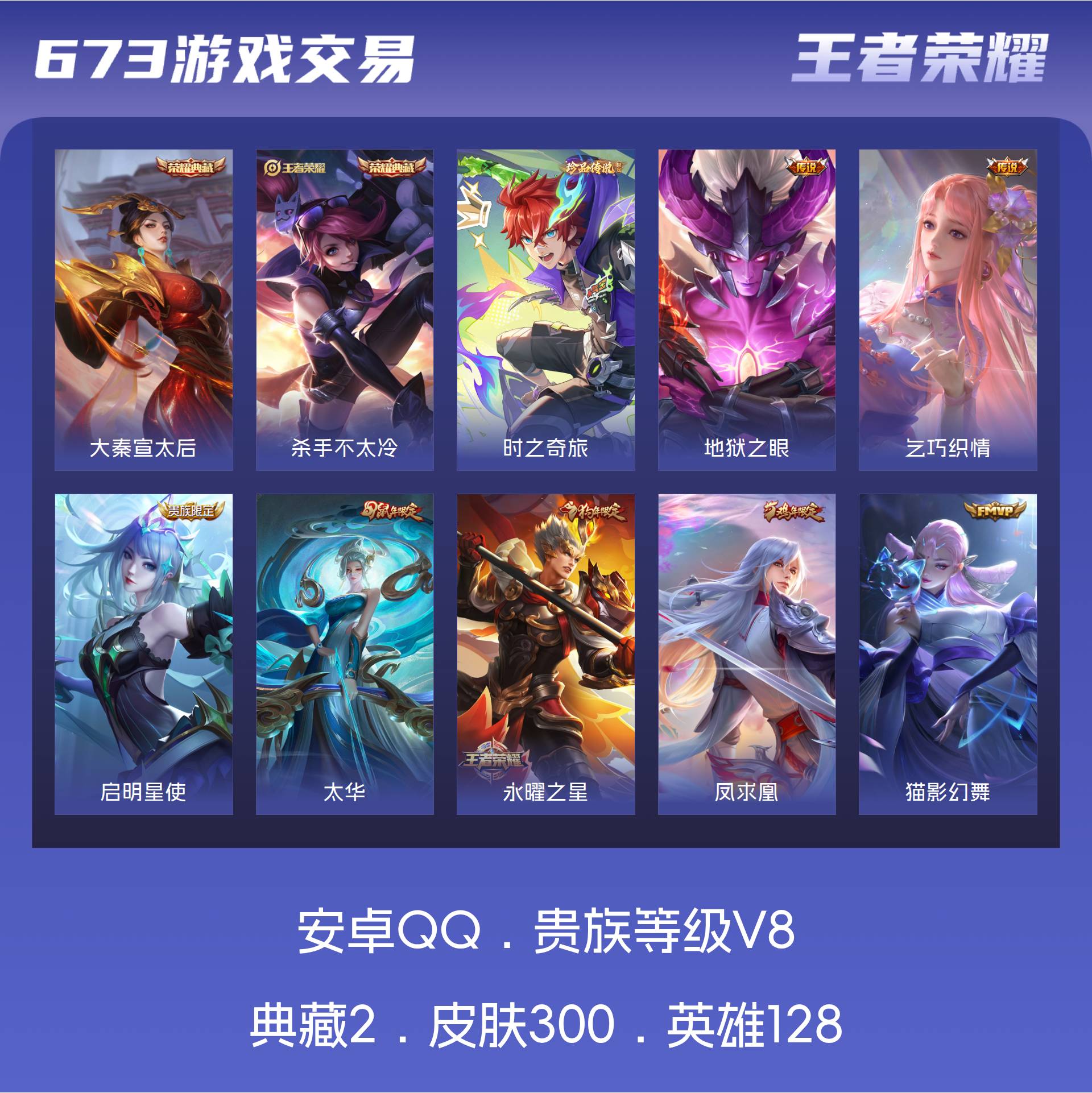 安卓QQ/永恒钻石/300皮肤/128英雄/2典藏/0珍品无双/0无双/1珍品传说/9传说/84史诗