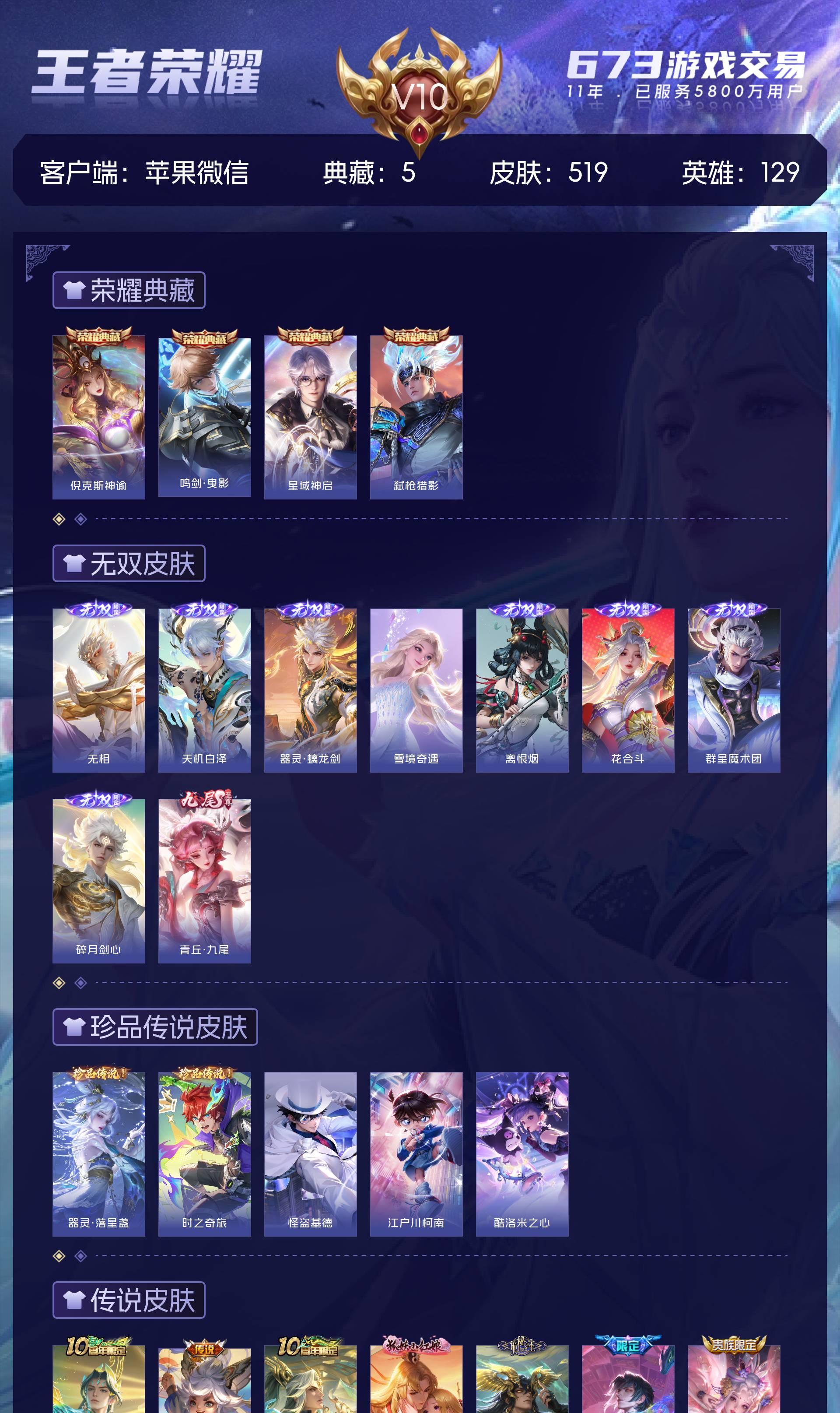 苹果微/无双王者/519皮肤/129英雄/4典藏/0珍品无双/9无双/5珍品传说/60传说/161
