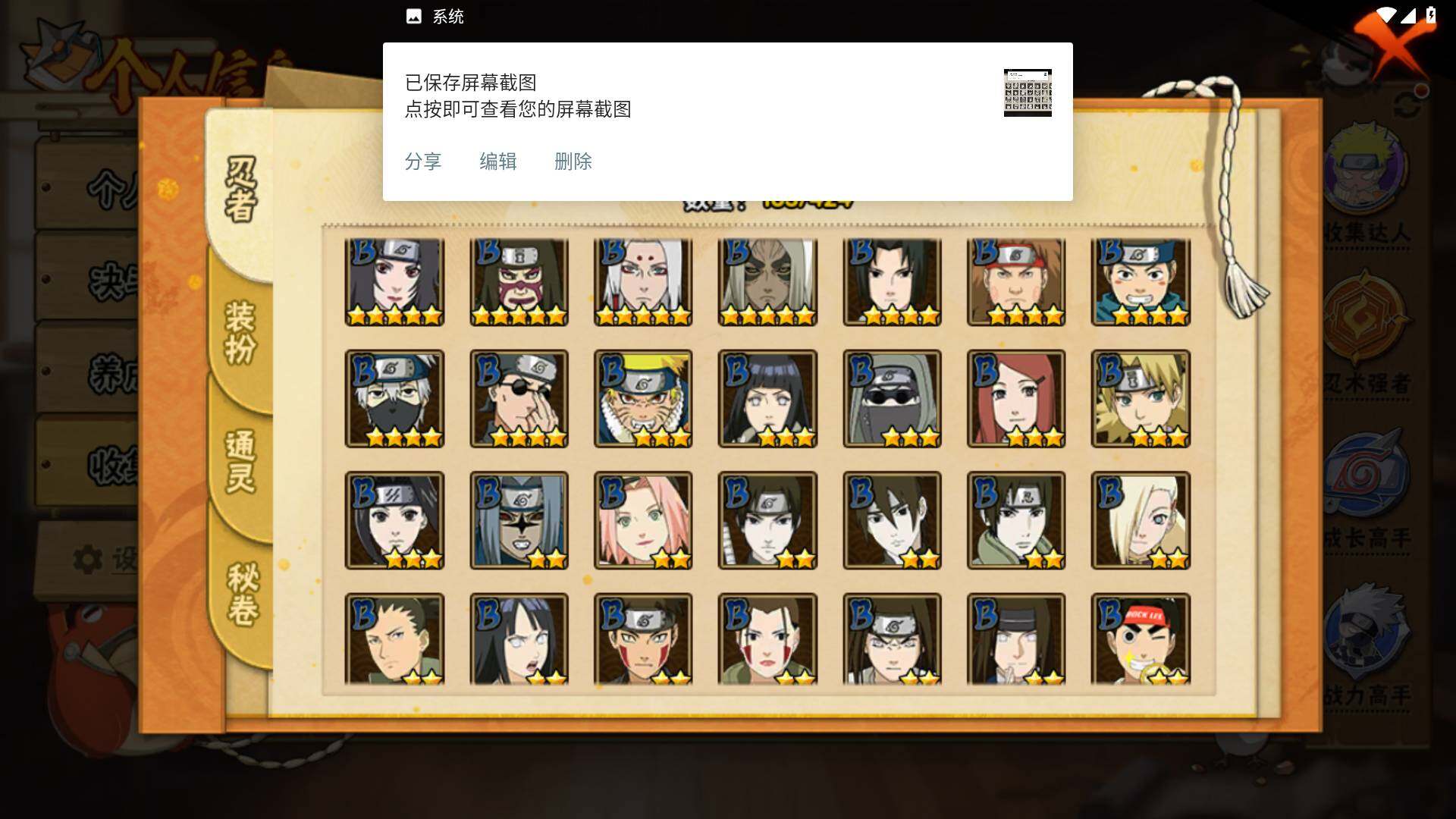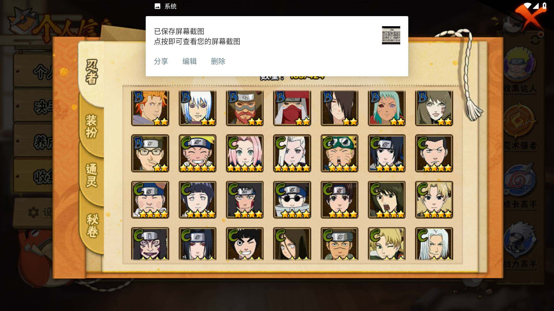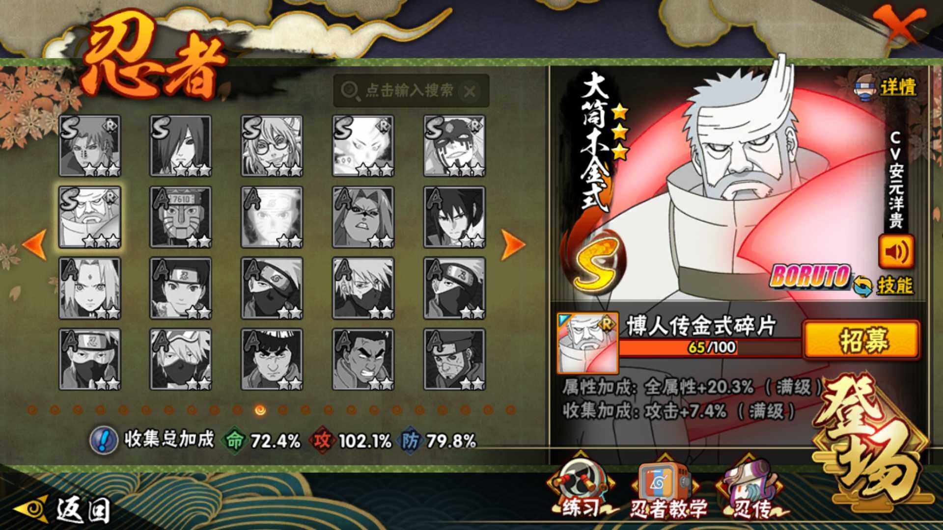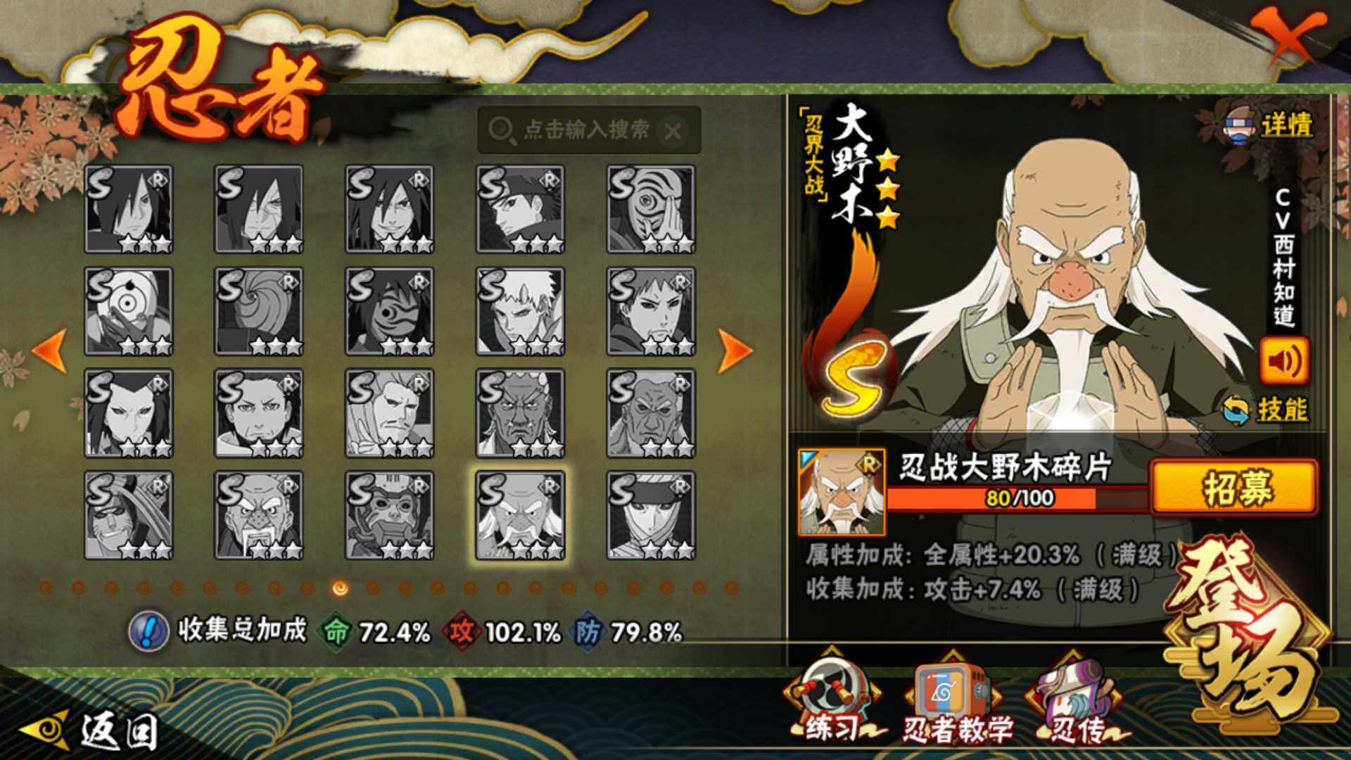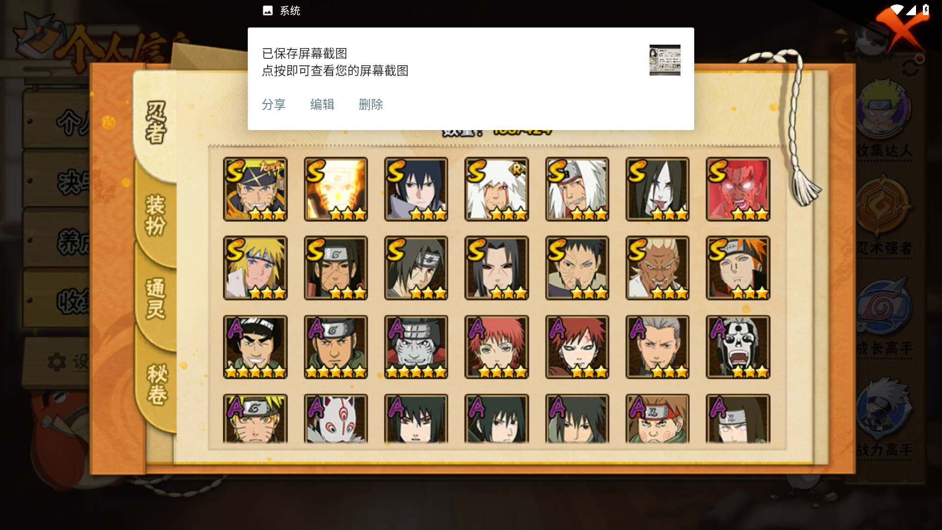 【S级忍者】:千手柱间「秽土转生」(3星),宇智波鼬「秽土转生」(3星),宇智波带土「忍界大战」(3星),艾「忍界大战」(3星),宇智波鼬「须佐能乎」(3星),自来也「舞之豪杰」(3星),大蛇丸(3星),自来也「传说中的三忍」(3星),波风水门(3星