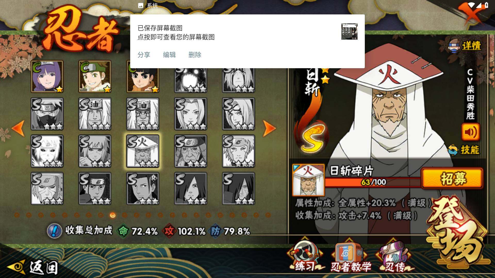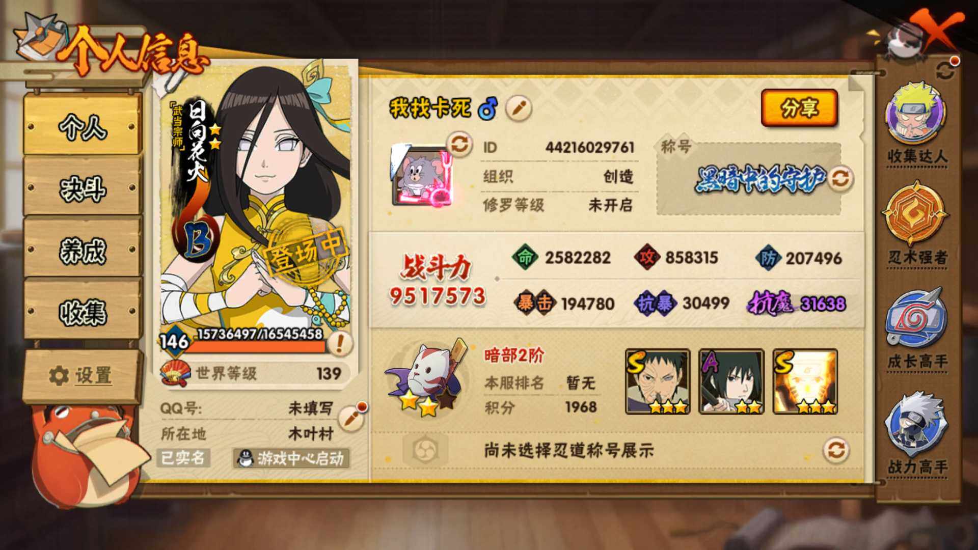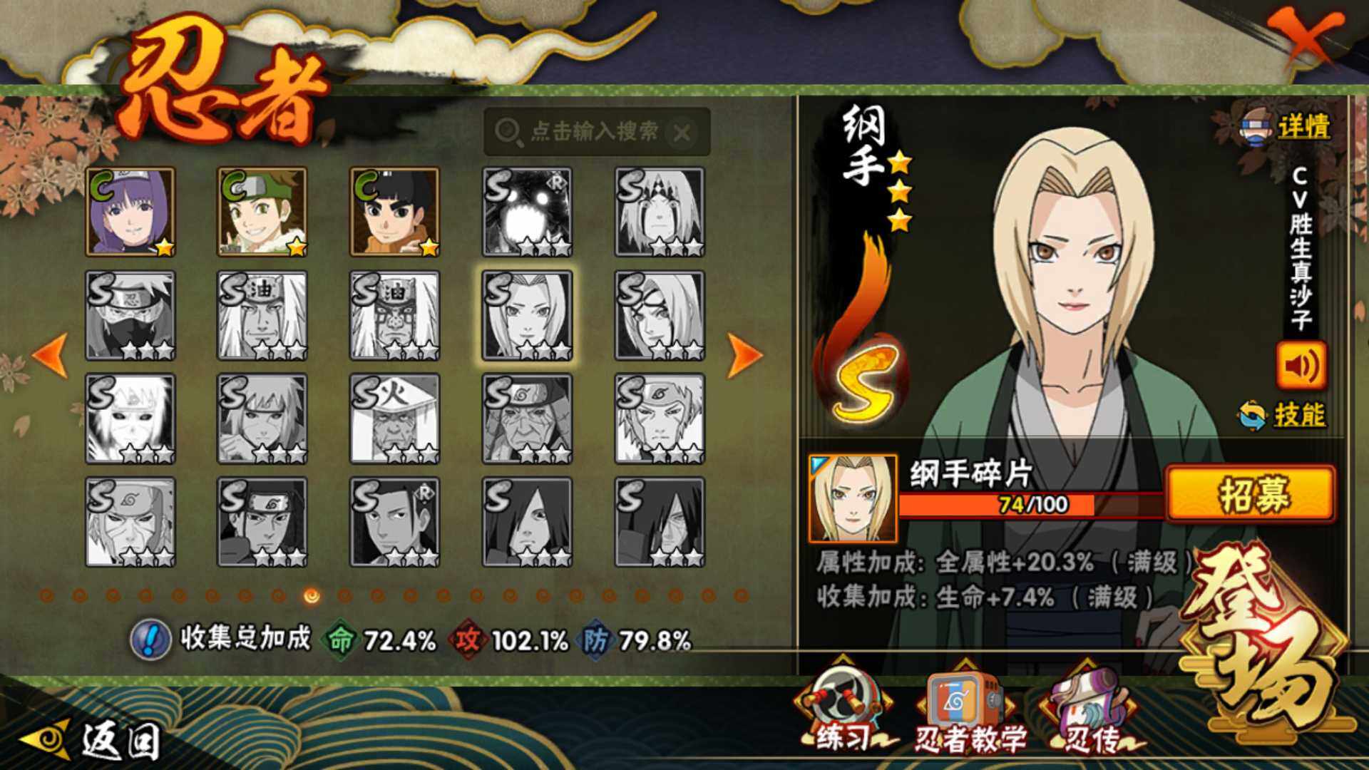 可免费转苹果 v7 951万战力 14S 29A 纲手74片 九水门71片 日斩63片 创立版75片 忍战大野木80片 传金氏65片 zp3468