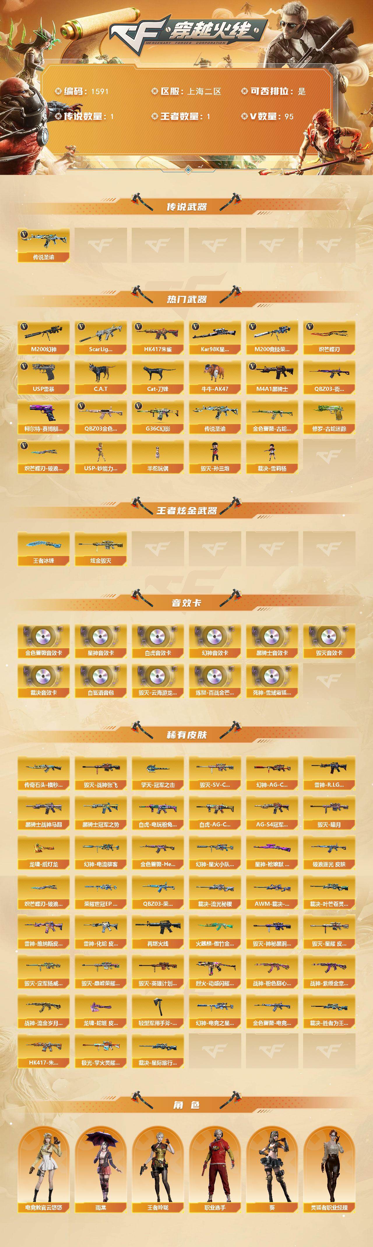 【热门武器】:传说圣谕,G36C-幻影,QBZ03-金色蔷薇,Scar Light-白虎,HK417-朱雀,M200-幻神*2,金色蔷薇-古蛇迷踪,修罗-古蛇迷踪,M200-竞技荣光,QBZ03-街机,Kar98K-星神,C.A.T,Cat-刀锋,牛牛-AK47,M4A1-黑骑士,USP-钞能力灵狐,羊驼玩偶,毁灭-孙三炮*2