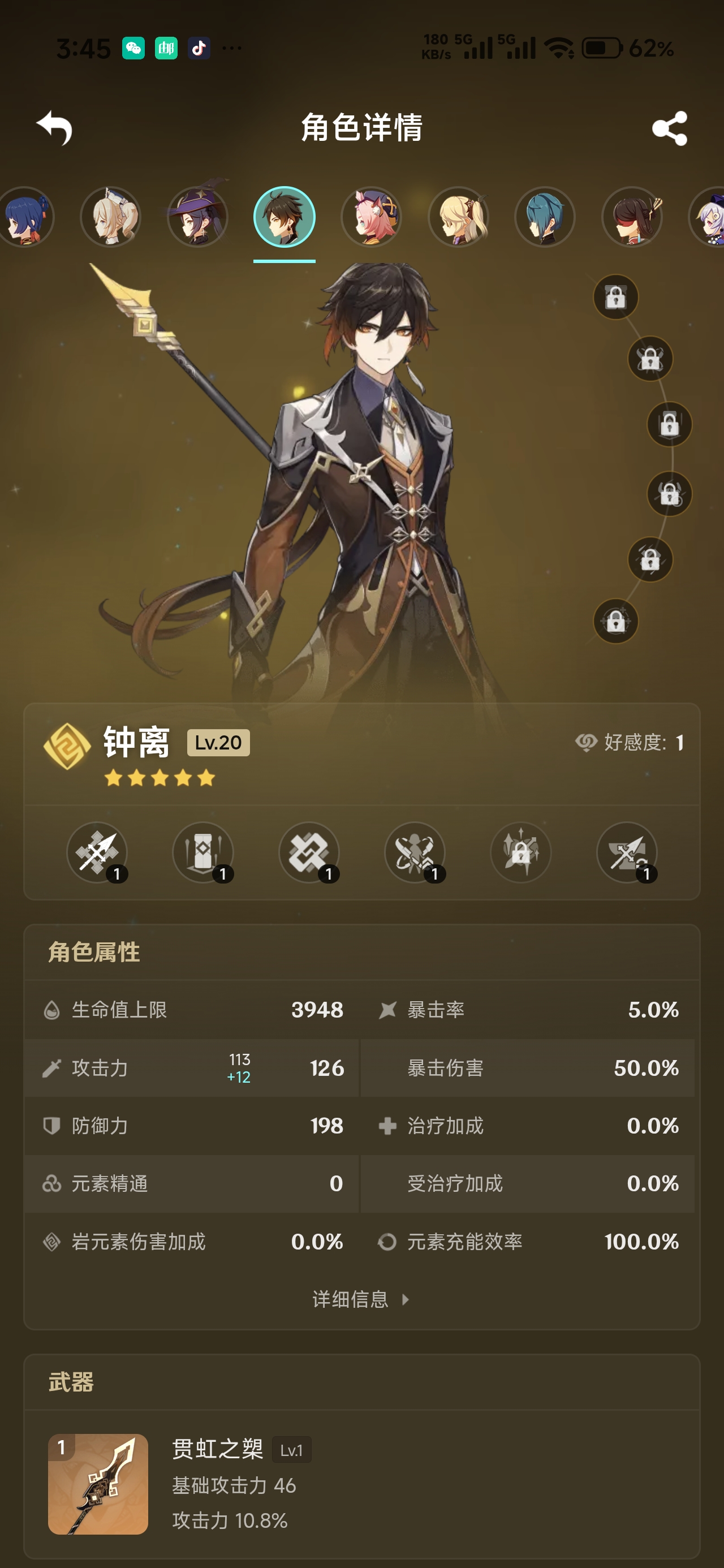 钟离带专武,六个金探索度高。