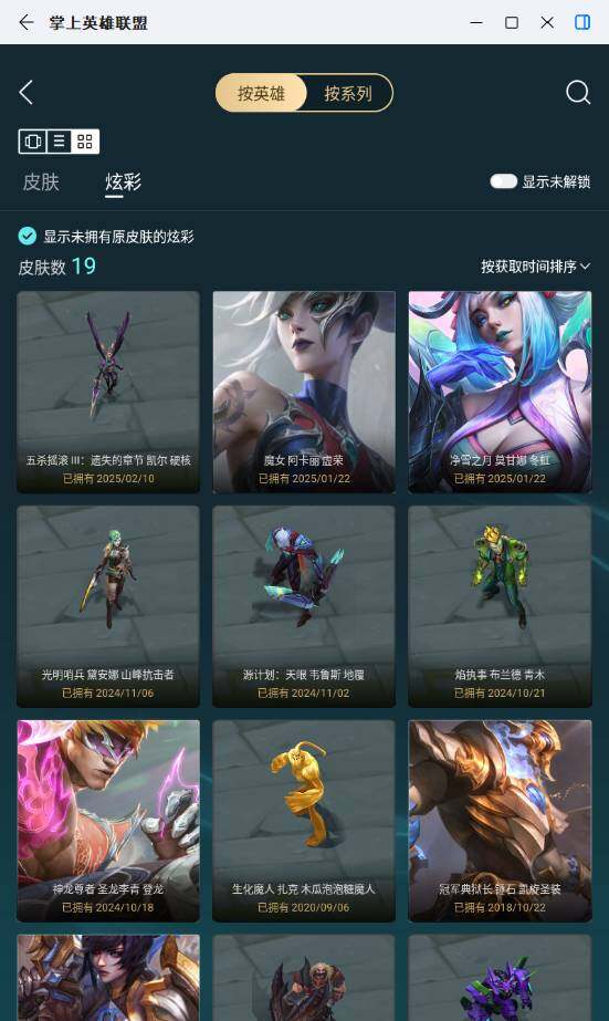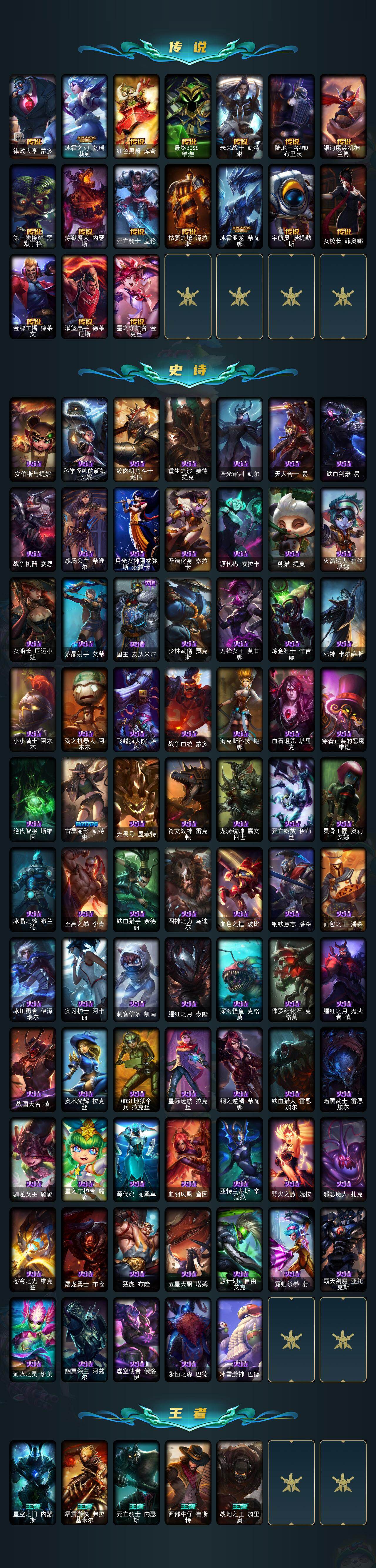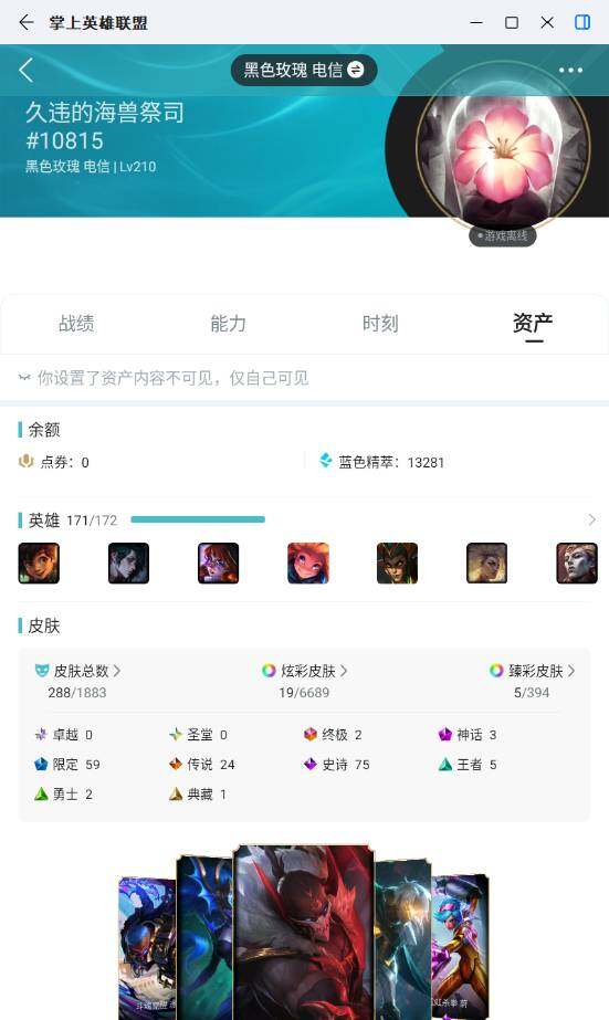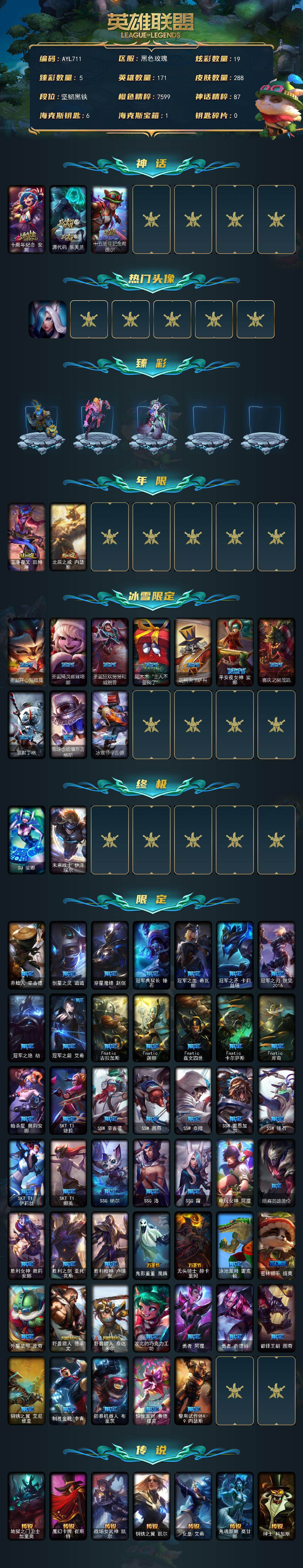 未定级段位-171英雄-288皮肤-19炫彩-2终极-3神话-59限定-24传说-75史诗