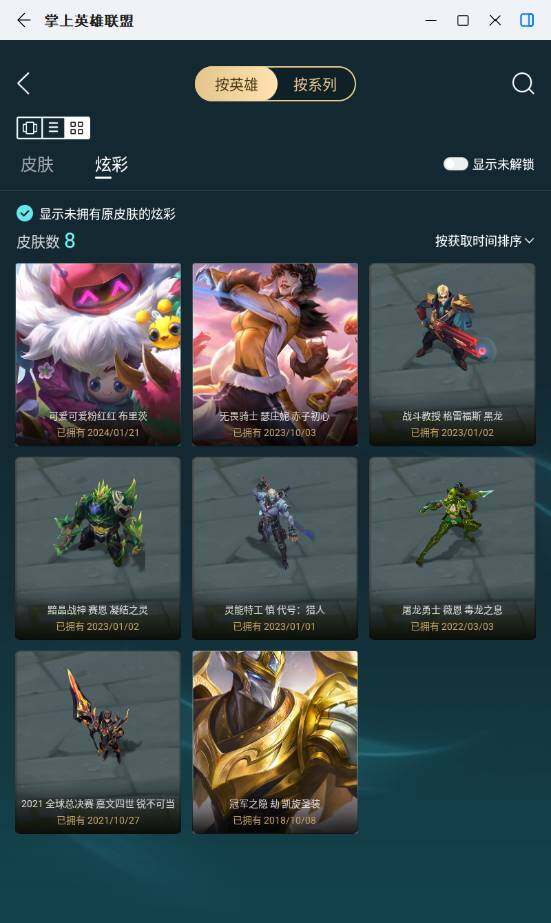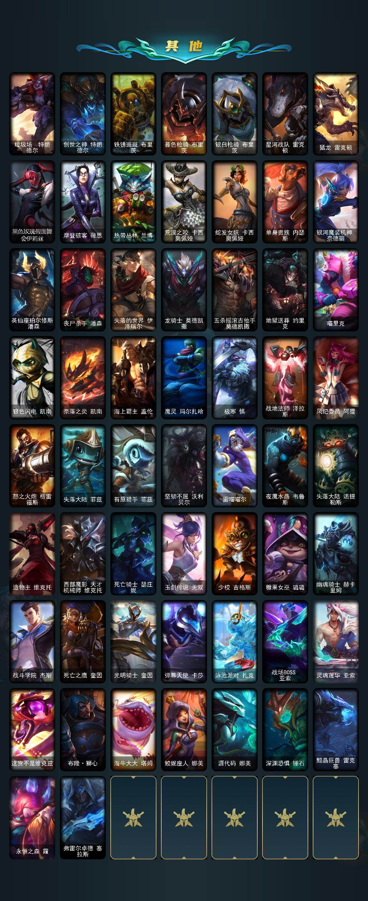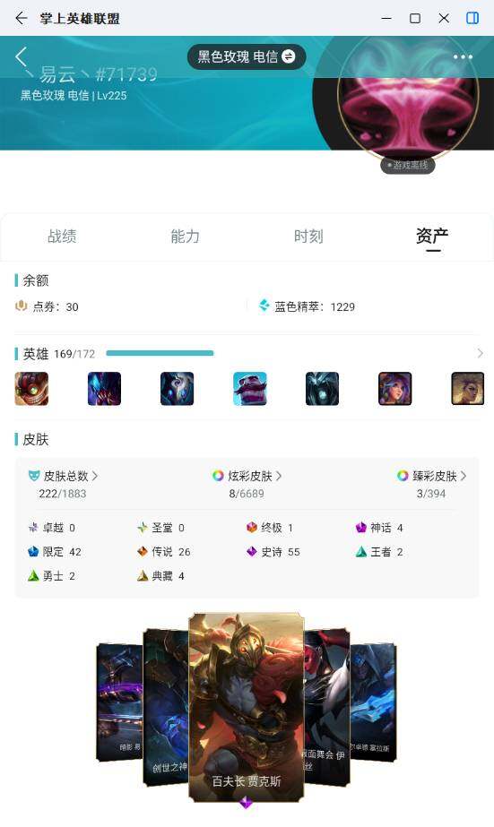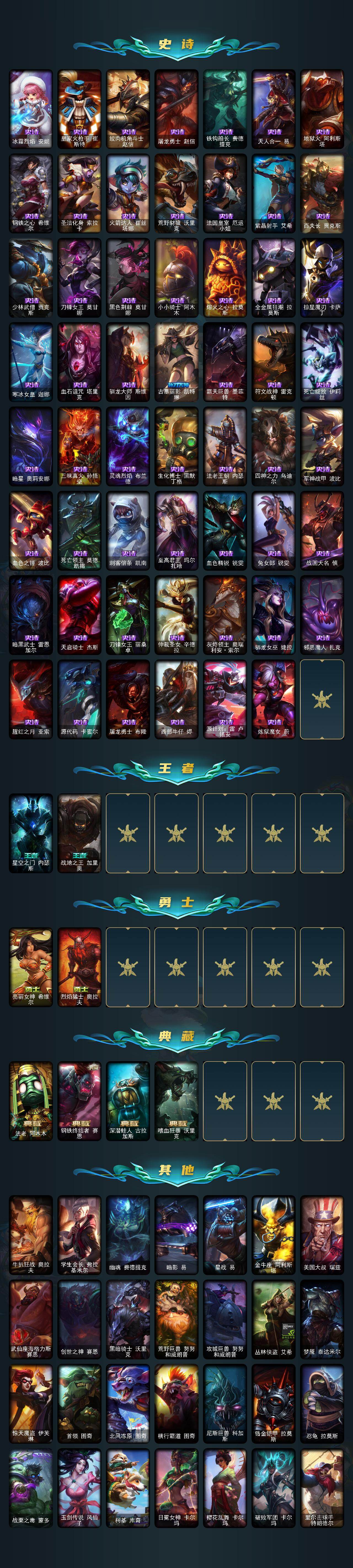 未定级段位-169英雄-222皮肤-8炫彩-1终极-4神话-42限定-26传说-55史诗