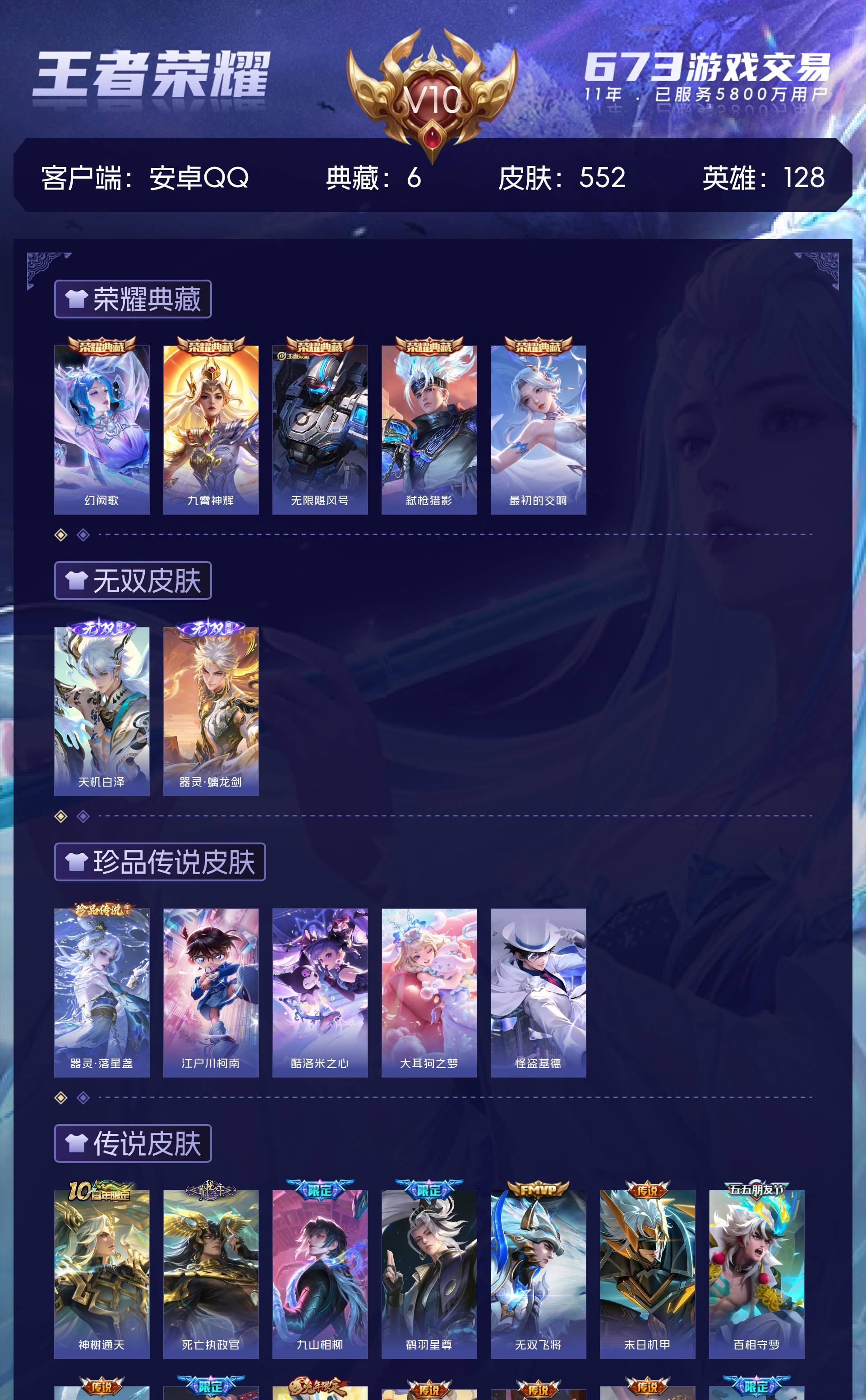 安卓QQ/荣耀王者/552皮肤/128英雄/5典藏/0珍品无双/2无双/5珍品传说/78传说/170