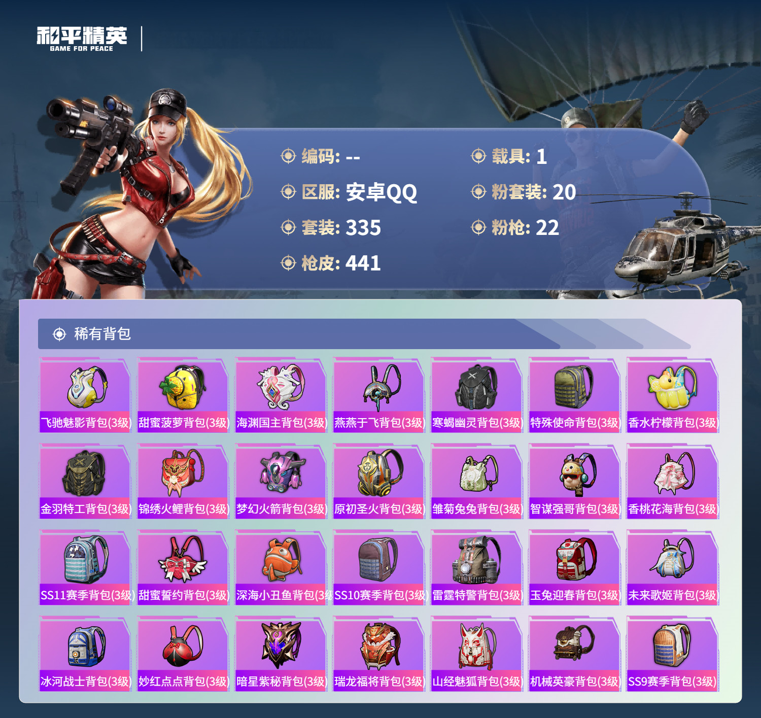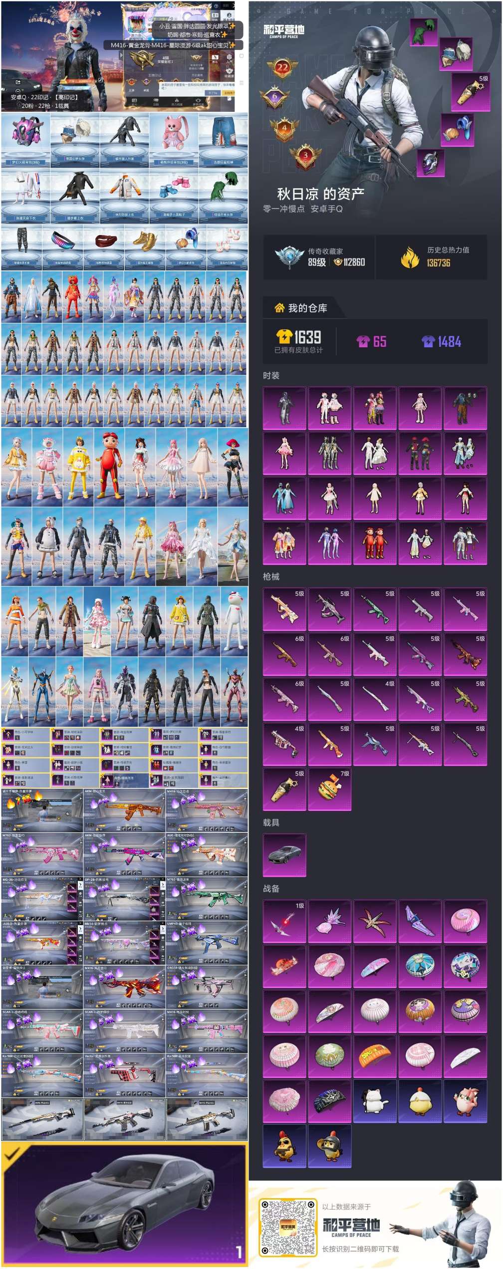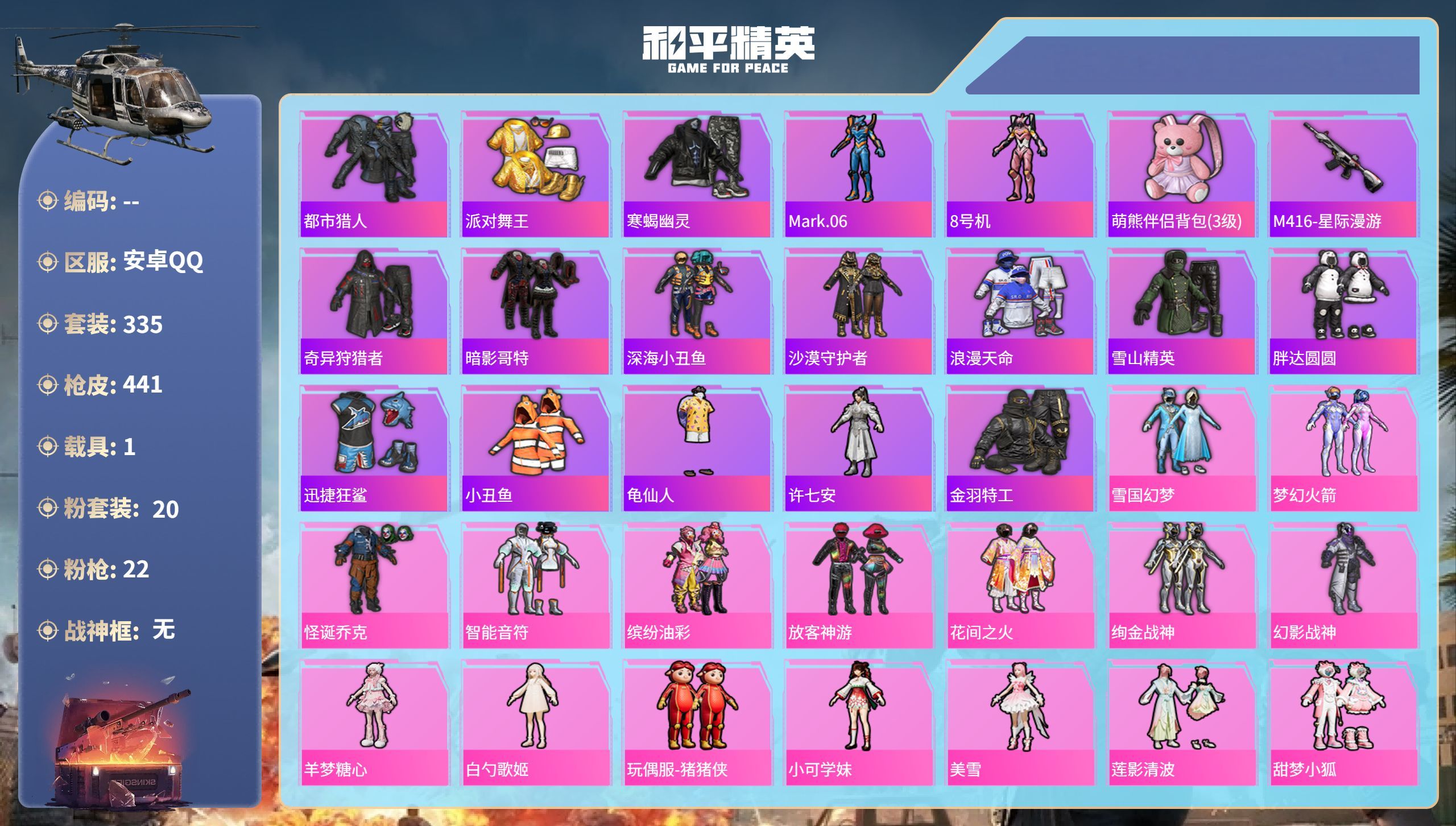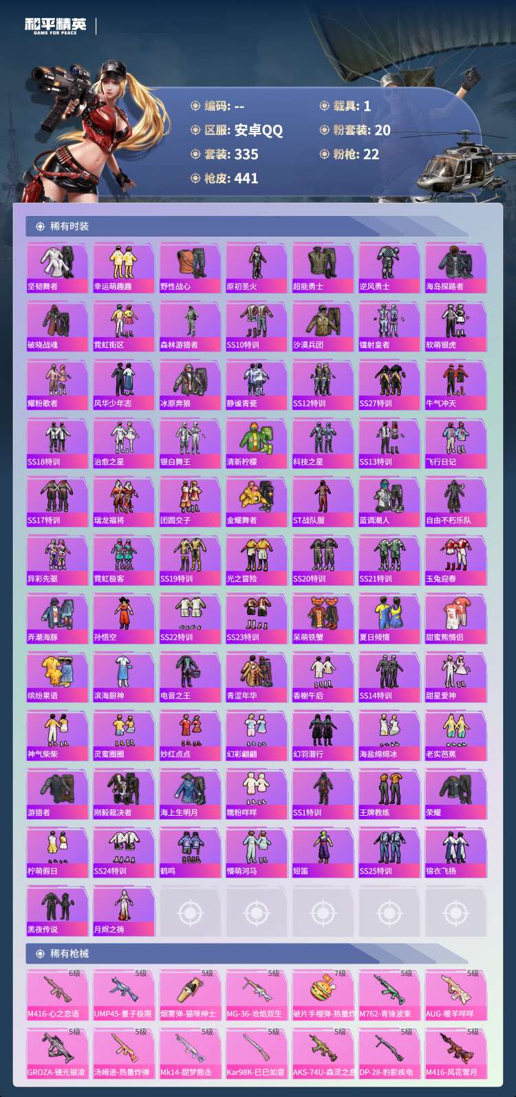 hs60713安卓手Q-22王牌印记-20粉装-22特效枪-1载具-136736热力值-335套装-