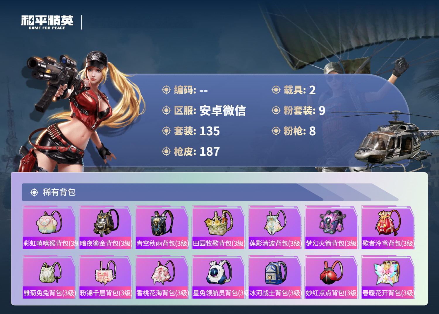 hs61034安卓微-8王牌印记-9粉装-8特效枪-2载具-62459热力值-135套装-187枪