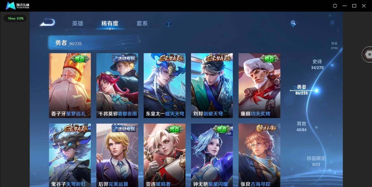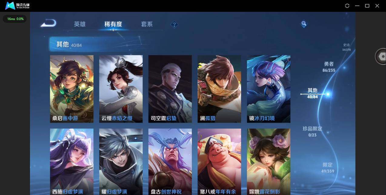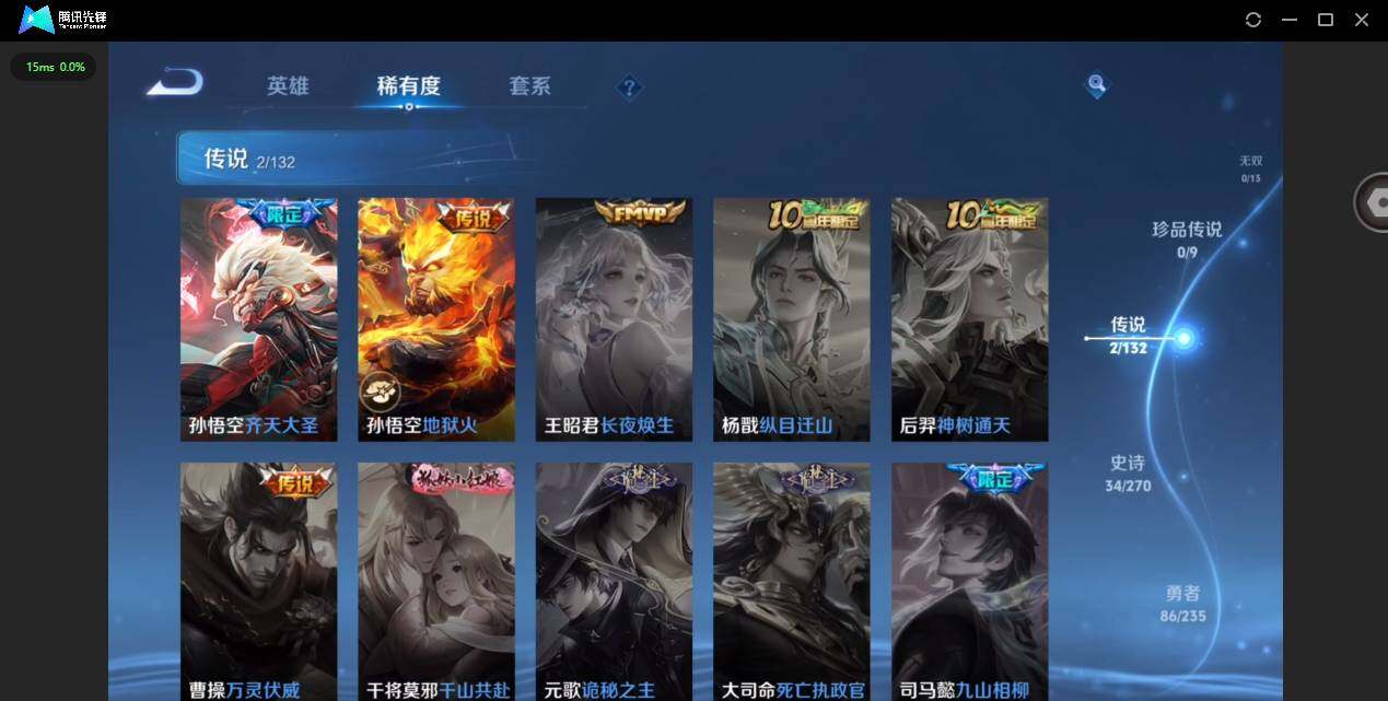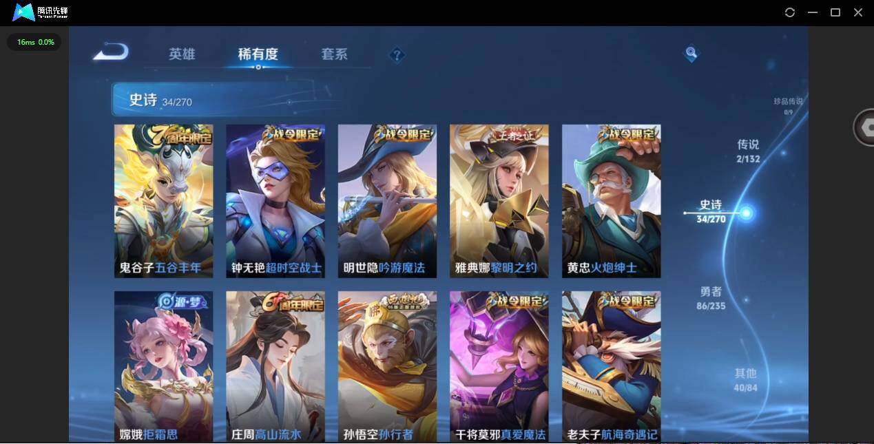 实名: 可修改 贵族等级: V7 英雄数: 125 皮肤数: 163 荣耀水晶: 全息碎影 星传说: 幽冥火 传说皮: 地狱火 限定皮: 梁祝,岱宗,青龙志,至尊宝,高山流水,孙行者,五谷丰年,齐天大圣