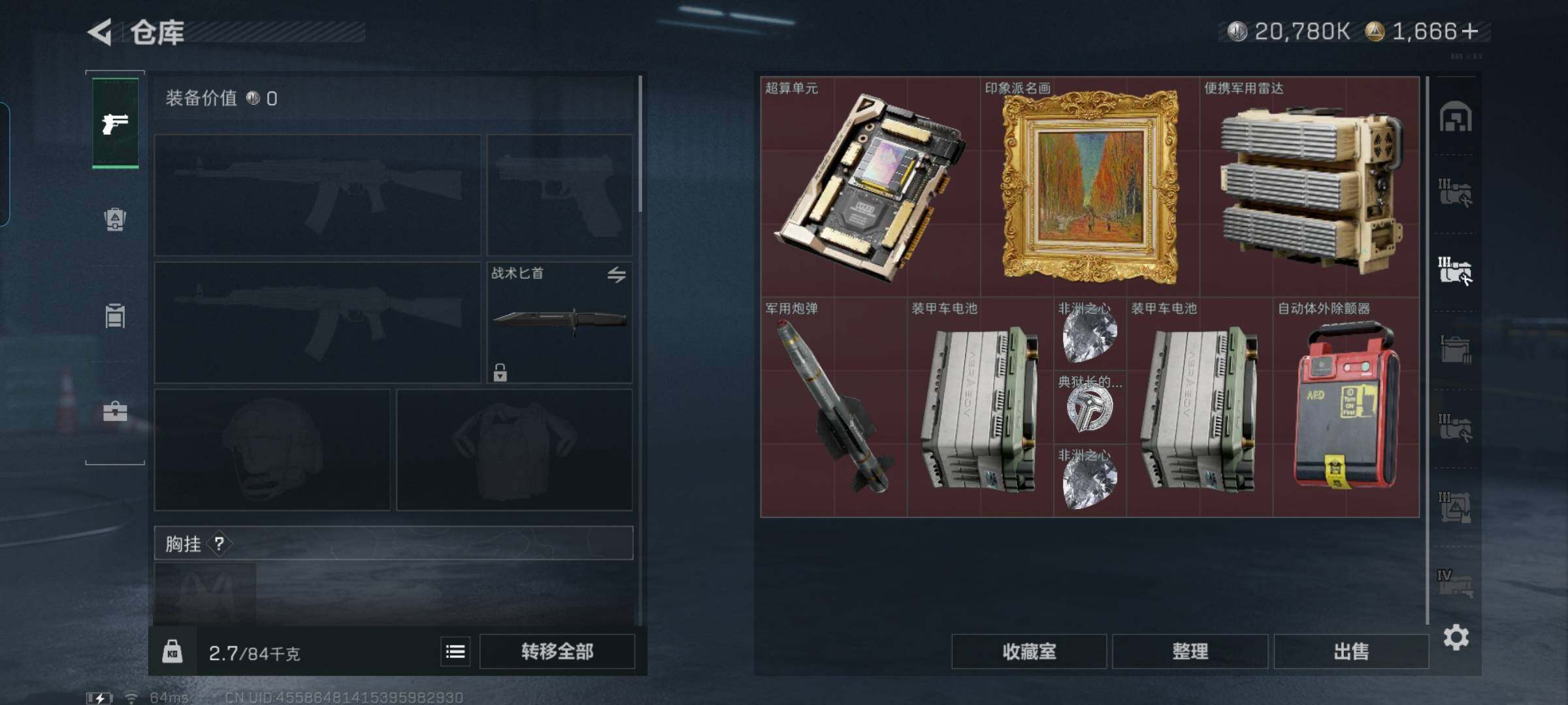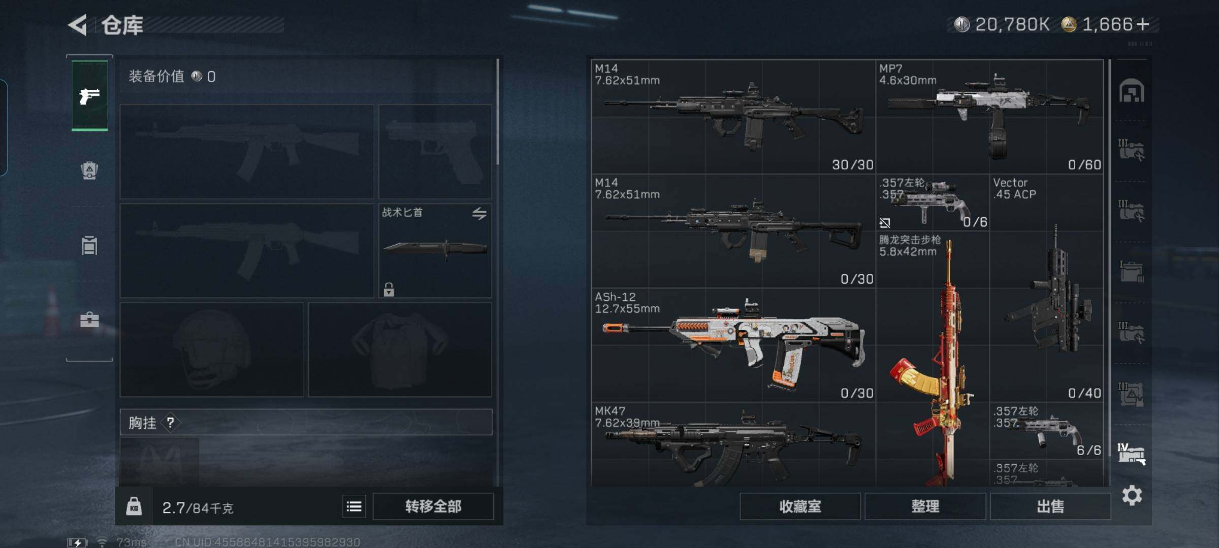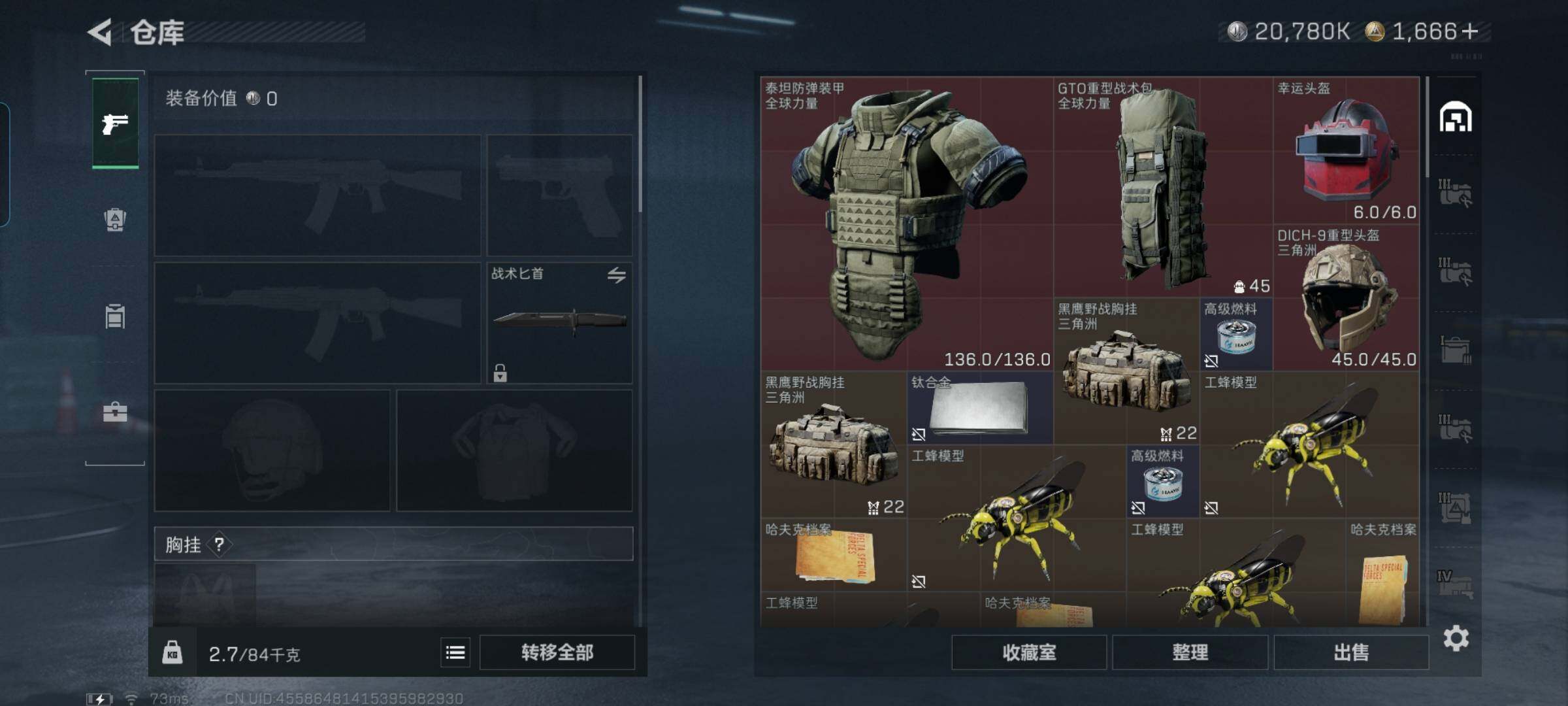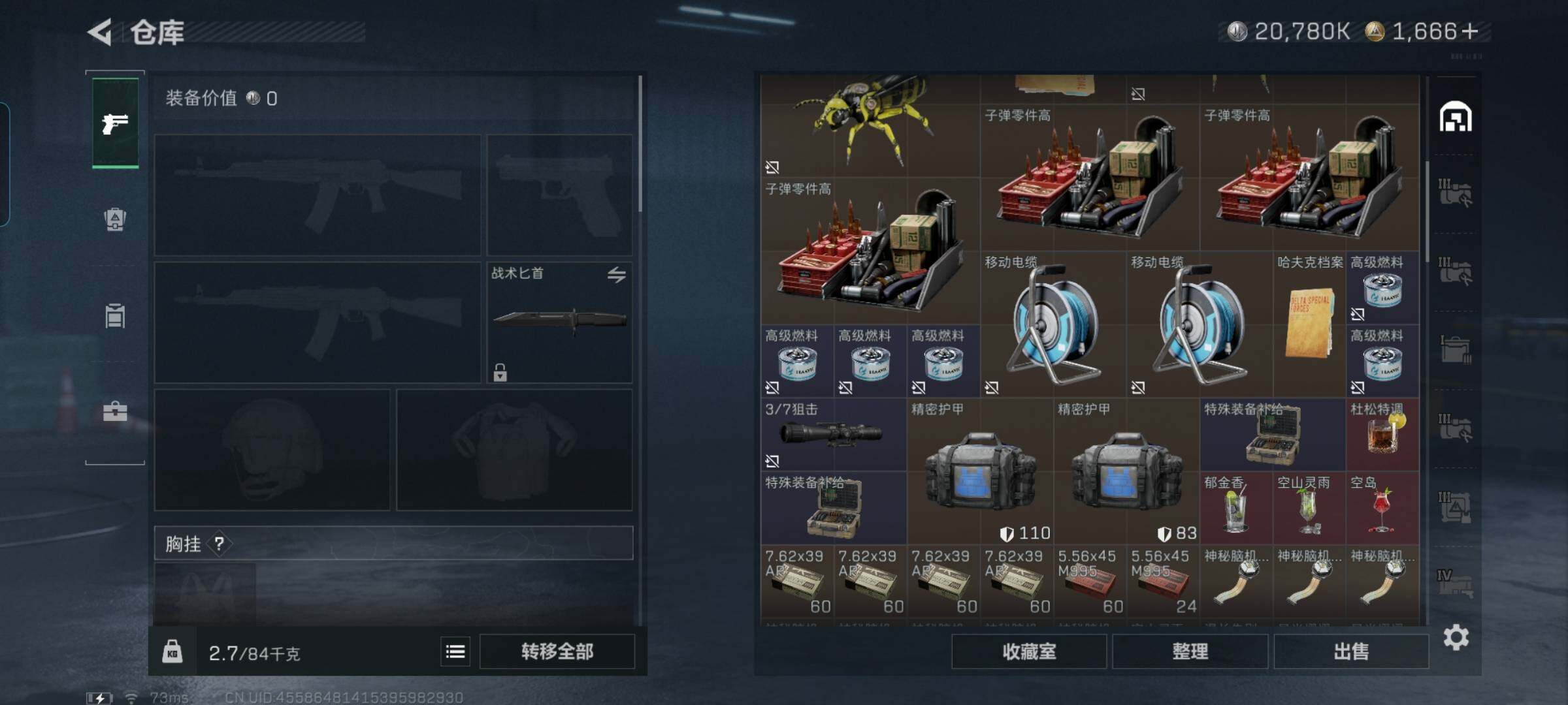 总资产(M):276M/哈夫币(K):20780K/哈夫币(K):20780K/全面战场等级:50_段位:军士长/烽火地带等级:60_段位:黑鹰/红狼-电锯惊魂/近战-黑鹰/M4A1突击步枪-蚀金玫瑰/M4A1突击步枪-阿米娅/ASh-12战斗步枪-鹅鸭杀/AK-12突击步枪-特斯拉线圈/SCAR-H战斗步枪-启航/G3战斗步枪-骑士/CAR-15突击步枪-阿米娅/腾龙突击步枪-捞点薯条/KC1