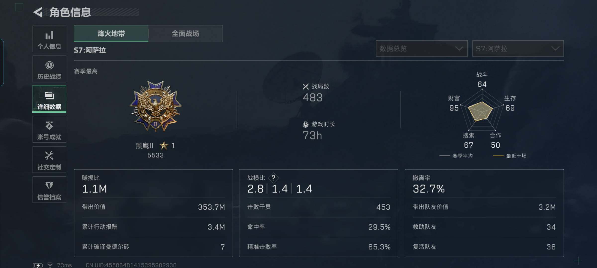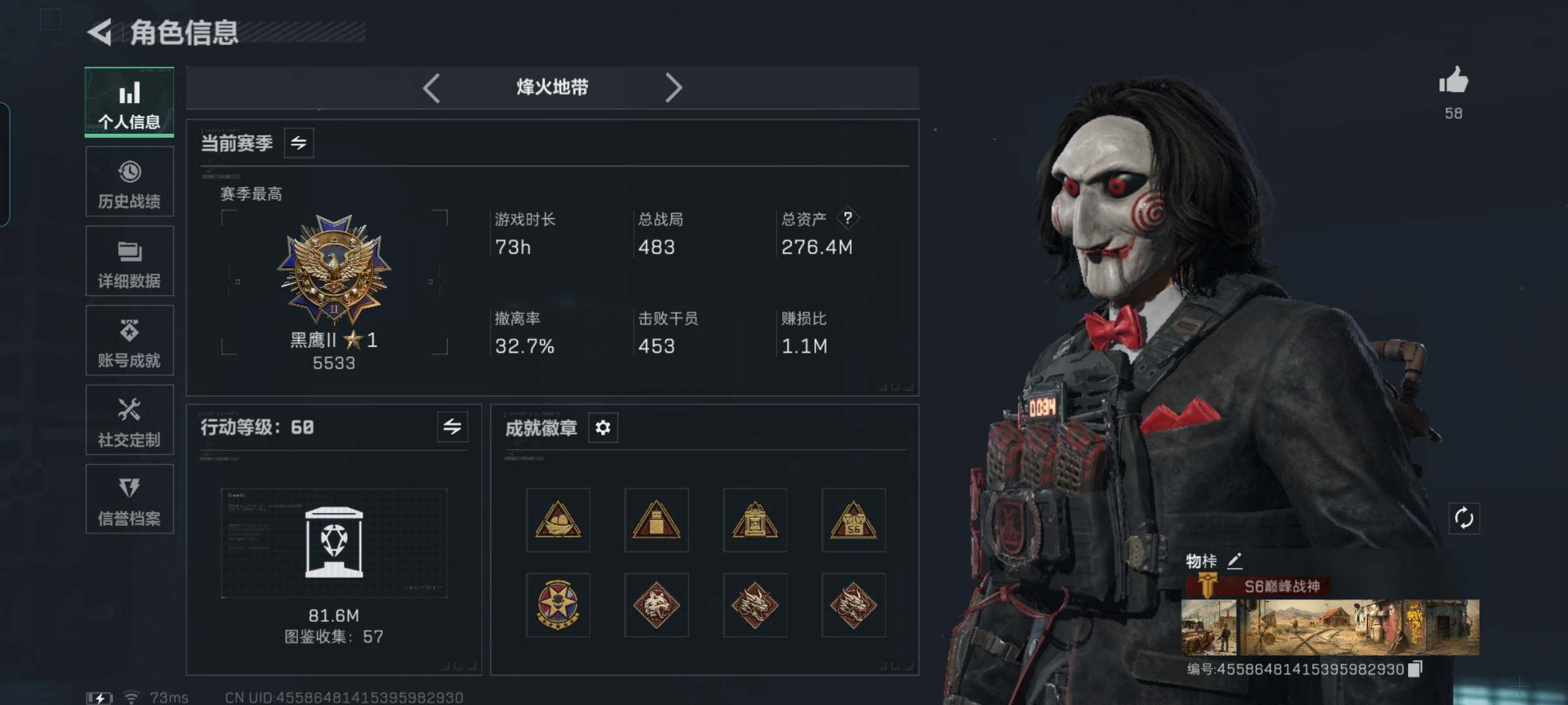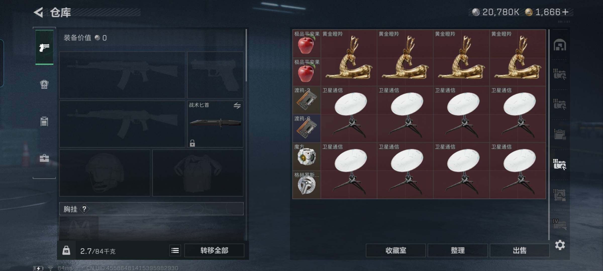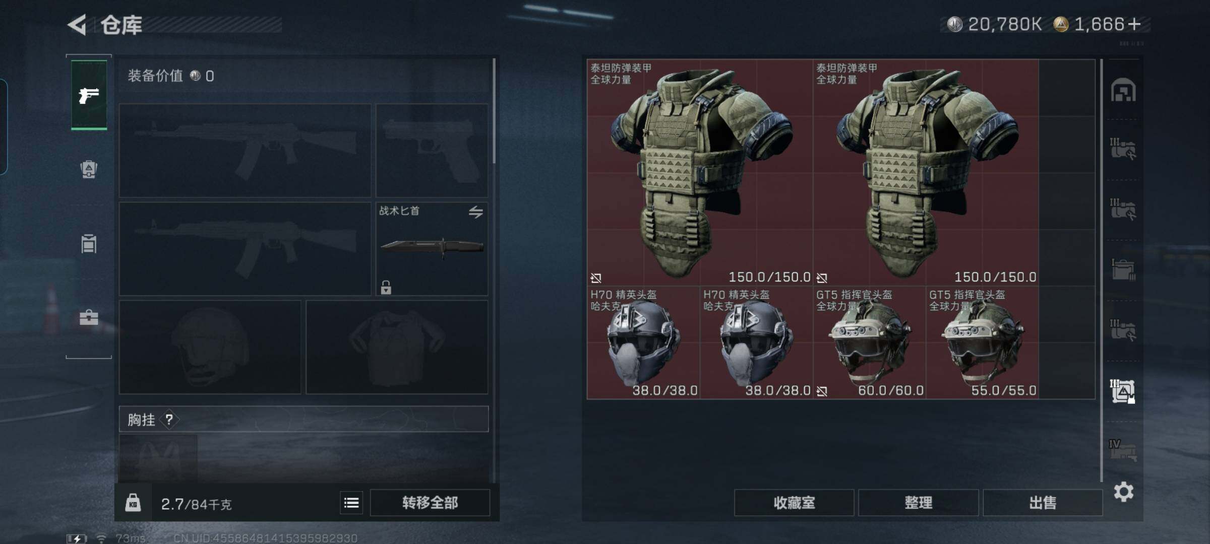 总资产(M):276M/哈夫币(K):20780K/哈夫币(K):20780K/全面战场等级:50_段位:军士长/烽火地带等级:60_段位:黑鹰/红狼-电锯惊魂/近战-黑鹰/M4A1突击步枪-蚀金玫瑰/M4A1突击步枪-阿米娅/ASh-12战斗步枪-鹅鸭杀/AK-12突击步枪-特斯拉线圈/SCAR-H战斗步枪-启航/G3战斗步枪-骑士/CAR-15突击步枪-阿米娅/腾龙突击步枪-捞点薯条/KC1