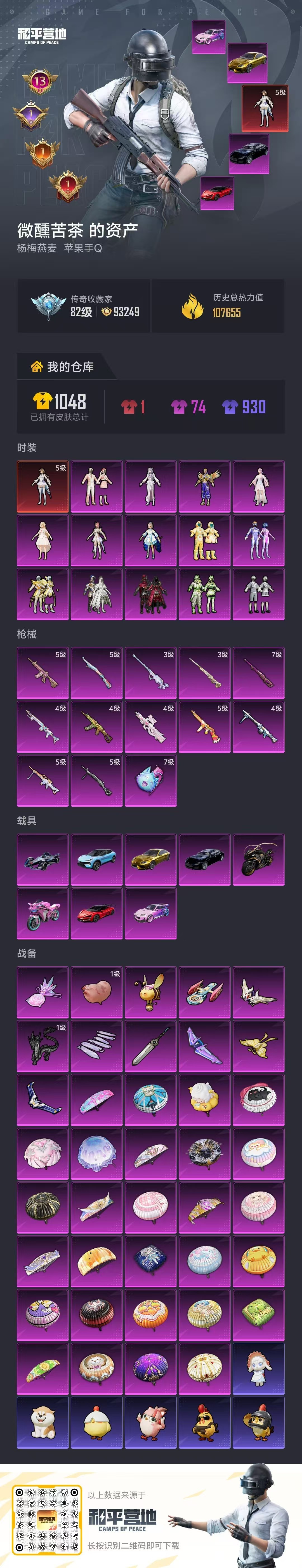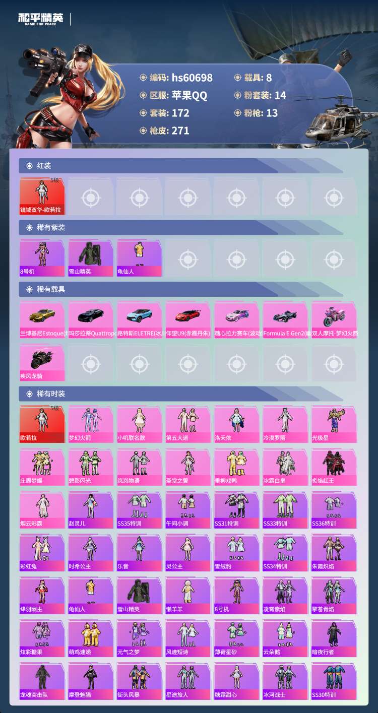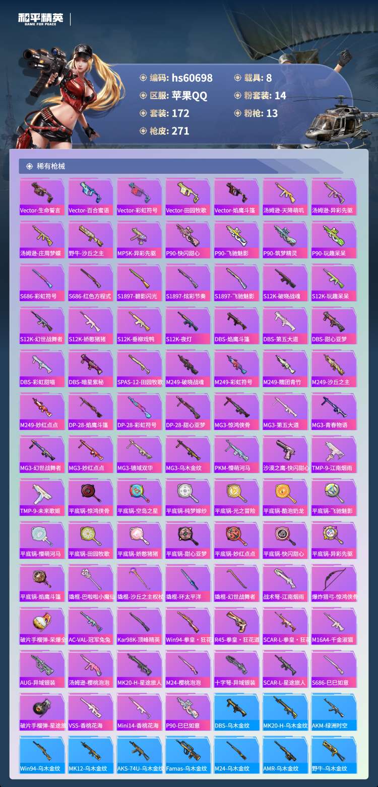 hs60698苹果手Q-13王牌印记-1红装-14粉装-13特效枪-8载具-107655热力值-17