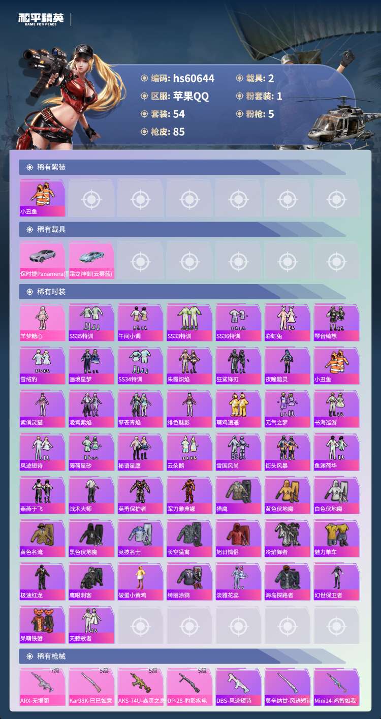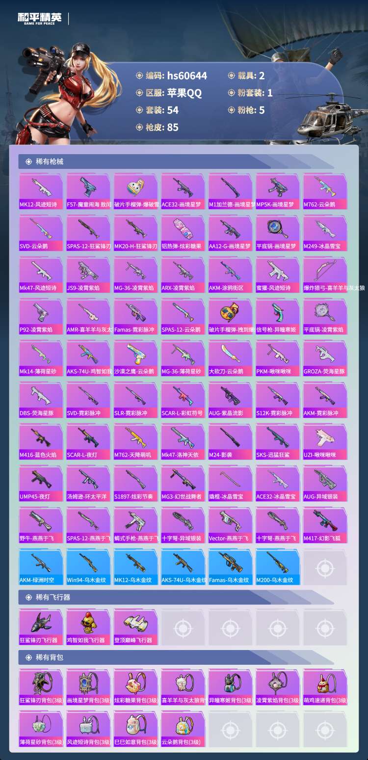 hs60644 苹果手Q-2王牌印记-1粉装-5特效枪-2载具-26224热力值-54套装-85枪皮