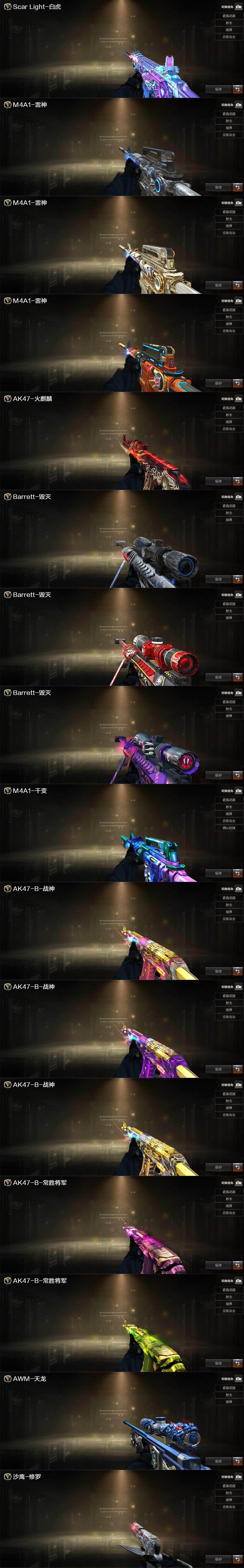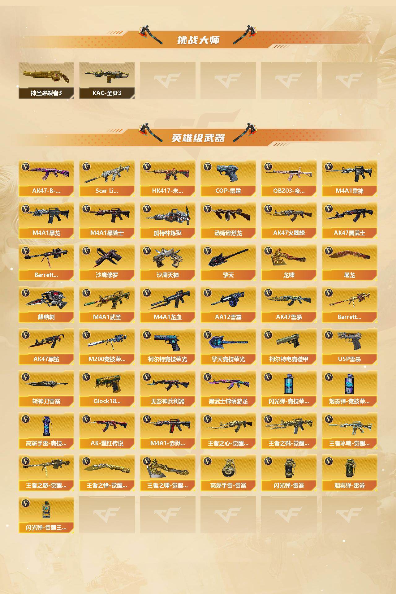 【热门武器】:QBZ03-金色蔷薇,Scar Light-白虎,HK417-朱雀,M200-竞技荣光,死亡之眼,M4A1-黑骑士,汤姆逊-烈龙*6,加特林-炼狱*5,斯泰尔-蝴蝶,MK5-炽火炎龙,羊驼玩偶,裁决-雪莉杨,COP-白鲨*2,USP-雷暴*2,沙鹰-修罗*3,金刚伞