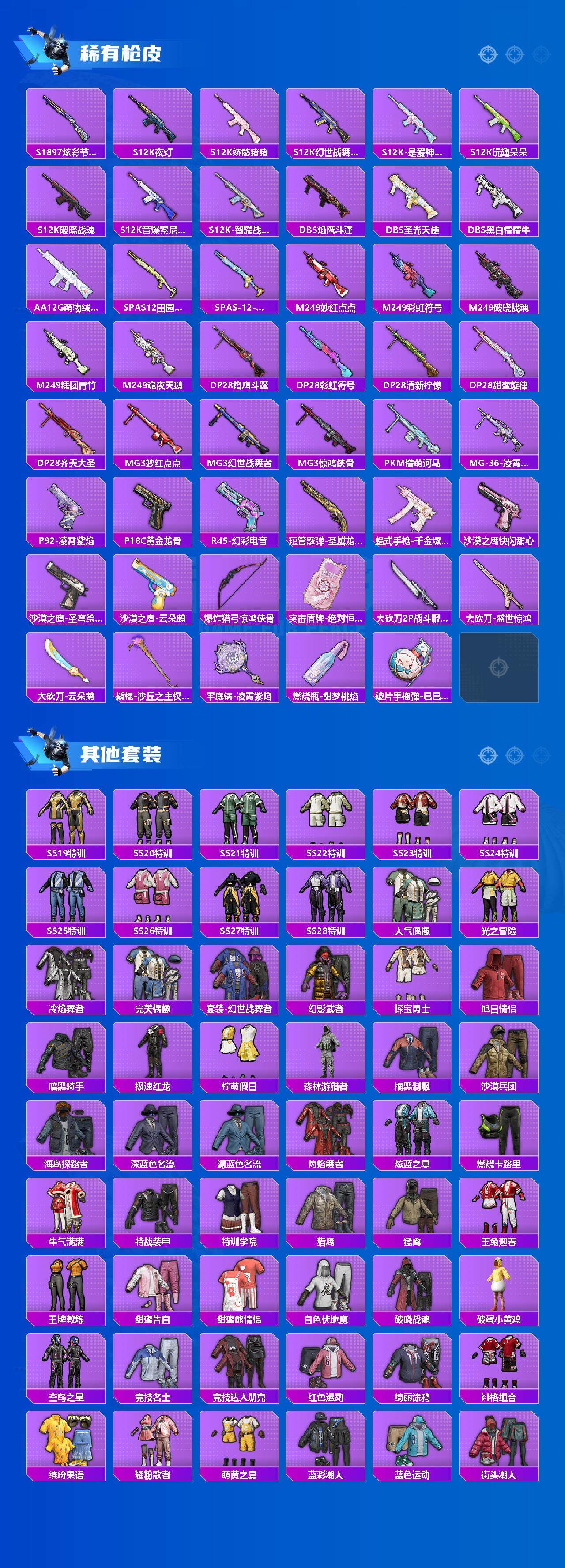 【粉色套装】:粉装-梦幻火箭,粉装-霞光圣骑,粉装-飒粉甜心,角色-圣堂之誓,粉装-霓虹漫游,角色-千金淑猫,粉装-星穹咏叹调,角色-冷漠罗丽,角色-异瞳寒姬