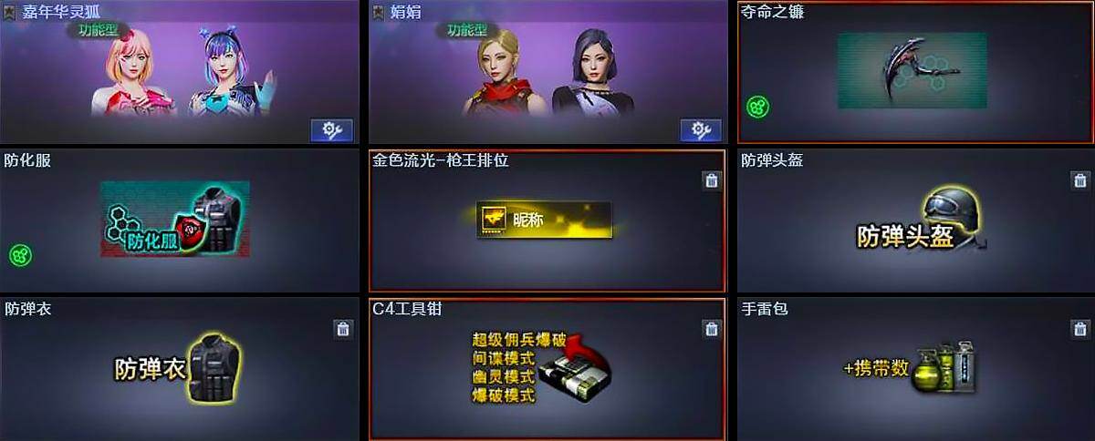 【道具】:夺命之镰,防化服,金色流光-枪王排位,防弹头盔,防弹衣,C4工具钳,手雷包
