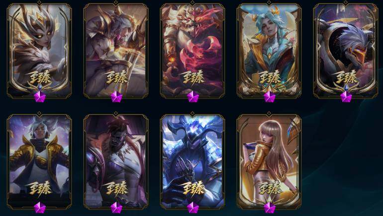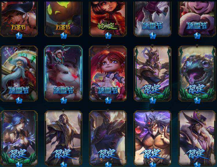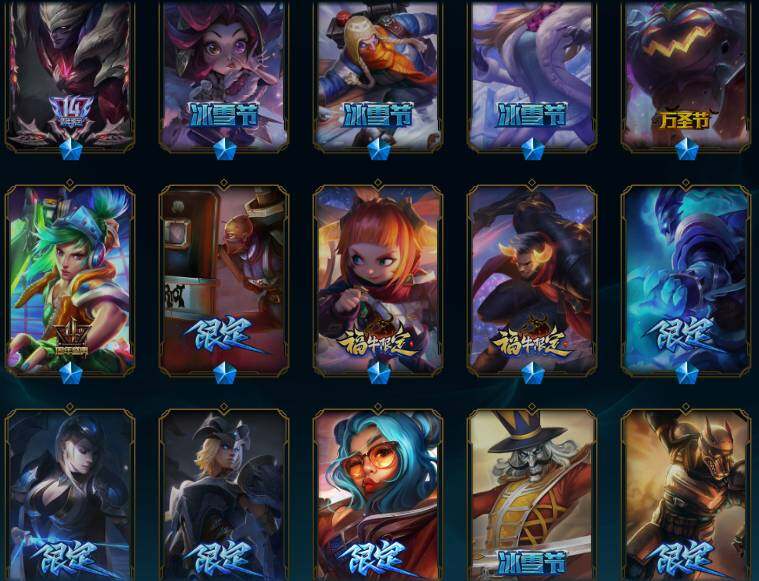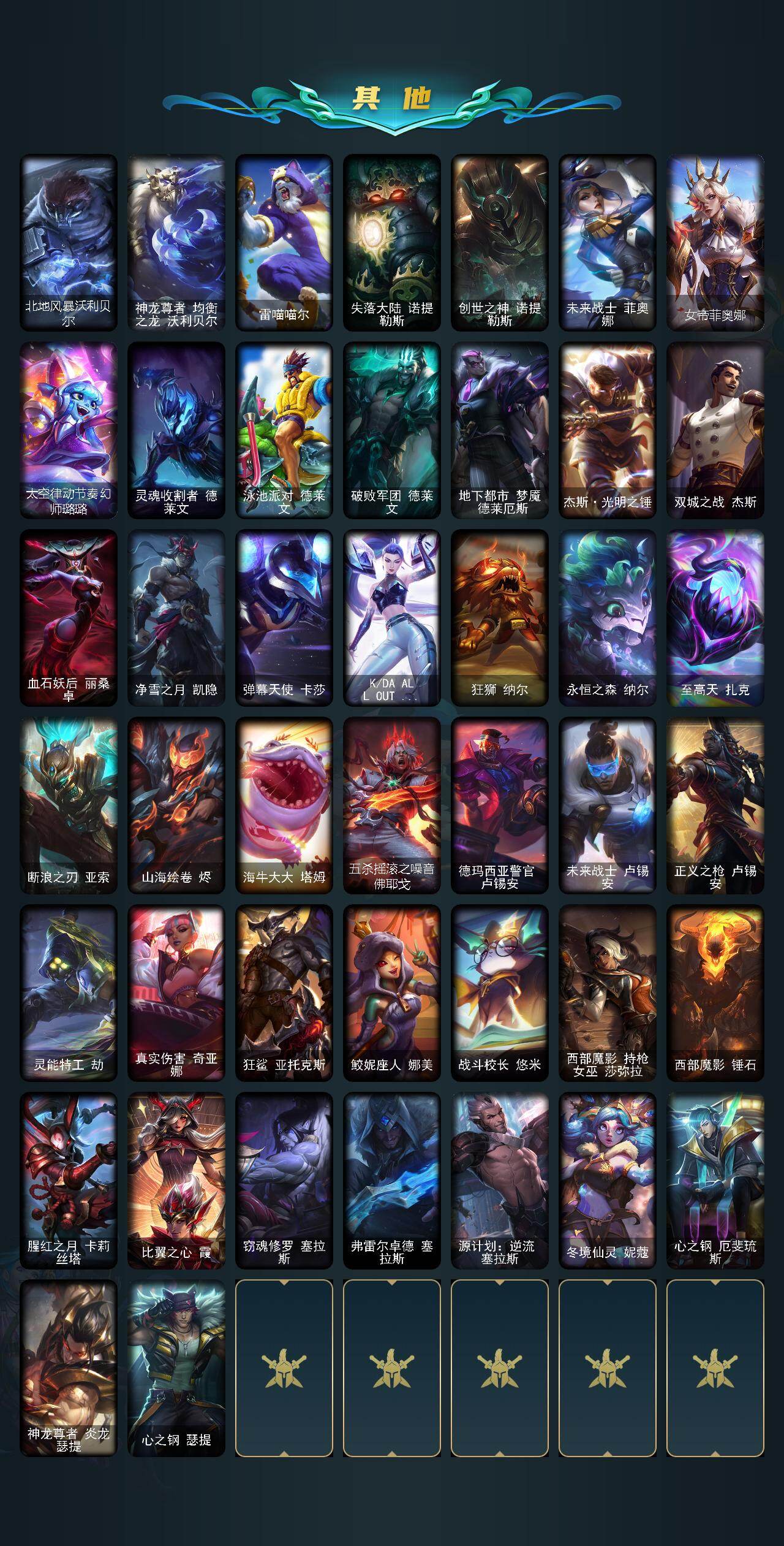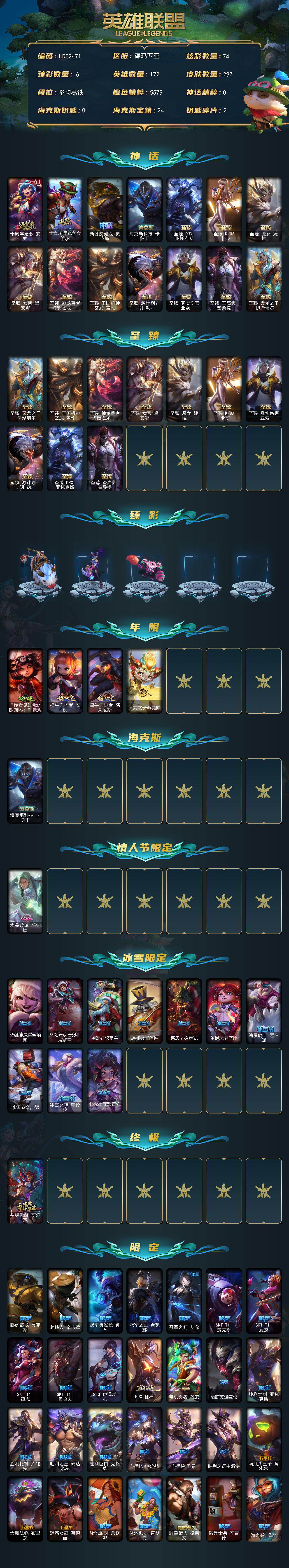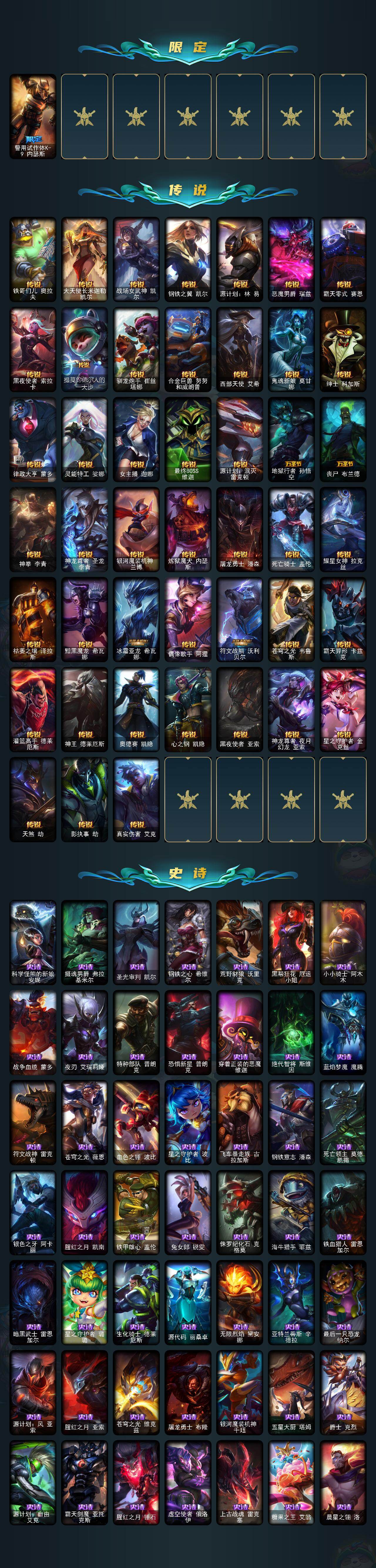172英雄/297皮肤/1终极/14神话/44限定/6臻彩/74炫彩/45传说/49史诗/未定级