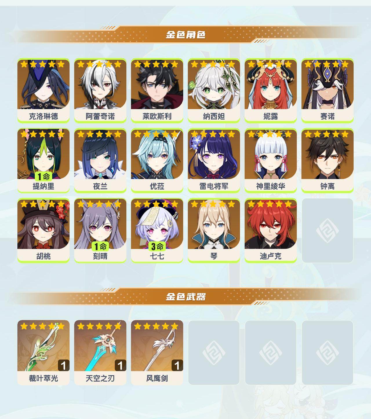 【YSA1048】57级/25黄/女主/17个五星角色/3个五星武器/克洛琳德/夜兰/阿蕾奇诺/钟离/神里绫华/雷电将军/胡桃/纳西妲/妮露/赛诺/1命刻晴/3命七七/优菈/1命提纳里/迪卢克/琴/莱欧斯利/天空之刃/裁叶萃光/风鹰剑
