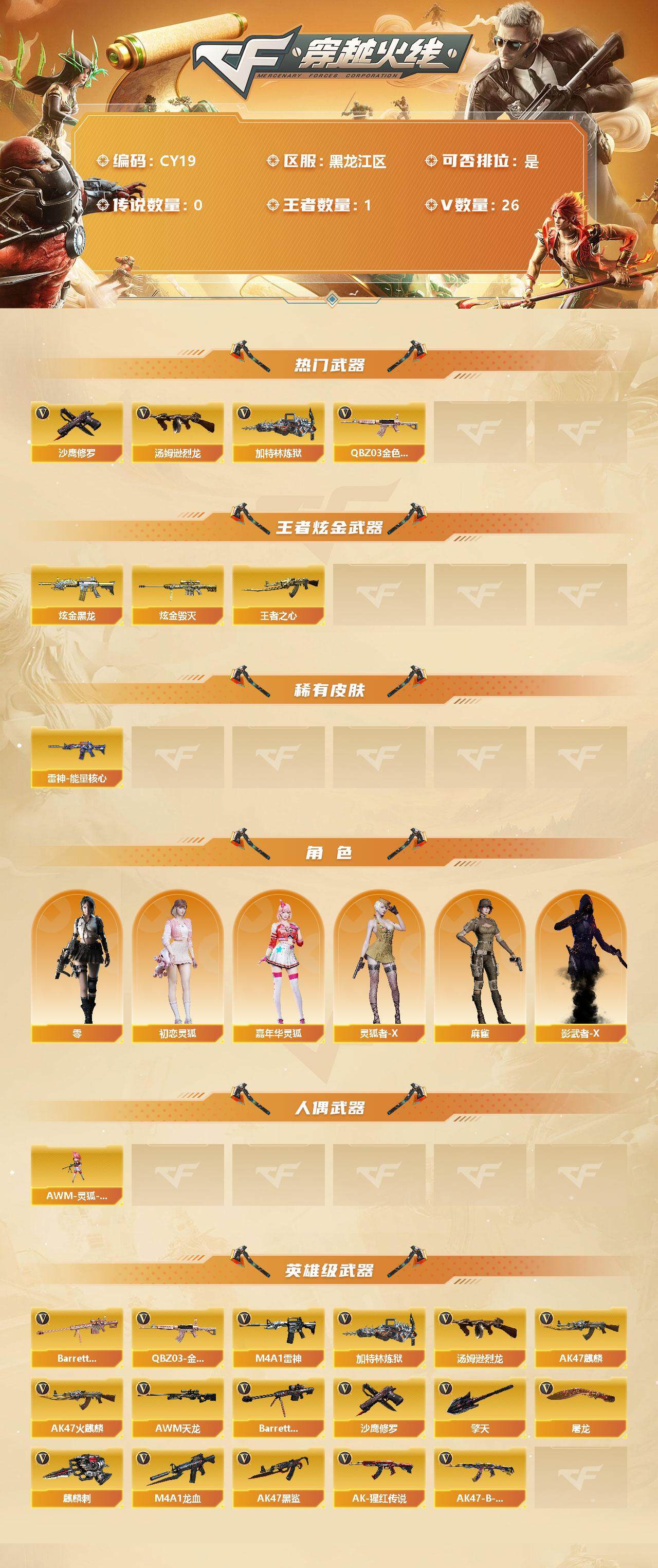 【CY19】账号限制-黑龙江区-26V-1王者-2炫金【热门武器】:QBZ0