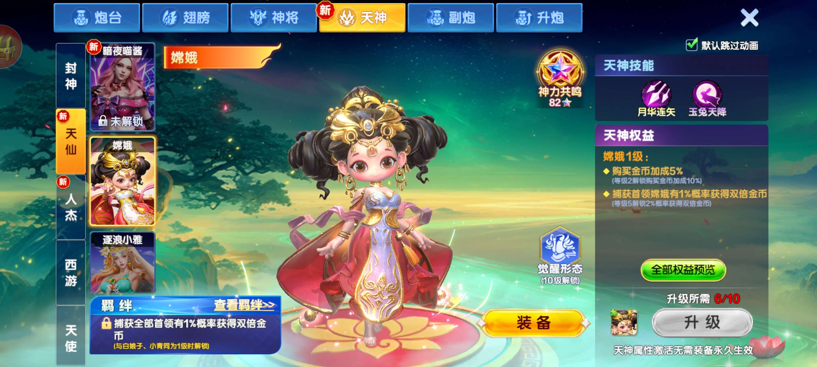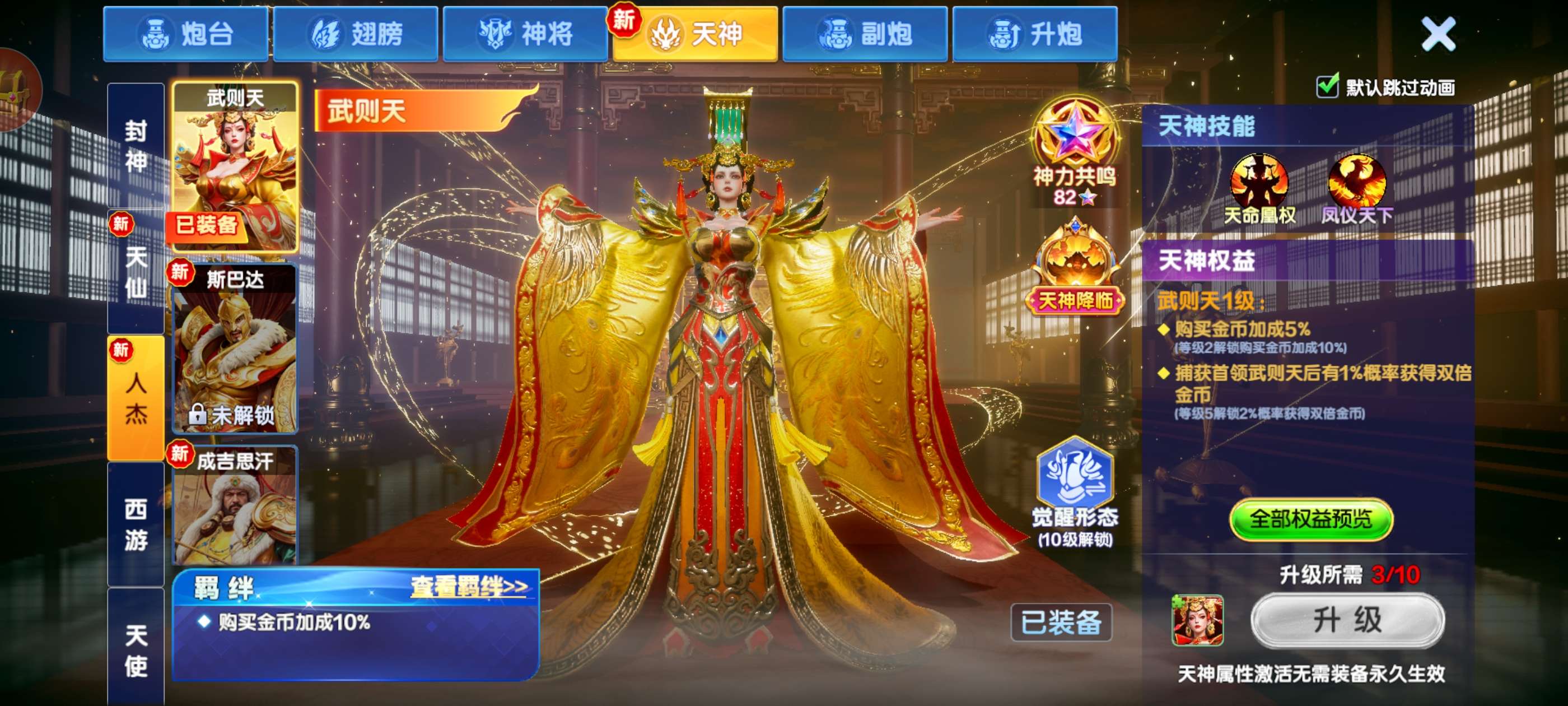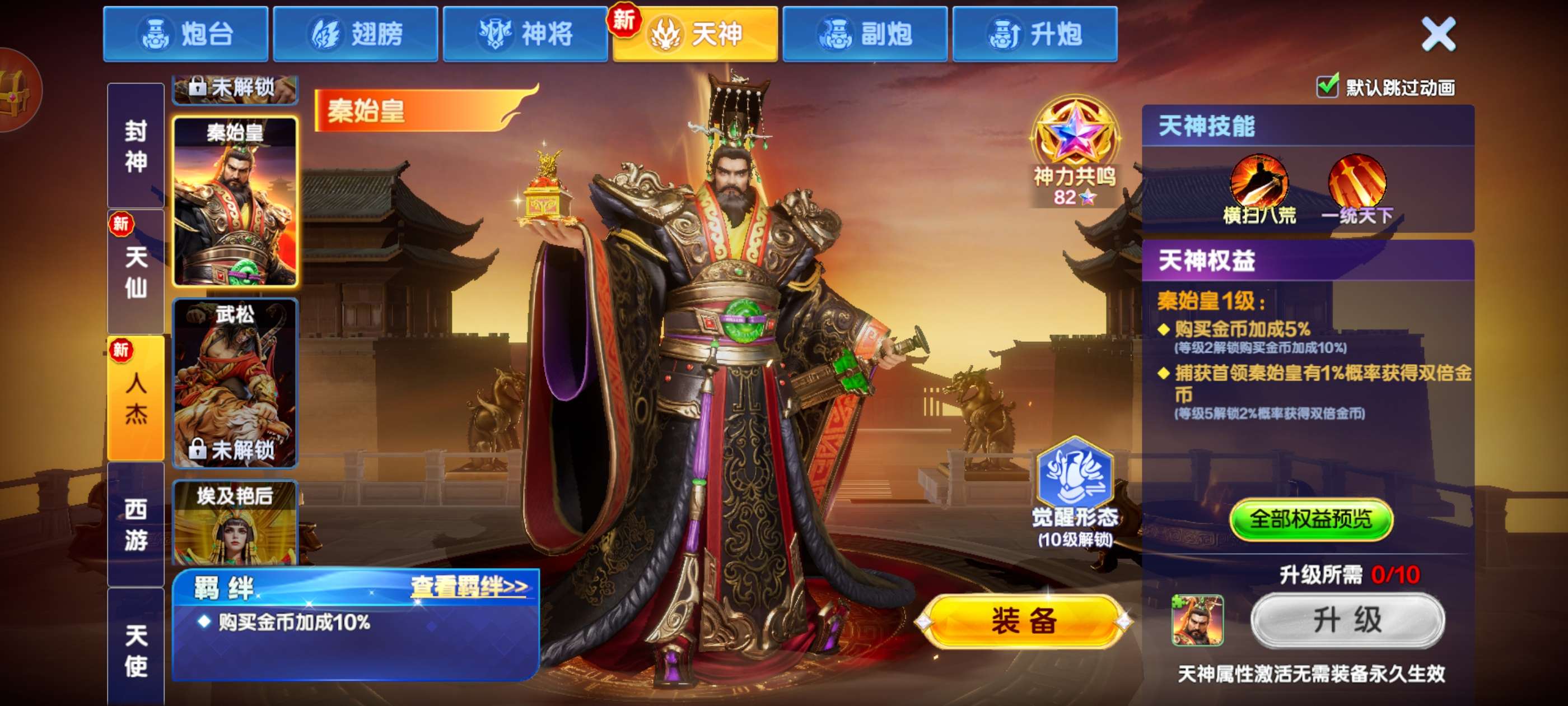 破产号v10三个天神,武则天,秦始皇,嫦娥,巅峰13级,加成高,多套羁绊翻倍,19个神将,带永久副婆