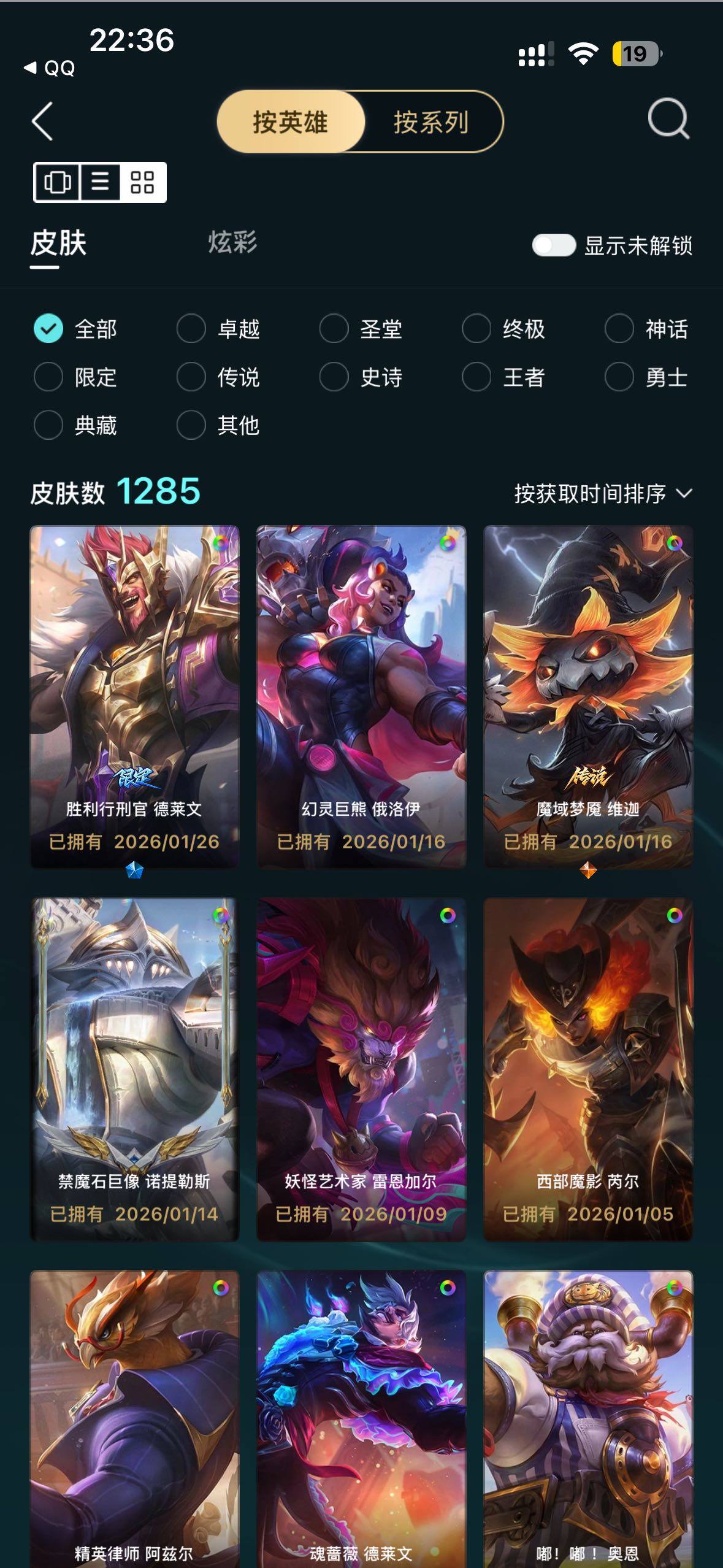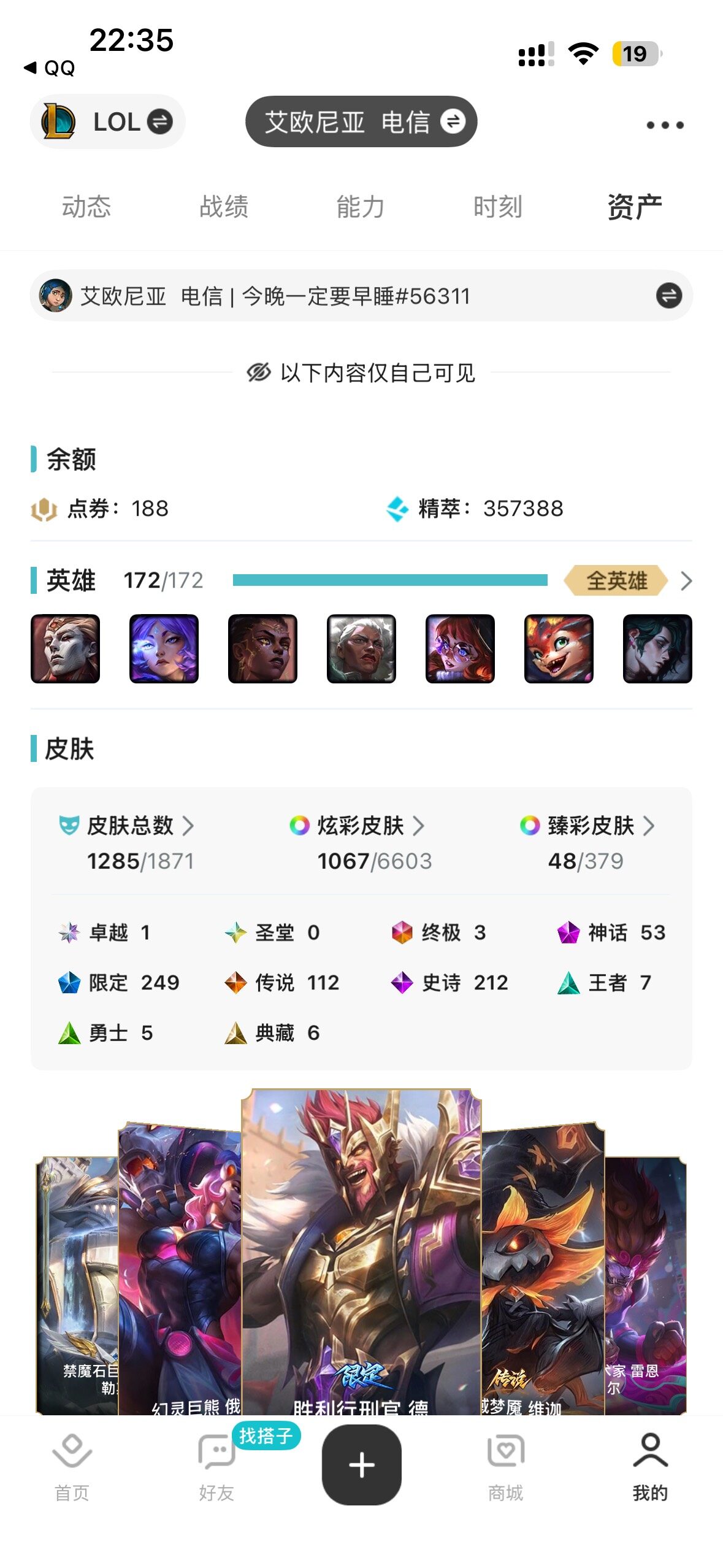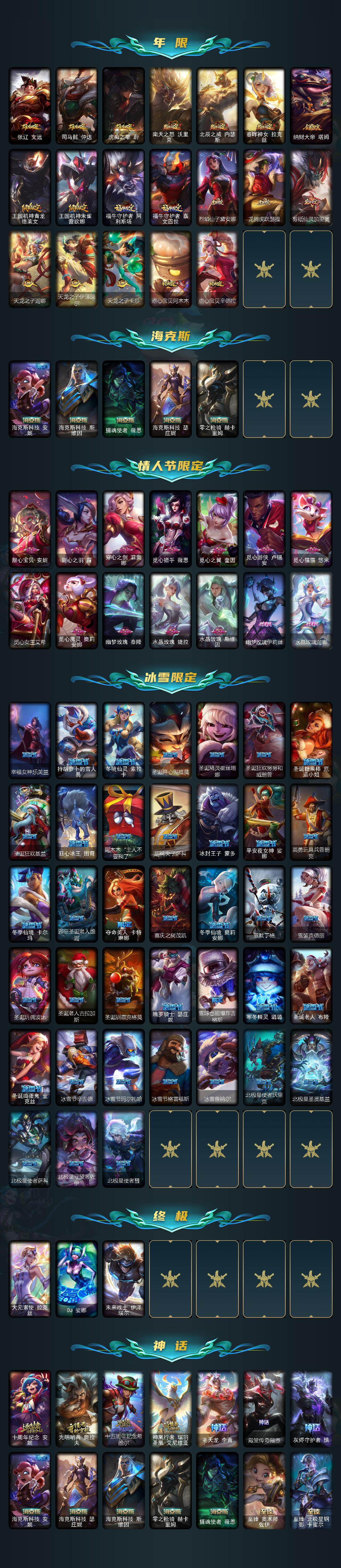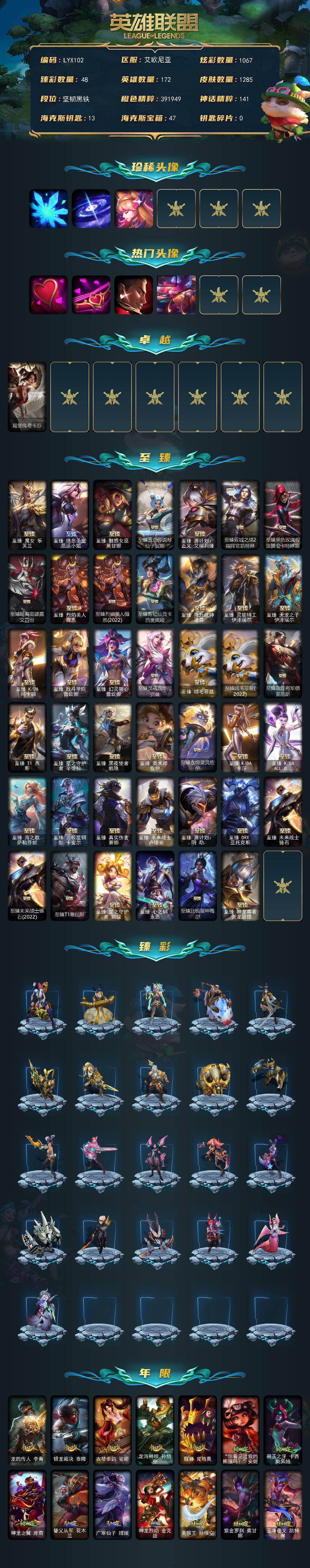 【特价出售/店主推荐】未定级段位-172英雄-1285皮肤-1067炫彩-3终极-53神话-249限定-112传说-212史诗