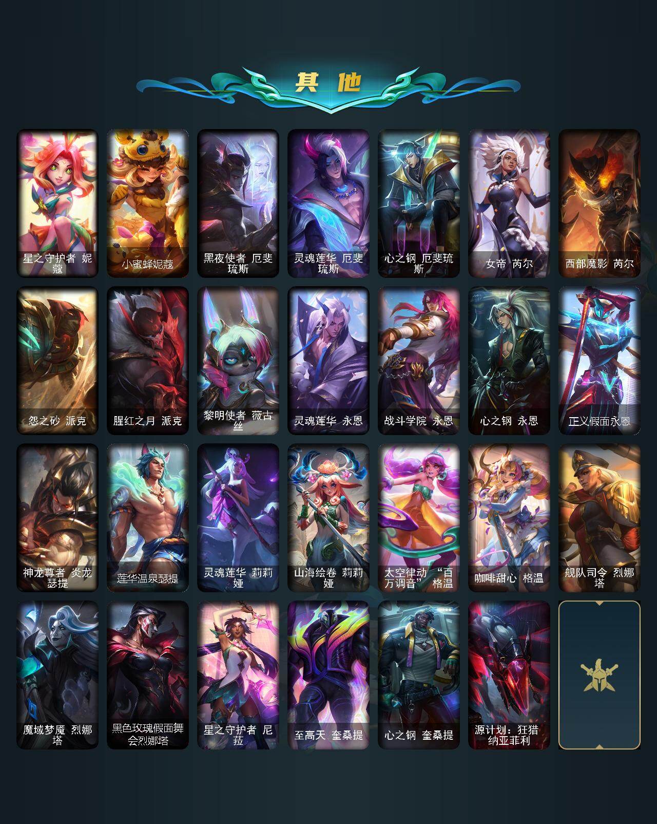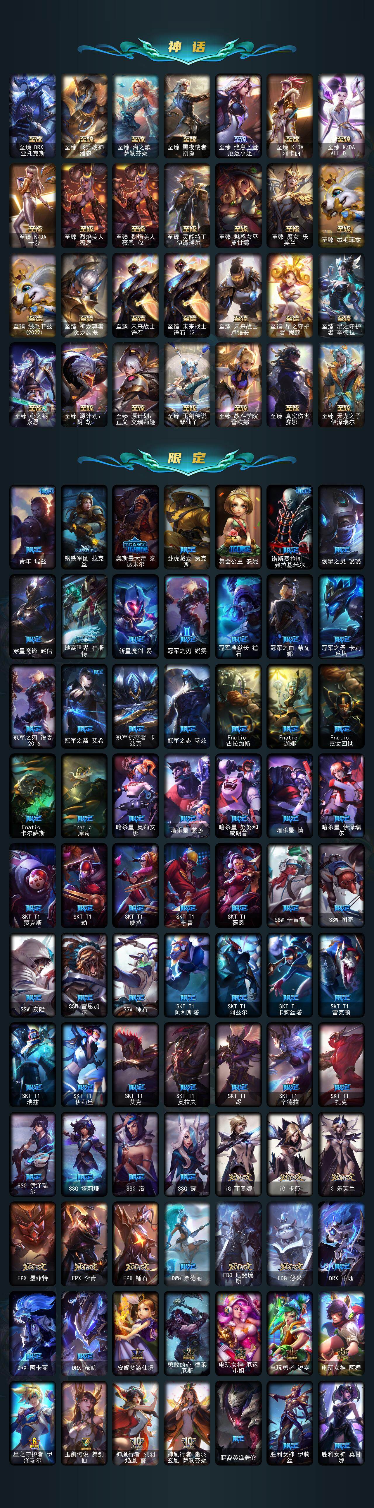 【至臻皮肤】:至臻魔女乐芙兰,至臻绝息圣堂厄运小姐,至臻魅惑女巫莫甘娜,至臻玉剑传说琴仙子娑娜,至臻源计划正义艾