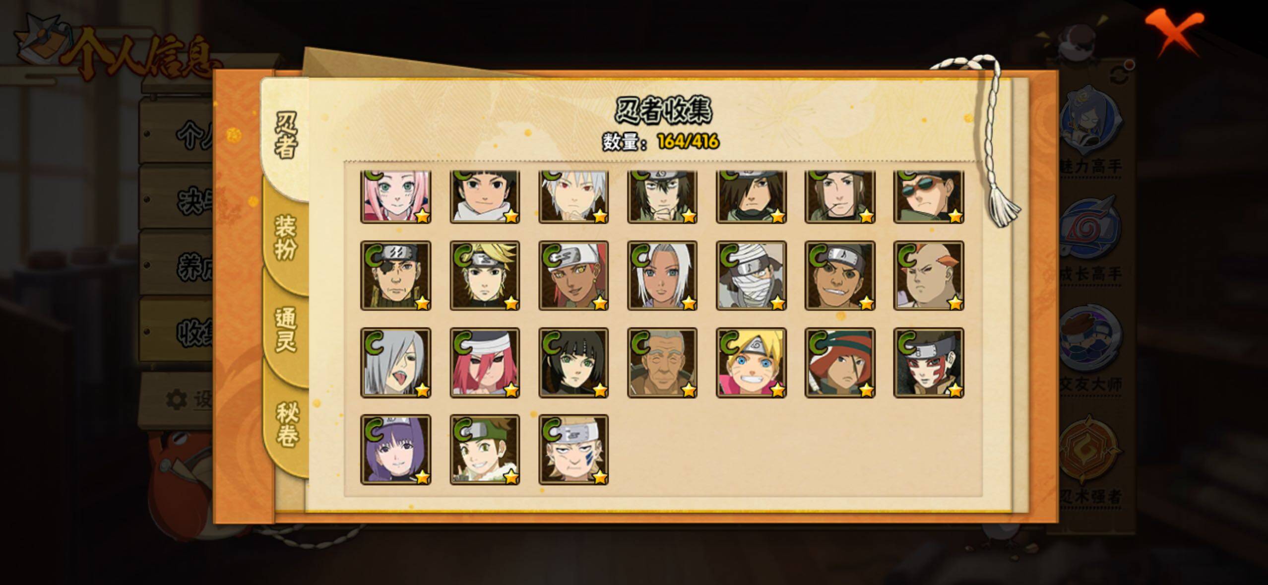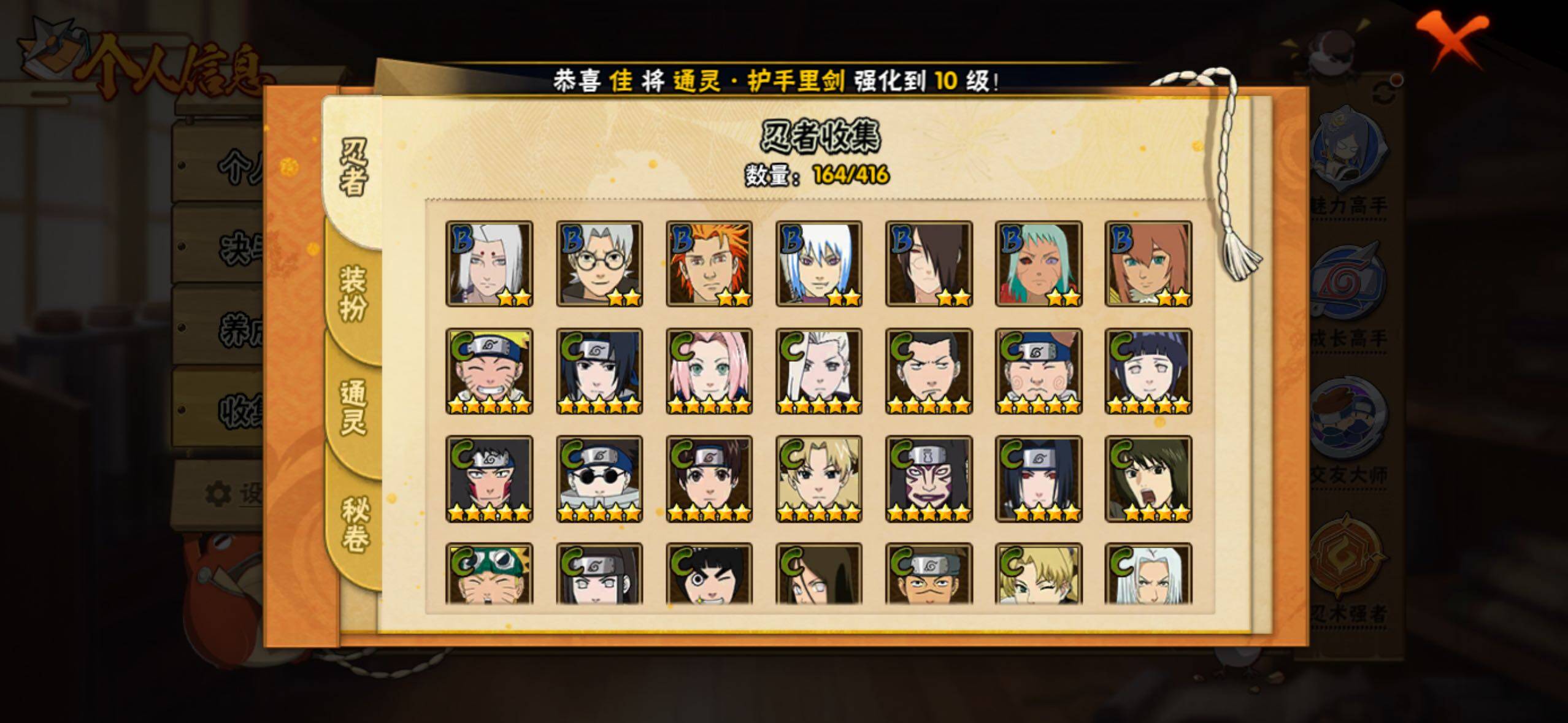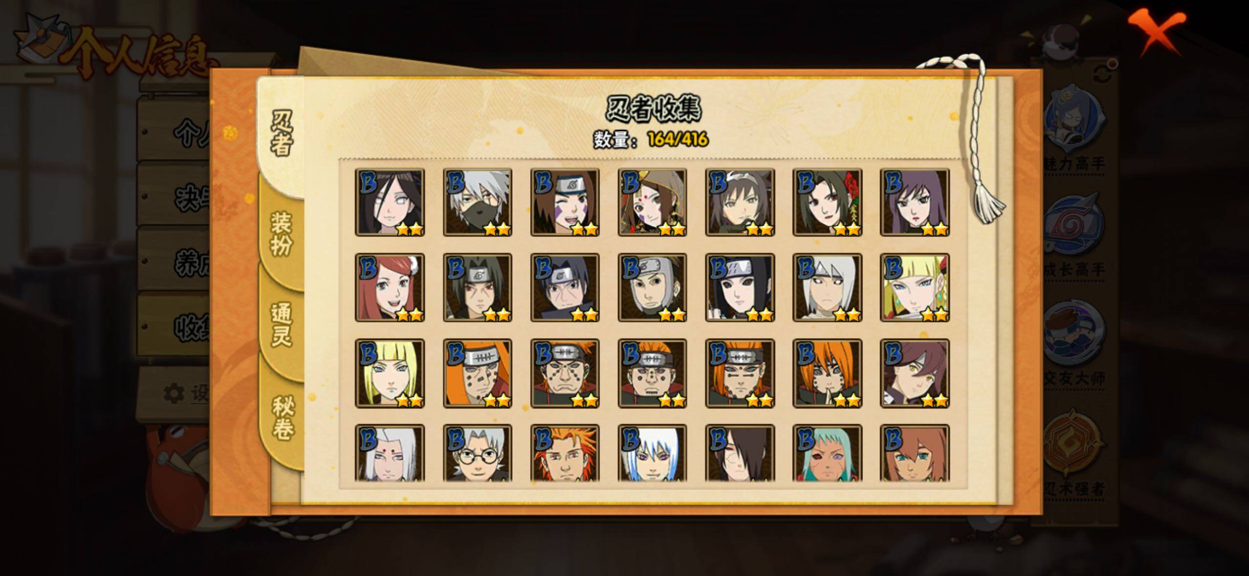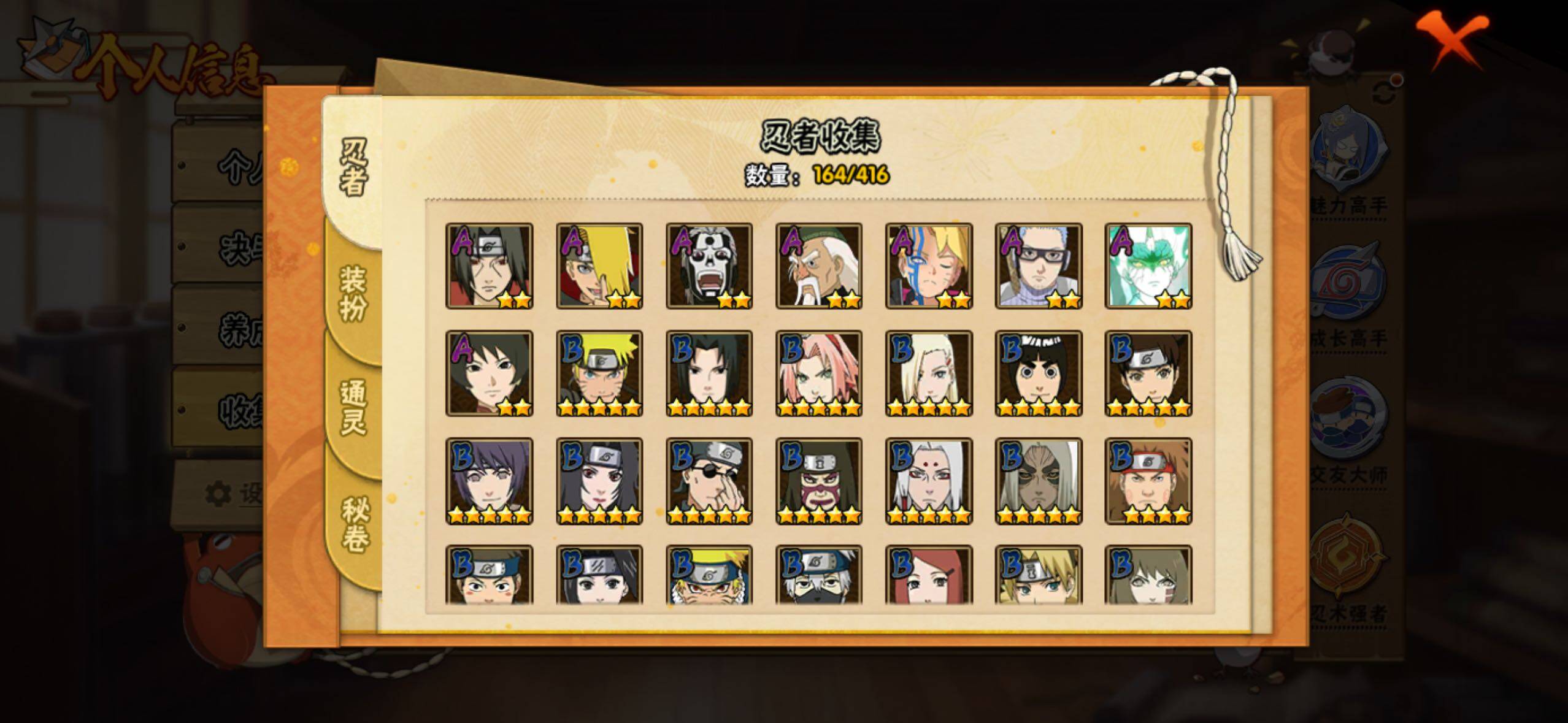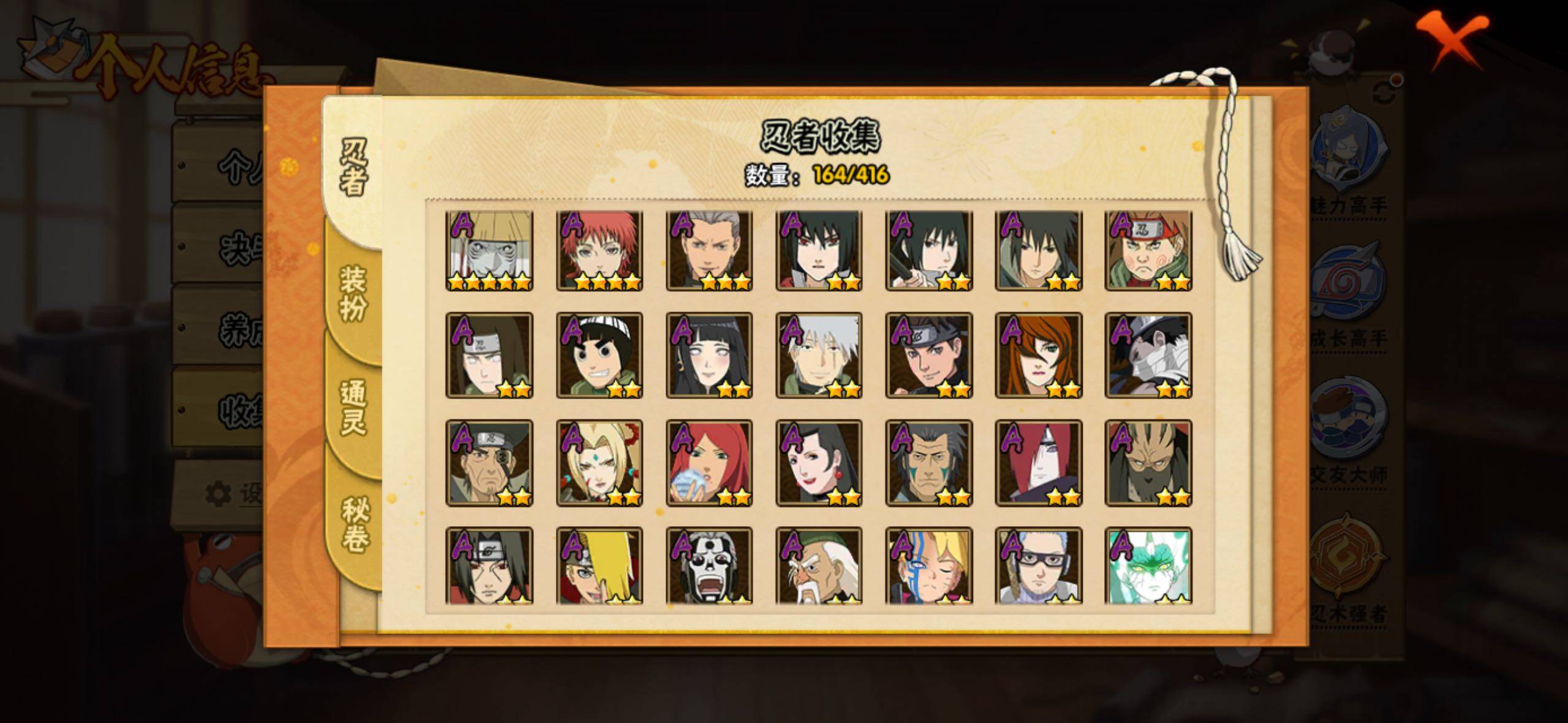 【S级忍者】:宇智波鼬「秽土转生」(3星),宇智波斑「秽土转生·解」(3星),宇智波带土「忍界大战」(3星),艾「忍界大战」(3星),宇智波鼬「须佐能乎」(3星),宇智波止水「须佐能乎」(3星),旗木卡卡西「须佐能乎」(3星),千手柱间「木叶创立」(3星),自来也「舞之豪杰」(3星),