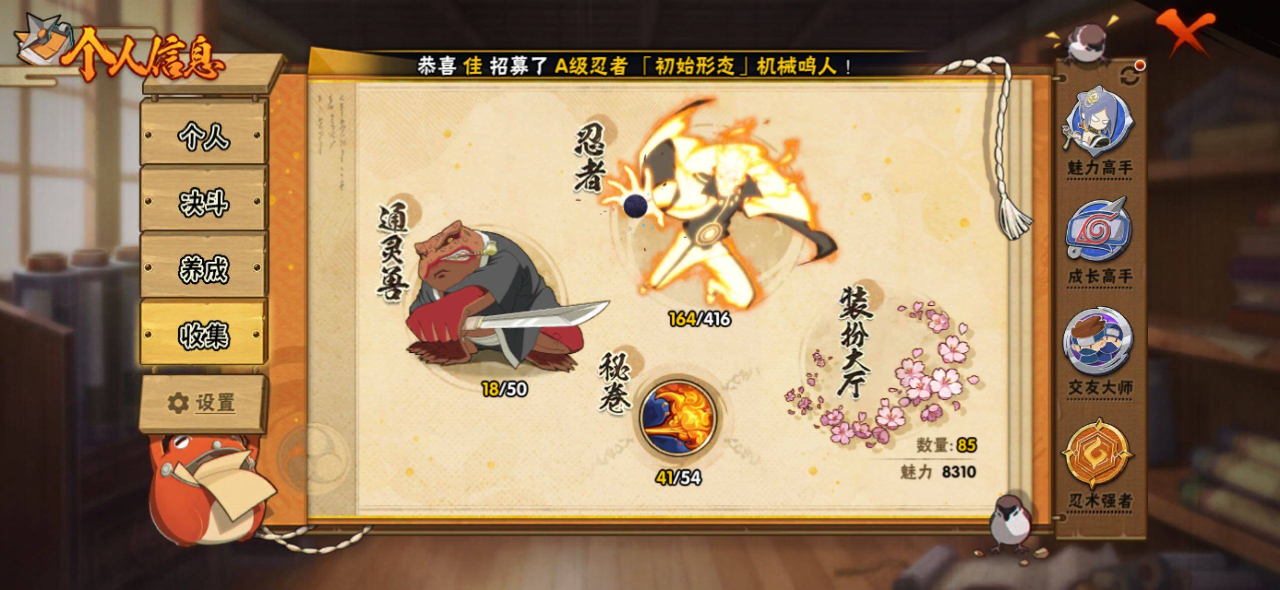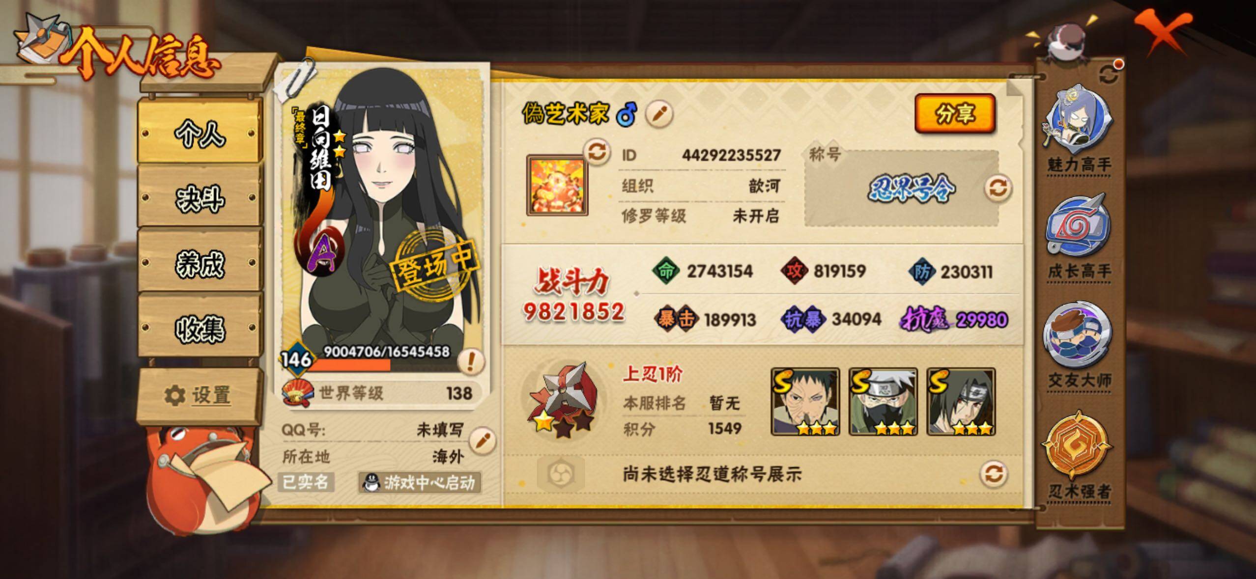 v9 18S 32A 982w战力 1.4万金币 忍战樱46片 2个主场景: