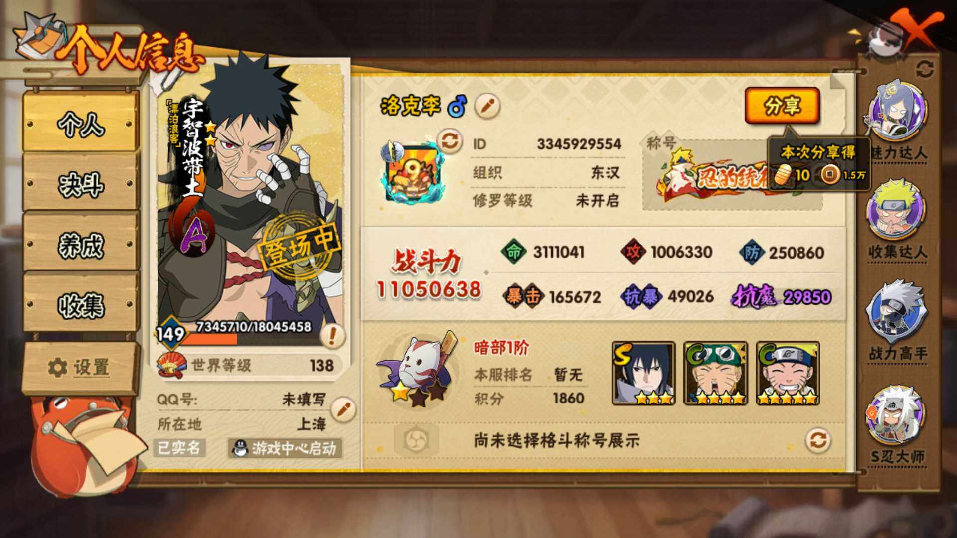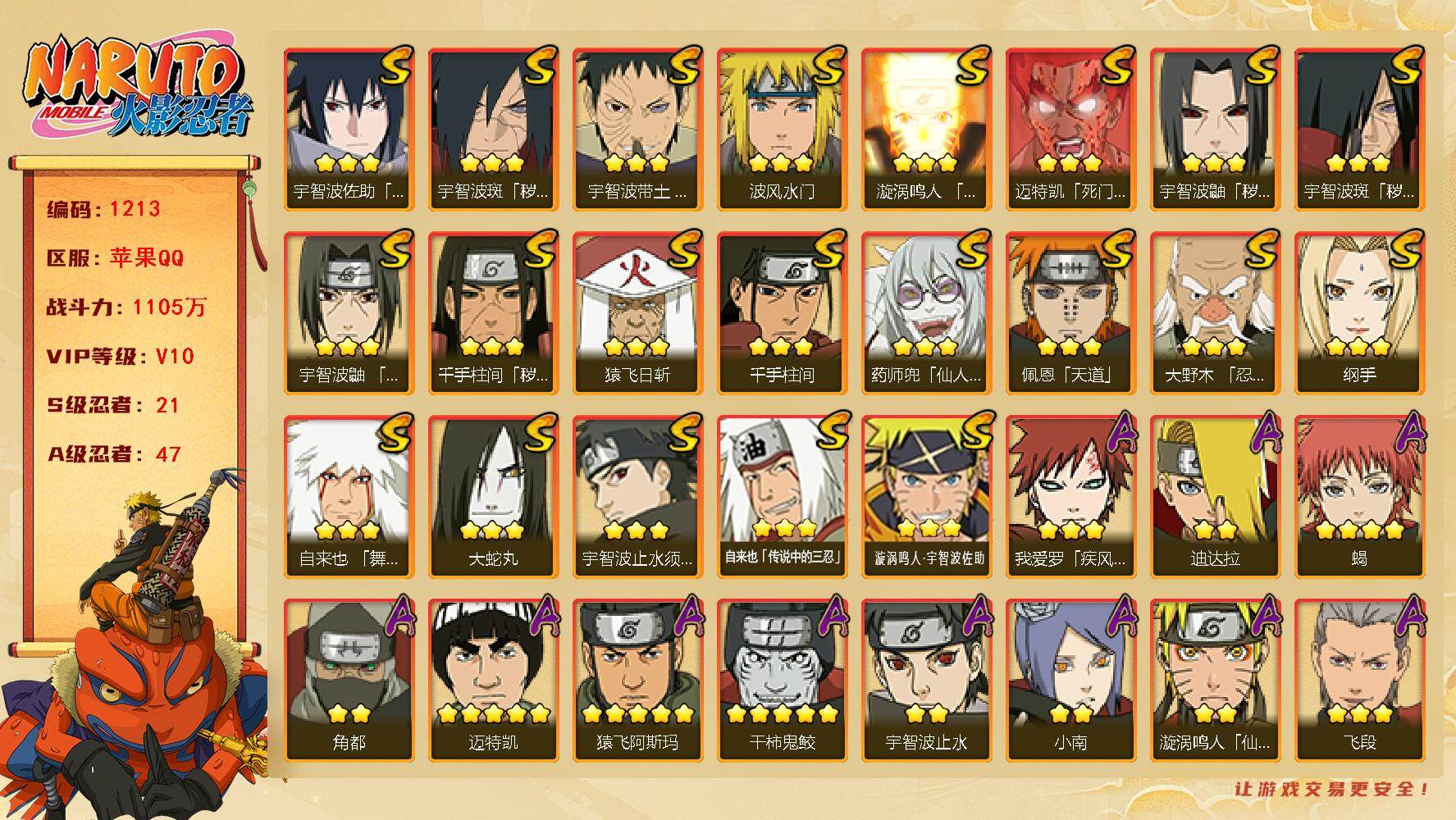 V10 21S 47A 1105万战力 金币4938 限时点卷1680 高招卷102 热门A面麻、百豪樱、漂泊再不斩、泳装小南、忍战奇拉比、漂泊带土、侠隐大野木。自来也49片 创立斑65片 金水门40片 三代雷影80片 舍人80片 YY1707