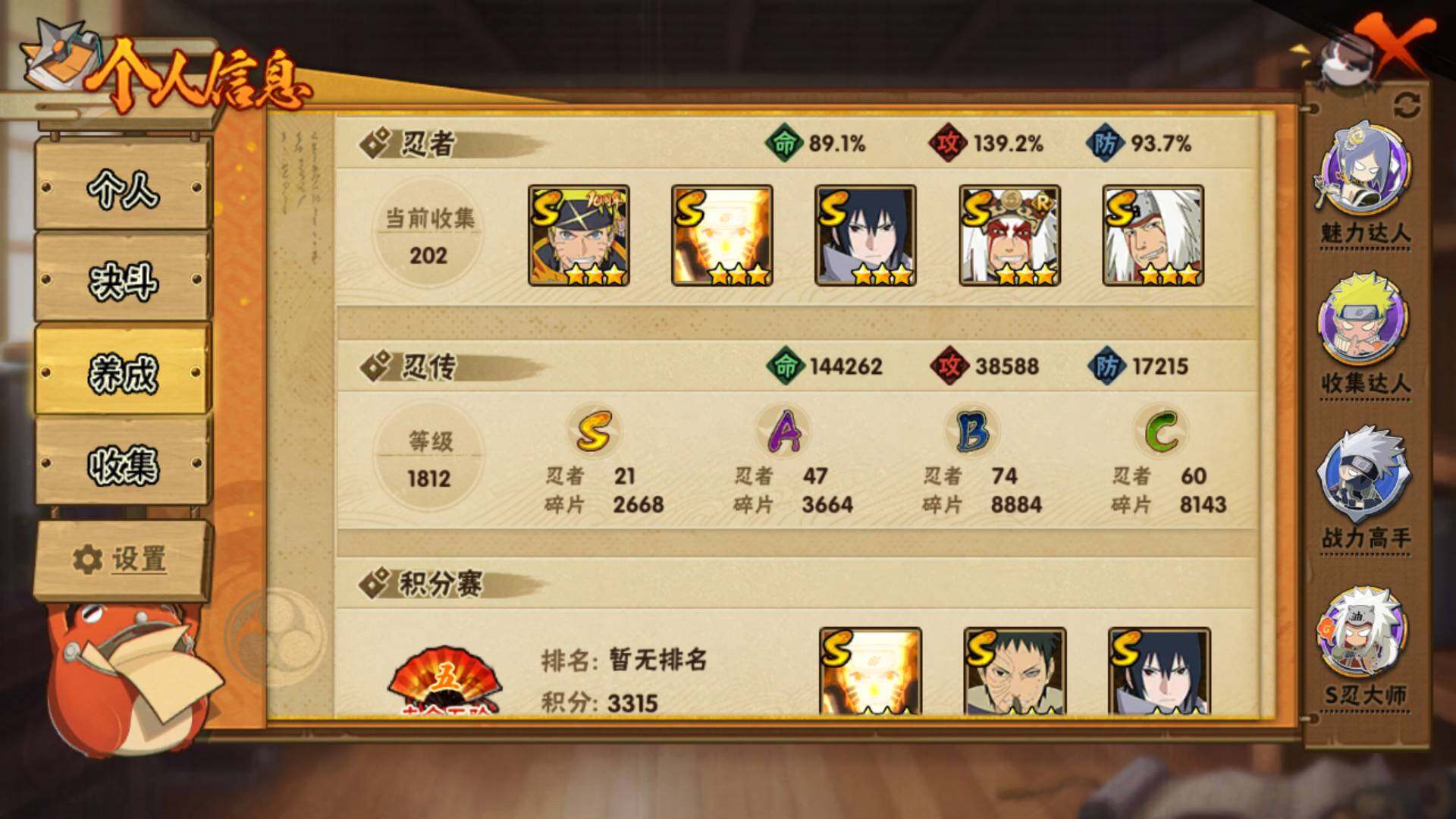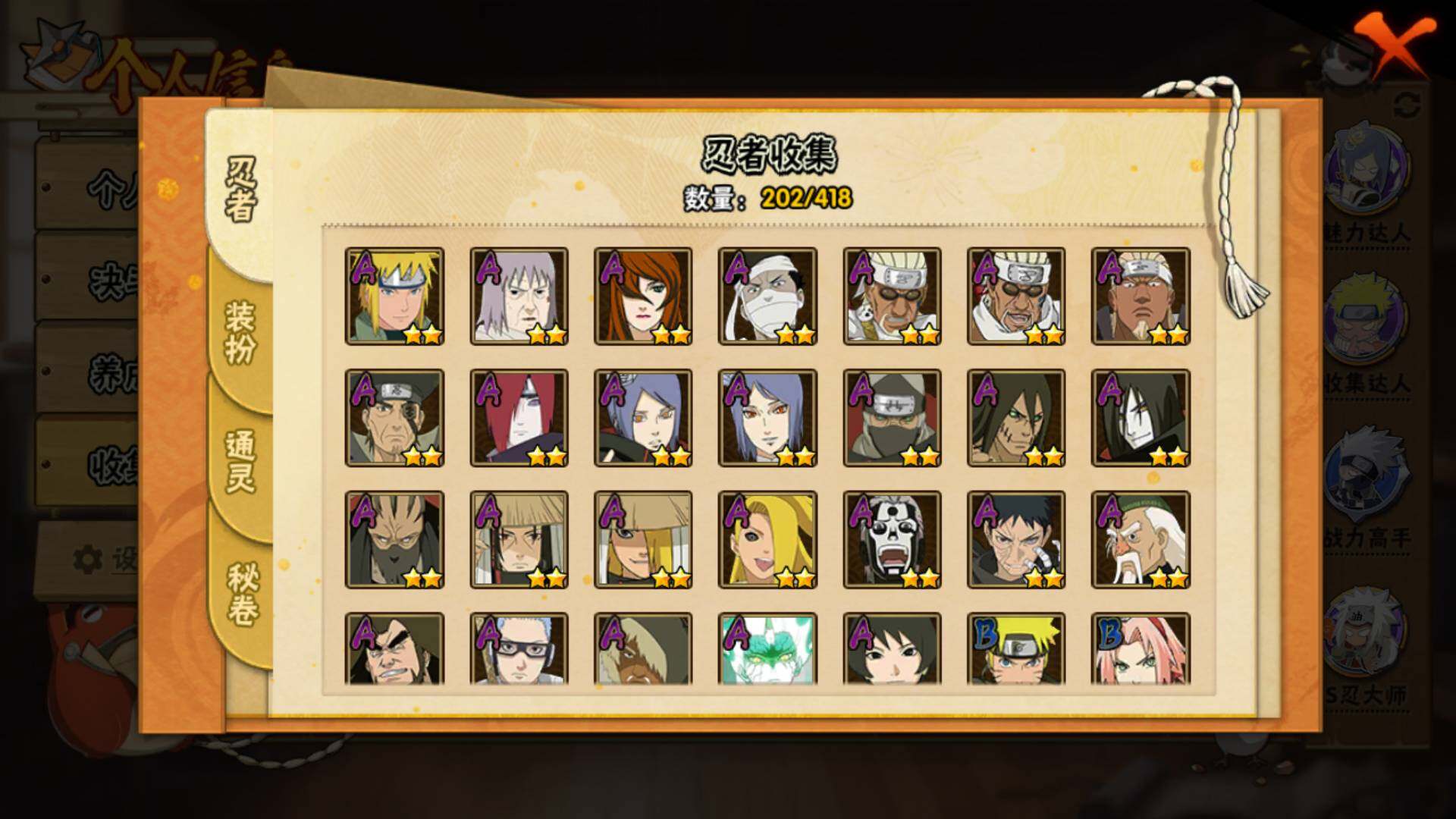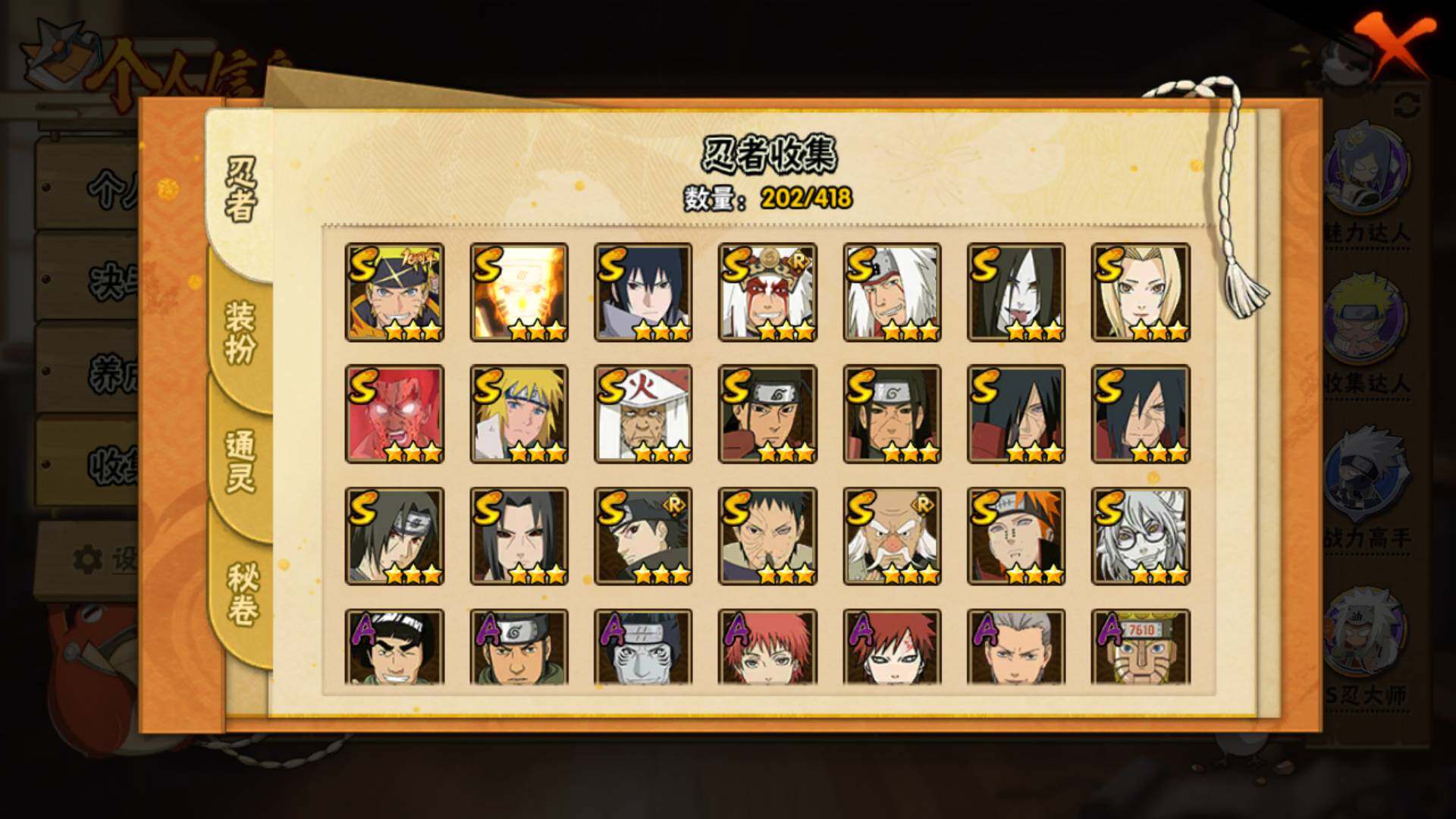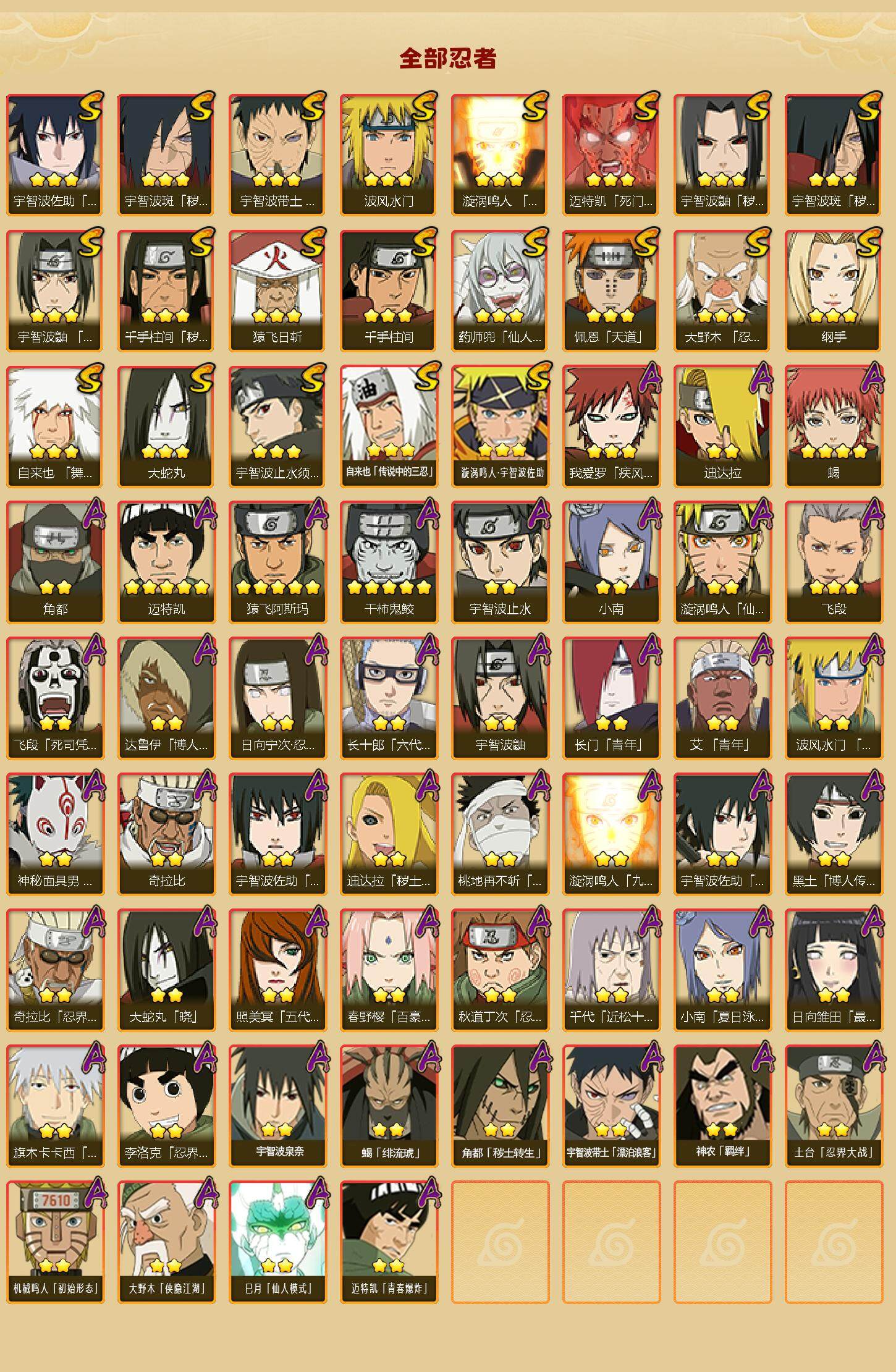 【S级忍者】:千手柱间「秽土转生」(3星),宇智波鼬「秽土转生」(3星),宇智波斑「秽土转生」(3星),宇智波斑「秽土转生·解」(3星),大野木「忍界大