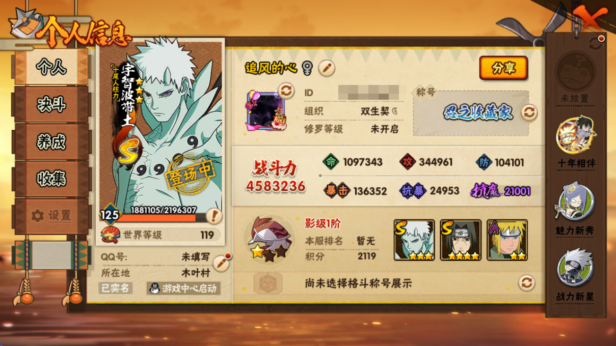 (可转苹果)458w战力十尾带土4S+198直购忍战卡卡西/