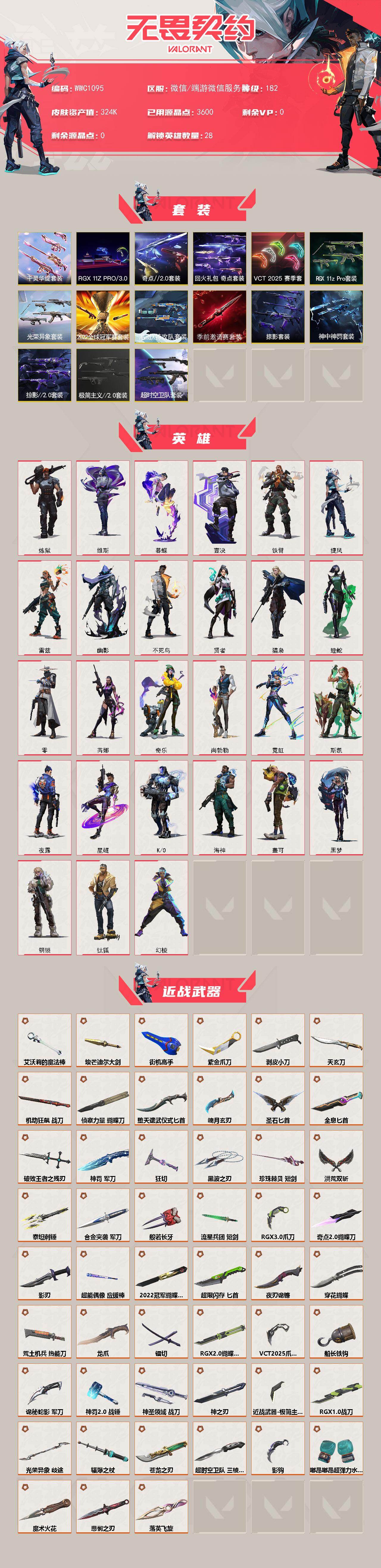 【WWC1095】终极*114/传奇*12/卓越*52/皮肤*293/等级*182/段位:黄金/2022全球冠军赛套装/超时空卫队套装/无畏契约季前邀请赛套装/滋滋X特攻队套装/光荣异象套装/RGX 11z Pro套装/VCT 2025 赛季套装/RGX 11z Pro//3.0套装/千灵华绽套装/奇点//2.0套装/回火礼包:奇点套装/掠影套装/神中神罚套装/掠影//2.0套装/极简主义//2.0套装/幻棱/炼狱/维斯/暮蝶/钛狐/壹决/铁臂/捷风/雷兹/幽影/不死鸟/贤者/猎枭/蝰蛇/零/芮