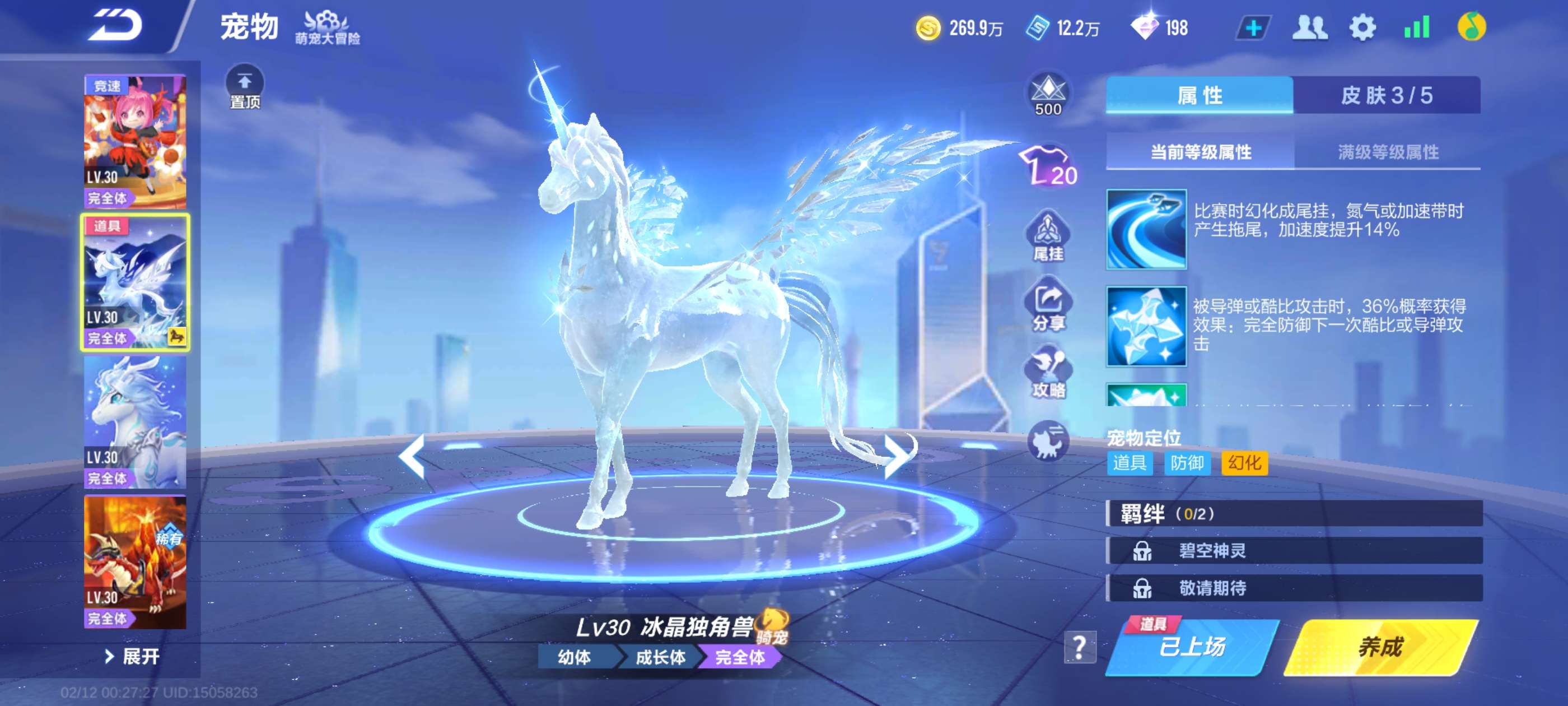 V9一手美女道具号,有一个道具骑宠冰晶独角兽,源极之星有进阶皮肤,幻星有进阶皮肤,冰魄有传说皮肤,