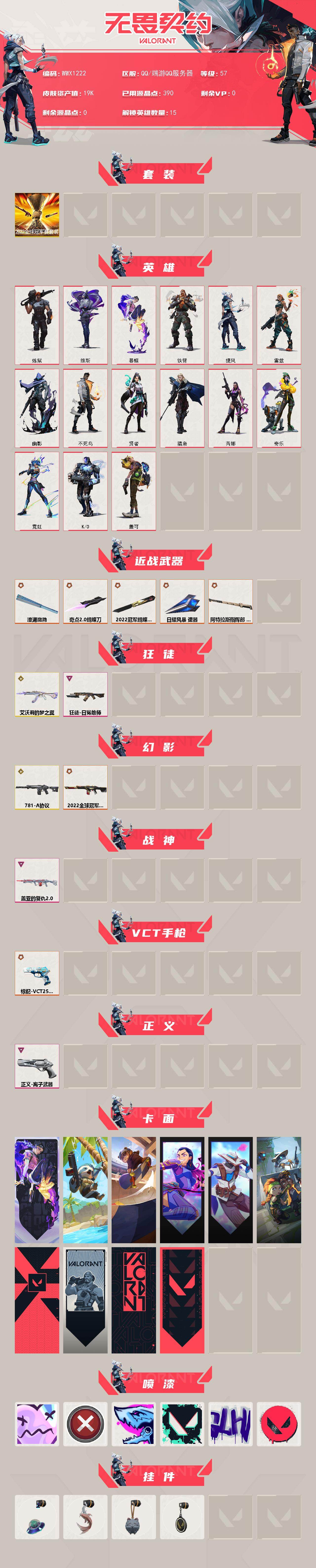【WWX1222】终极*7/传奇*2/卓越*3/皮肤*36/等级*57/段位:未定级/2022全球冠军赛套装/炼狱/维斯/暮蝶/铁臂/捷风/雷兹/幽影/不死鸟/贤者/猎枭/芮娜/奇乐/霓虹/K/O/盖可/近战武器-2022全球冠军赛 蝴蝶刀/近战武器-奇点//2.0 蝴蝶刀/近战武器-澄湖潋滟/近战武器-日耀风暴 遗器/近战武器-阿特拉斯指挥部 甩棍/狂徒-艾沃莉的梦之翼/狂徒-日冕雄师/幻影-781-A协议/幻影-2022全球冠军赛/战神-盖亚的复仇//2.0/标配-VCT25 x LEV/正