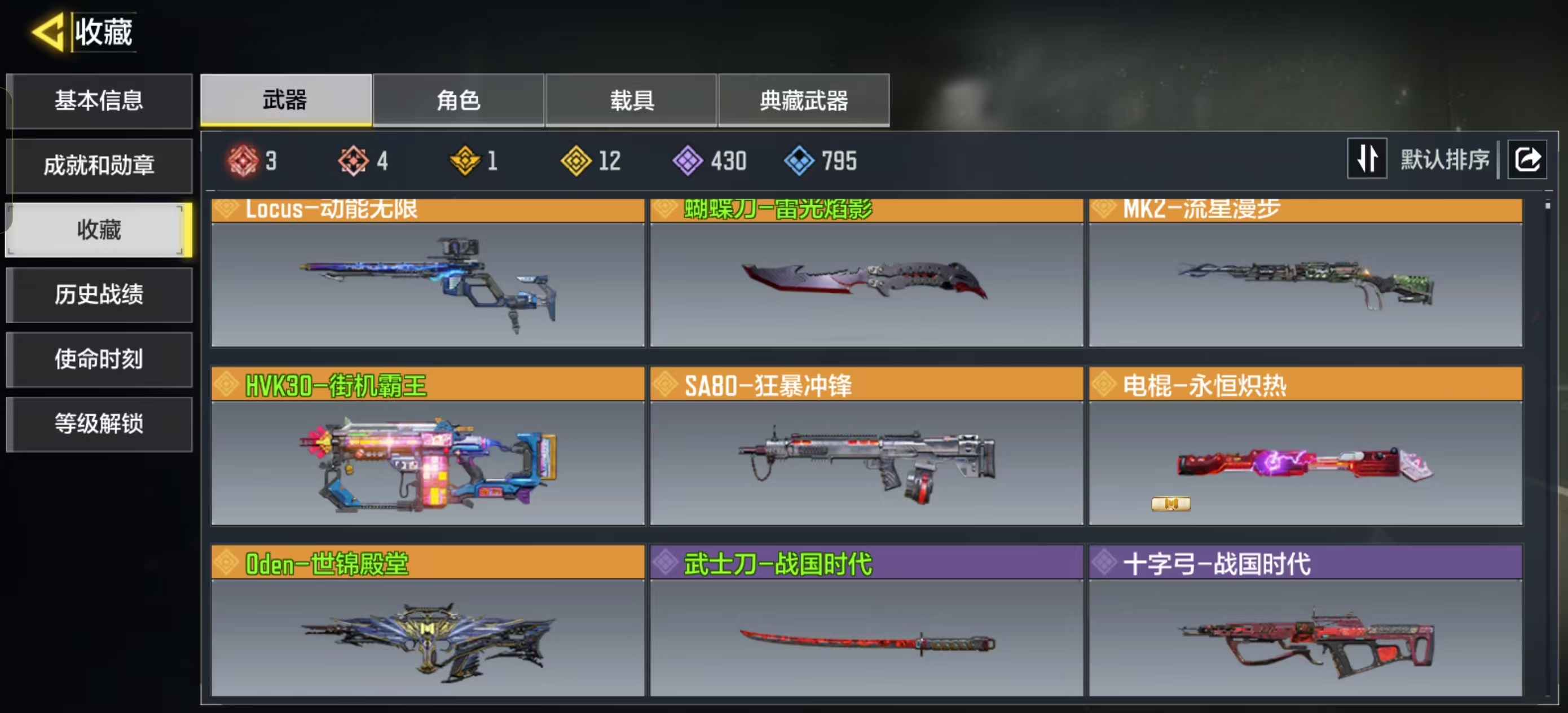【传说武器】电棍-永恒炽热,Locus-动能无限,2-流星漫步,SA80-狂暴冲锋,Type25-赤焰复仇,G37-次元律动,蝴蝶刀-雷光焰影,唐刀-白月魁,HVK30-街机霸王,XPR50-精灵咏叹,