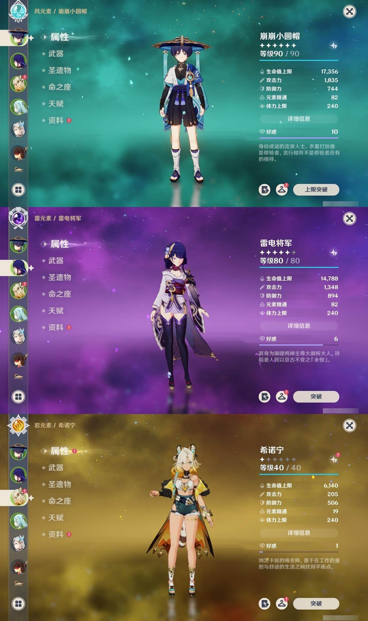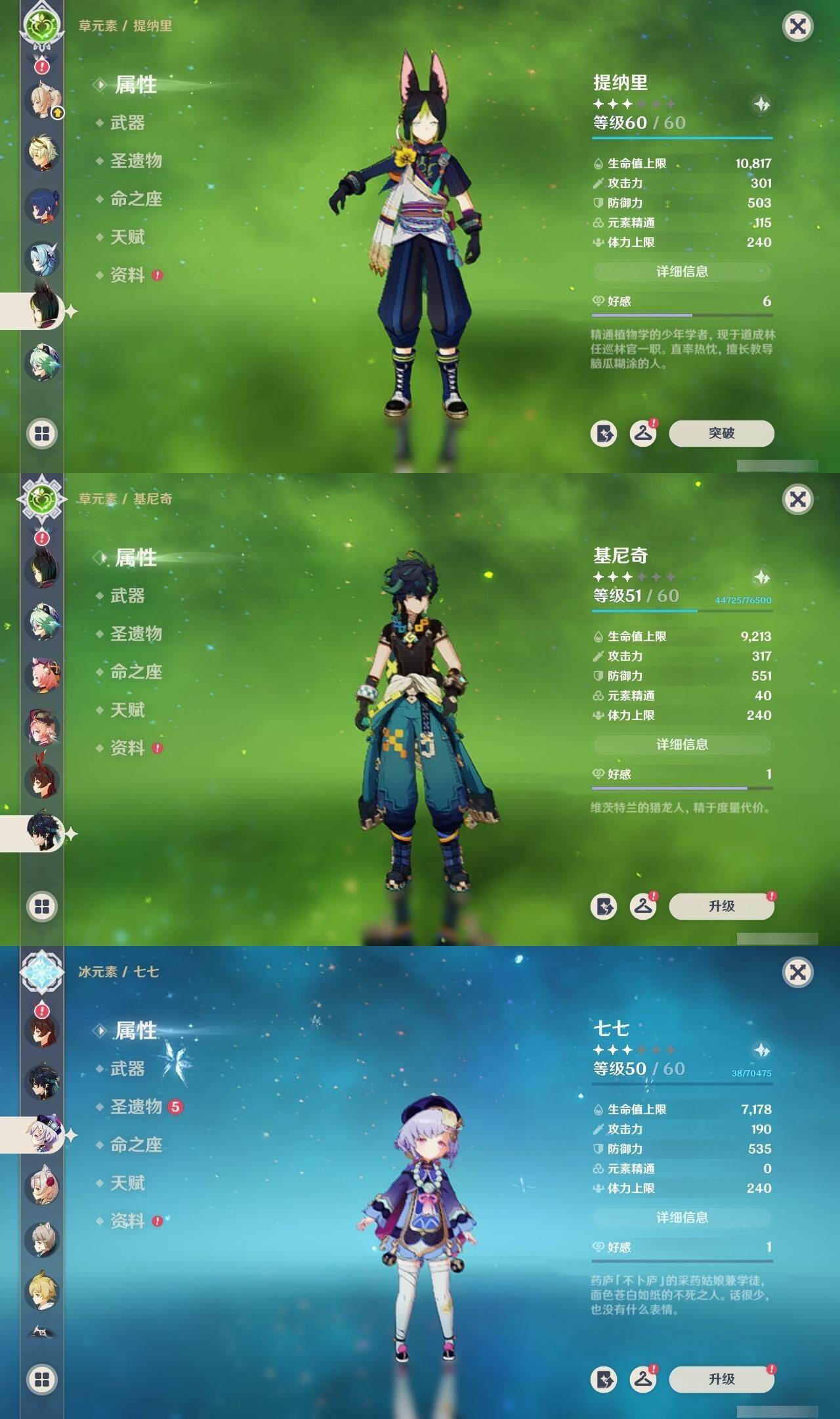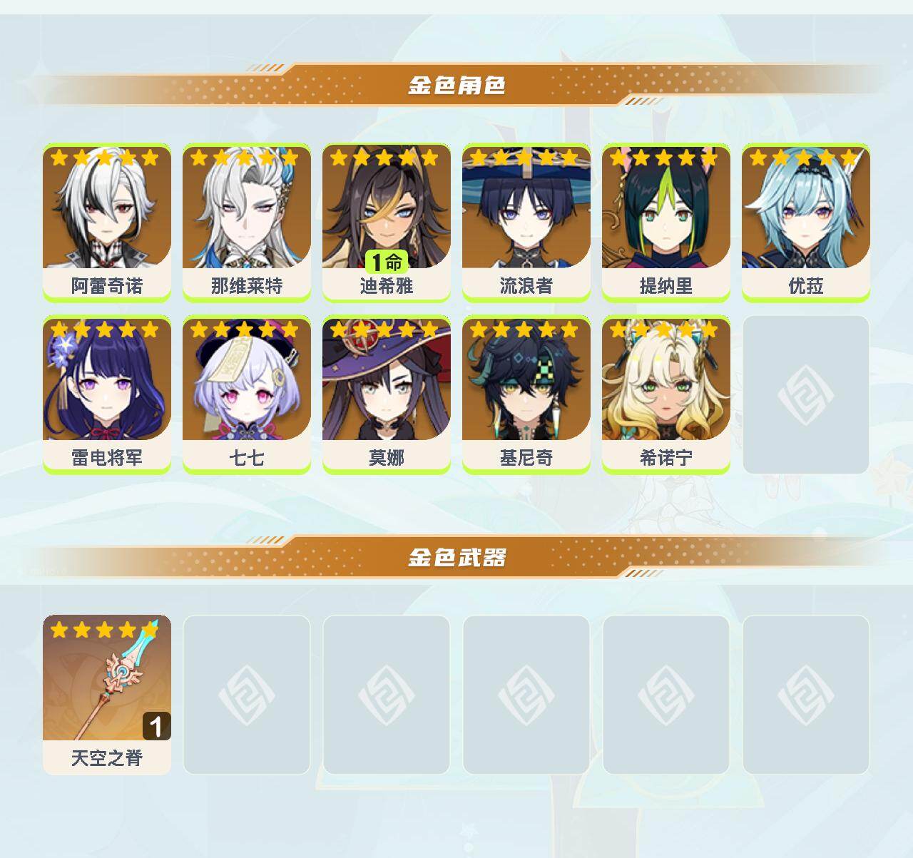 0命阿蕾奇诺,0命那维莱特,1命迪希雅,0命流浪者,0命提纳里,0命优菈,0命雷电将军,0命七七,0命莫娜,0命基尼奇,0命希诺宁,精1天空之脊
