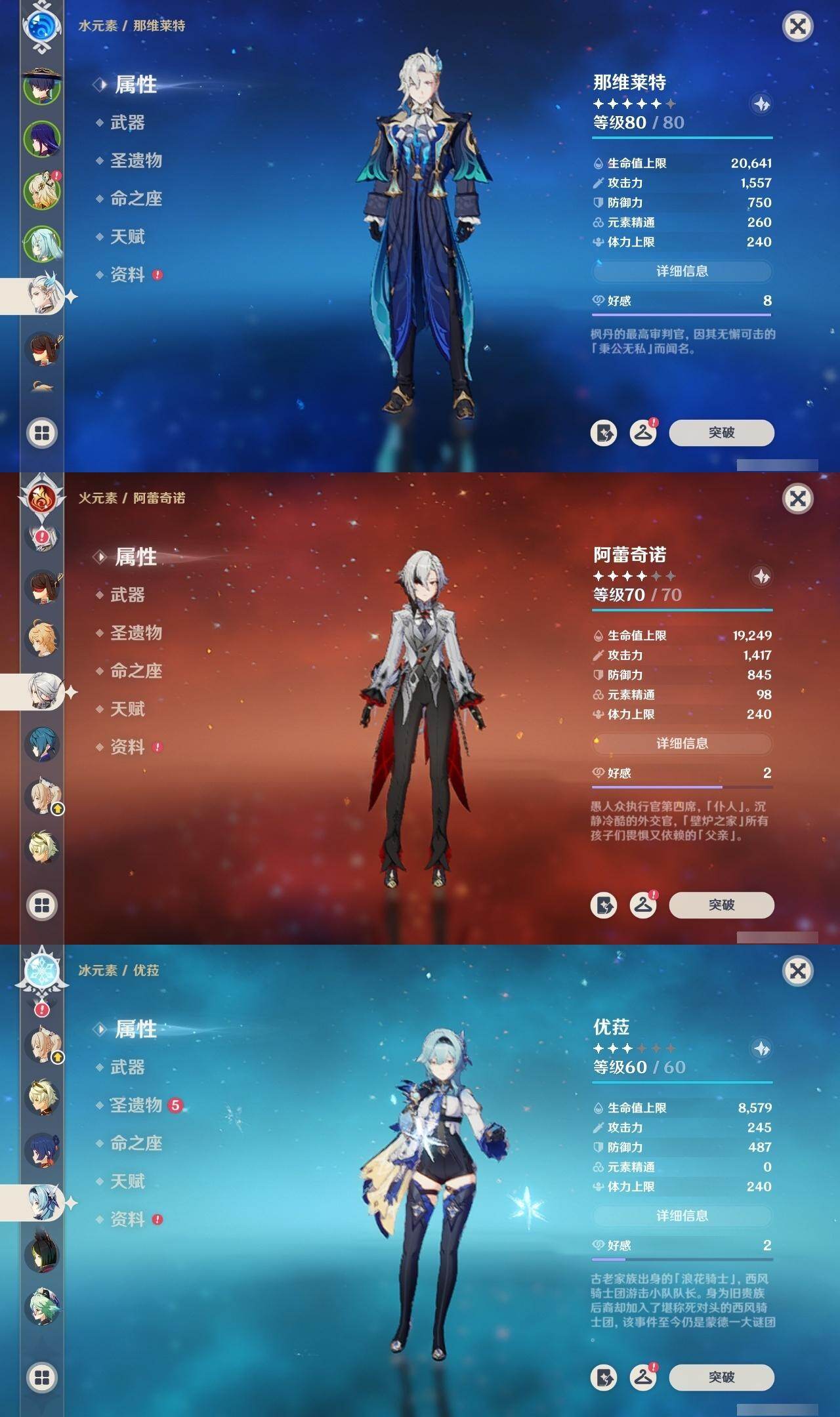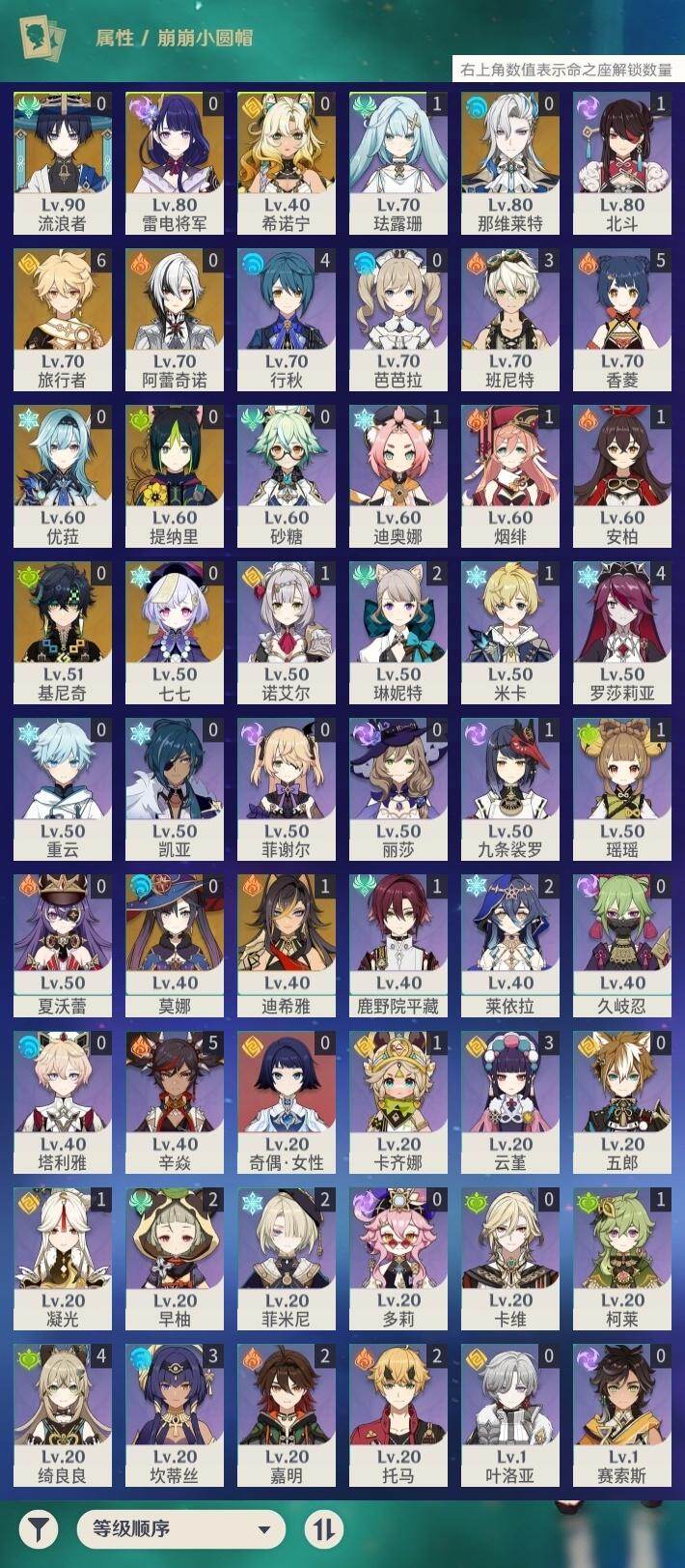 55级/13黄/男主/11个五星角色/1个五星武器0命阿蕾奇诺,0命那维莱特