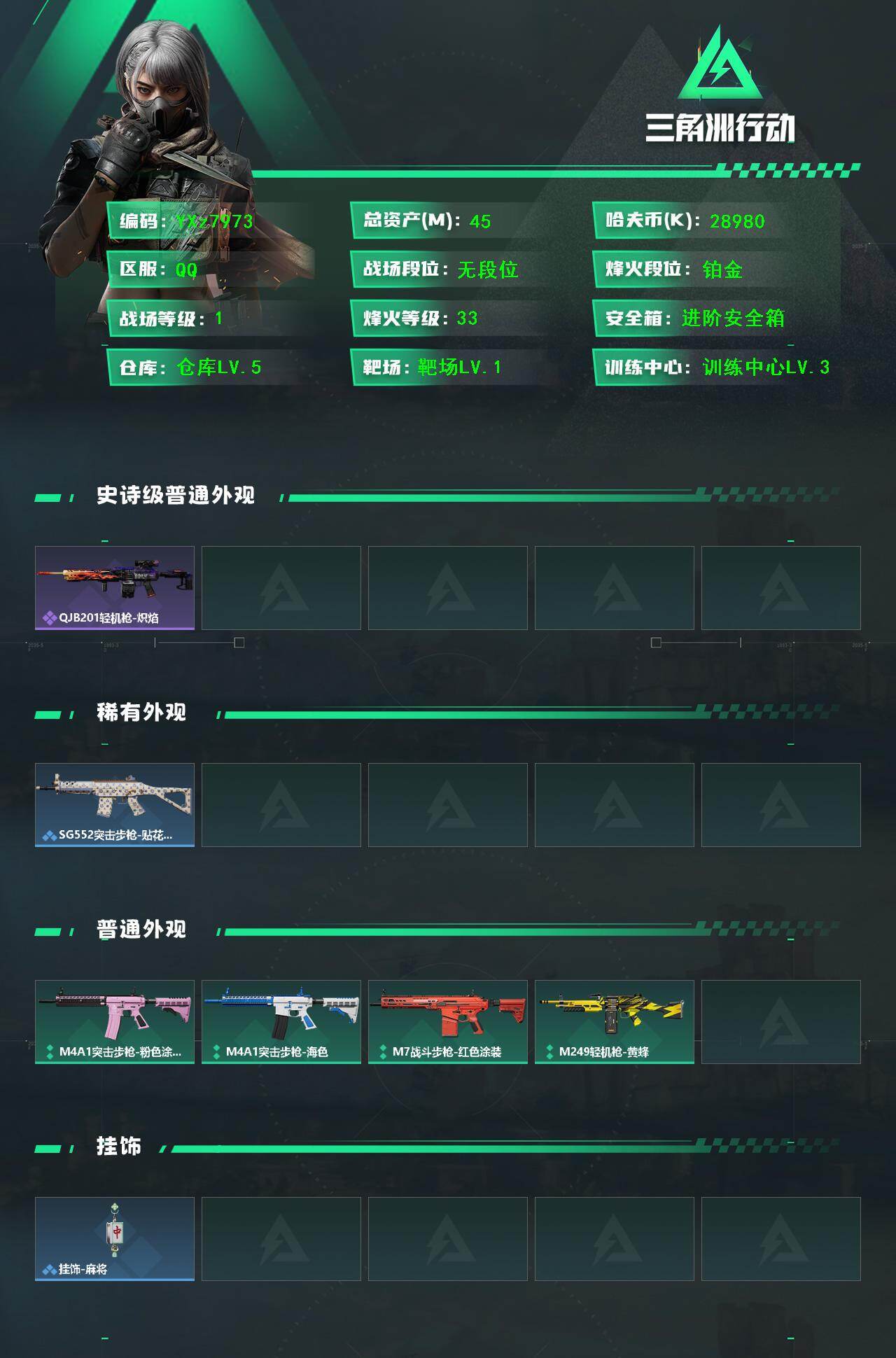 【小额资产号45M.适合小白入游首选.性价比超高账号】【Q区三端互通】【无二次】YXz7973-特勤处:仓库5级/靶场1级/训练中心3级-总资产45m-哈夫币2898w-烽火等级:33级
