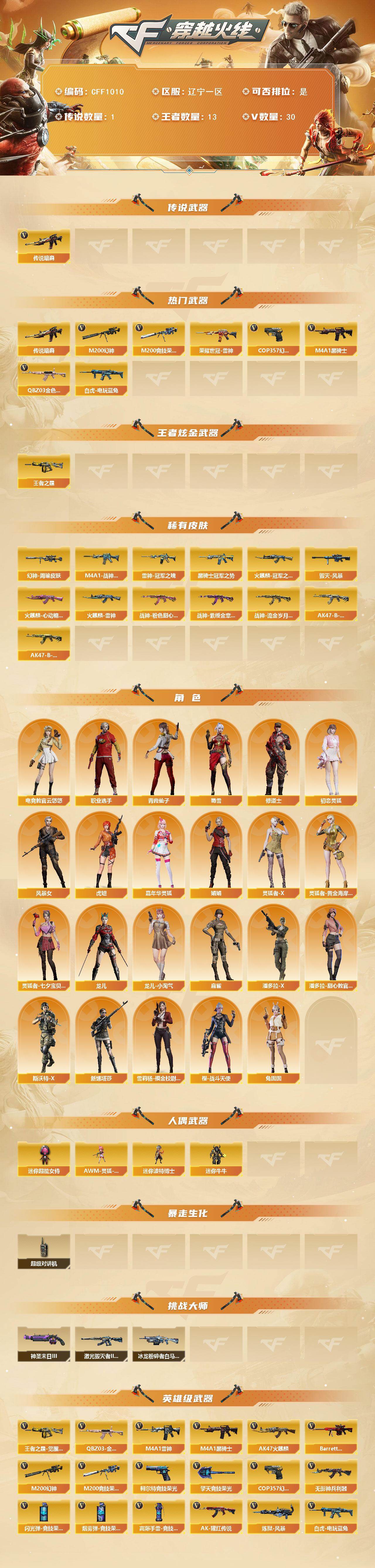 【CFF1010】29V/95级/将帅/1传说/13王者/1英雄/传说暗裔/QBZ03-金色蔷薇/M200_幻神/M200_竞技荣光/雷神世冠/白虎-电玩蓝兔/M4A1_黑骑士/COP 357-幻灵/王者之霆/幻神-周瑜皮肤/雷神-冠军之魄/M4A1-战神赵云/火麒麟-雷神/火麒麟-冠军之心/火麒麟-心动糖果/毁灭-风暴/黑骑士-冠军之势/战神-粉色甜心皮肤/战神-紫绶金章皮肤/战神-流金岁月皮肤/AK47-B-常胜将军-刘备/AK47-B-常胜将军-孙权/电竞教官云悠悠/修道士/初恋灵狐/风暴