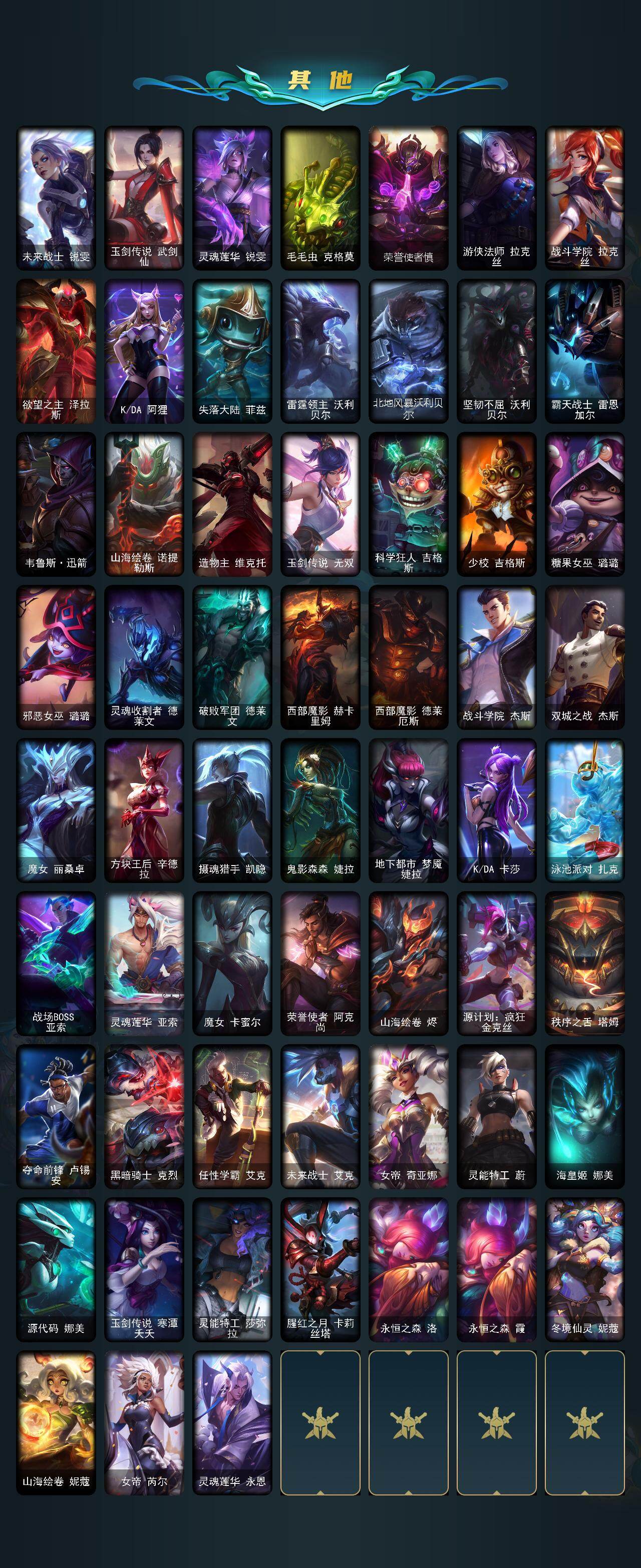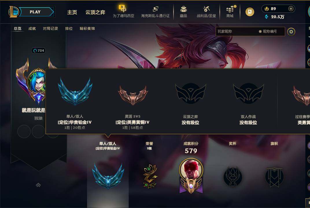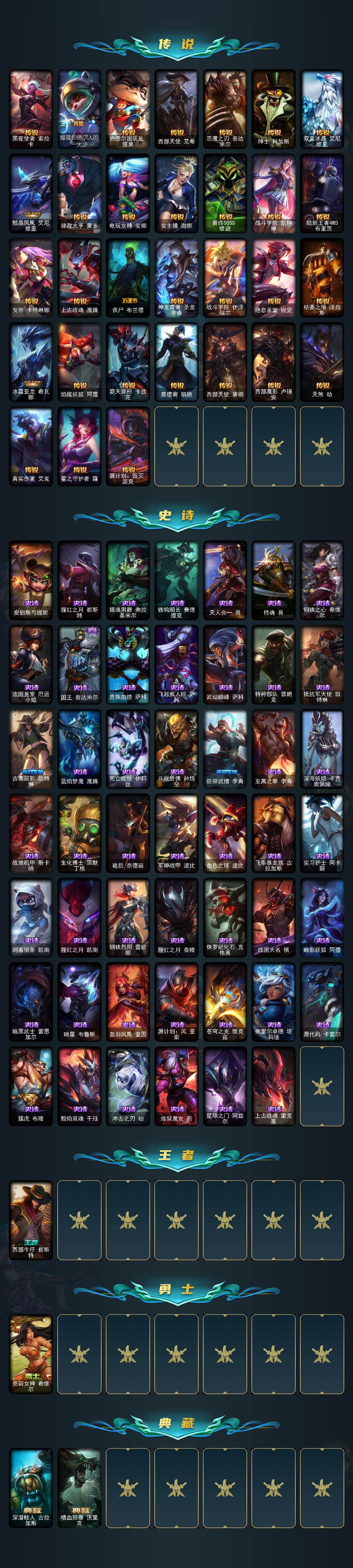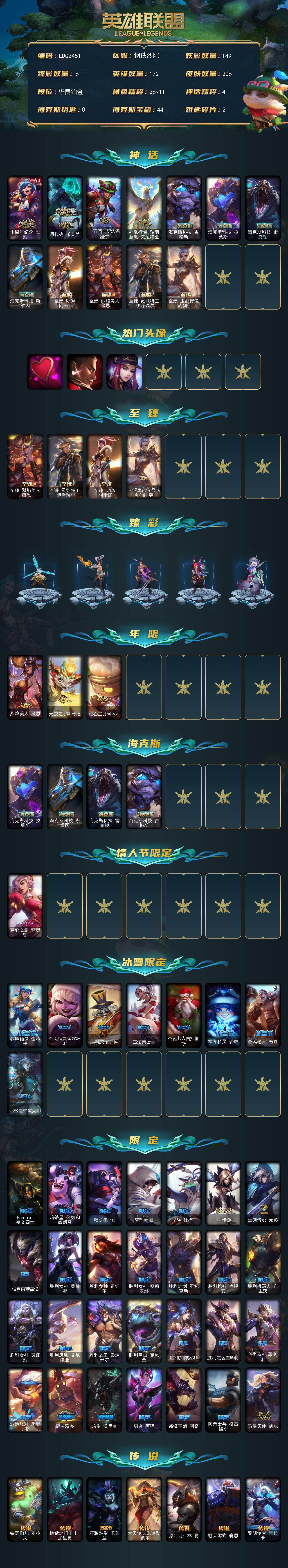 172英雄/306皮肤/12神话/40限定/6臻彩/149炫彩/38传说/48史诗/铂金账号等级:724/十周年纪念安妮/