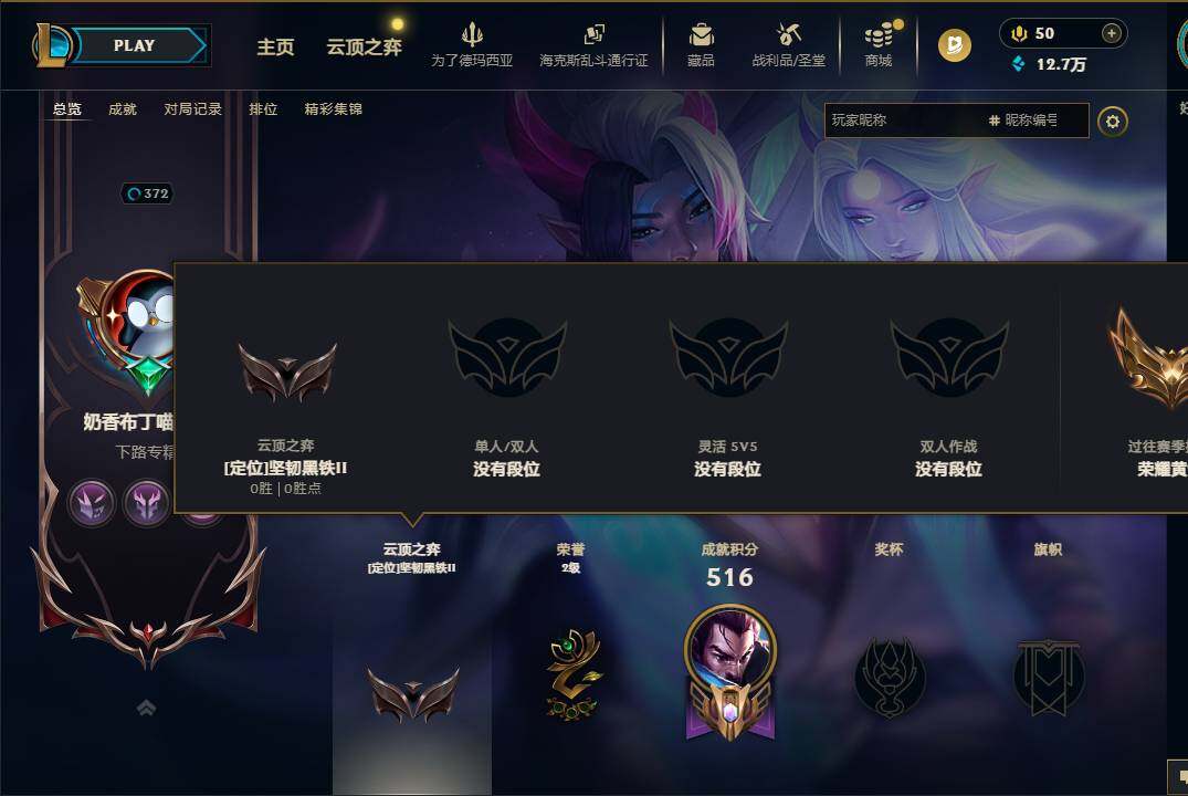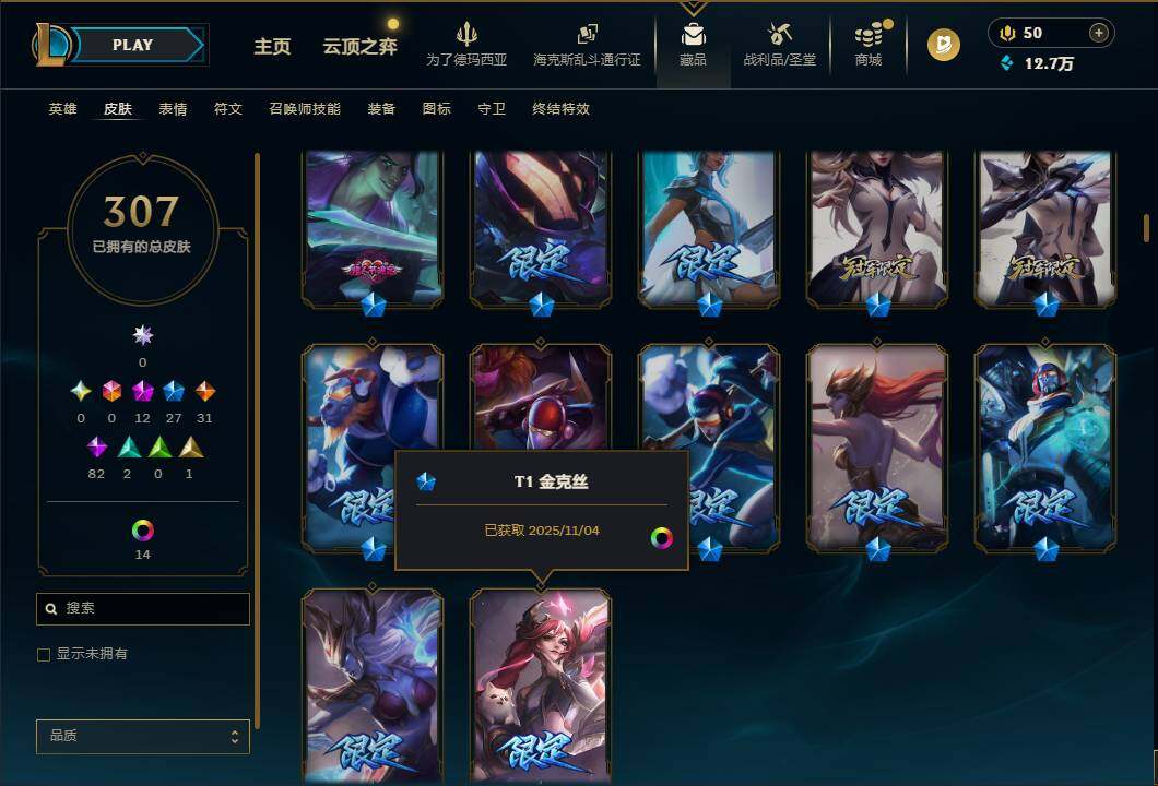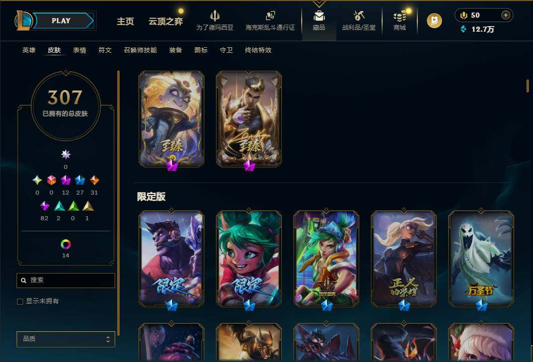 172英雄/307皮肤/12神话/27限定/6臻彩/22炫彩/31传说/82史诗/未定级账号等级:372/十周年纪念安妮/