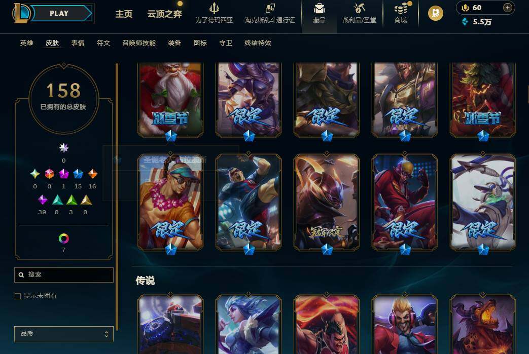172英雄/158皮肤/1神话/15限定/1臻彩/8炫彩/16传说/39史诗/青铜/源代码乐芙兰/