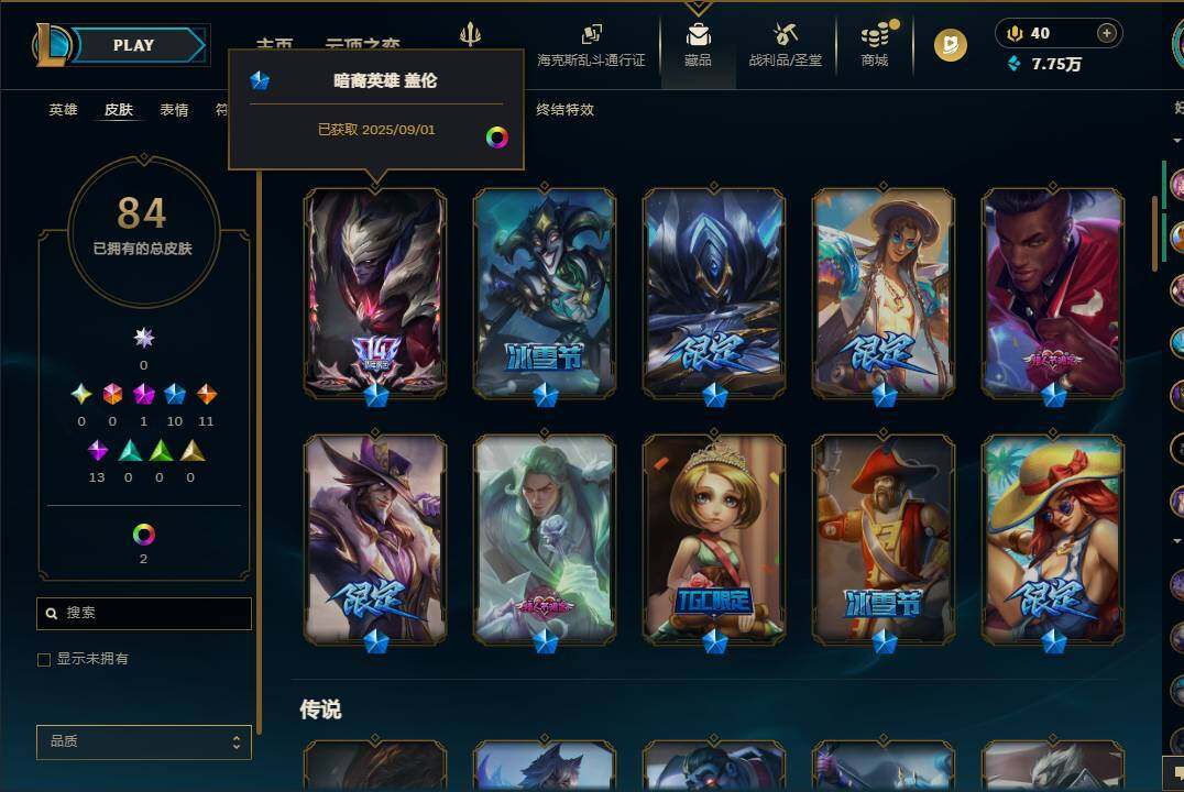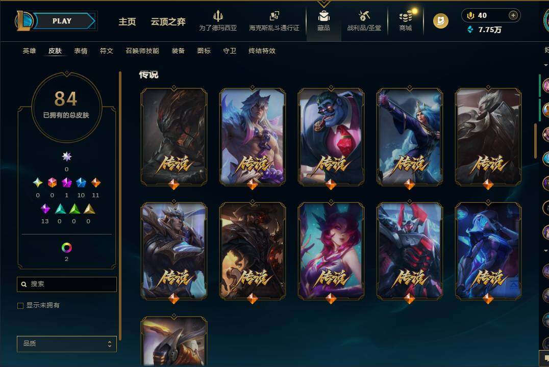 172英雄/84皮肤/1神话/10限定/5臻彩/14炫彩/11传说/13史诗/未定级账号等级:330/十五周年纪念希维尔/