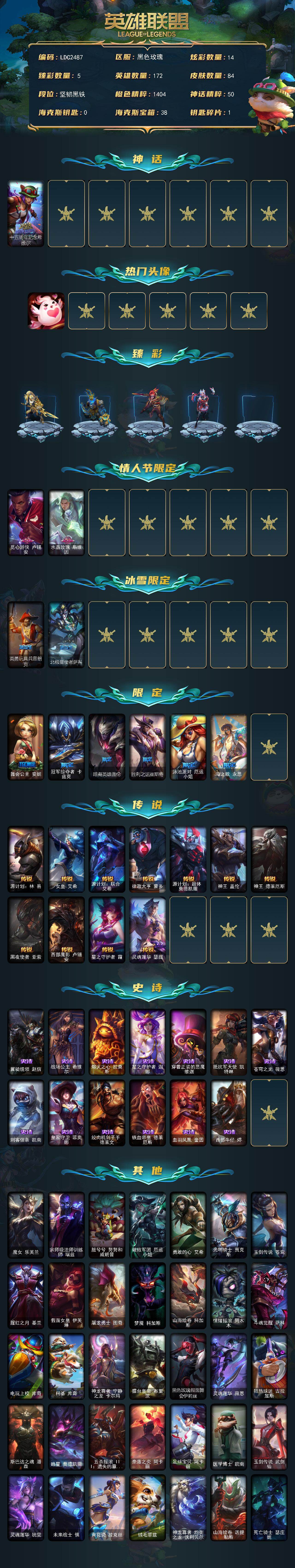 【LDC2487】172英雄/84皮肤/1神话/10限定/5臻彩/14炫彩/11传说/13史诗/未定级账号等级:330/十五周年纪念希维尔/爱情鸽头像/赵云子龙炫金将军/冠军典狱长锤石凯旋圣装/黎明使者锐雯黑夜使者/星之守护者卡莎热情之光/觅心游侠卢锡安/水晶玫瑰斯维因/英勇玩具兵普朗克/北极星使者萨科/舞会公主安妮/冠军掠夺者卡兹克/暗裔英雄盖伦/胜利之运崔斯特/泳池派对厄运小姐/海之歌永恩/源计划林易/女皇艾希/源计划联合艾希/律政大亨蒙多/源计划超体莫德凯撒/神王盖伦/神王德莱厄斯/黑夜使