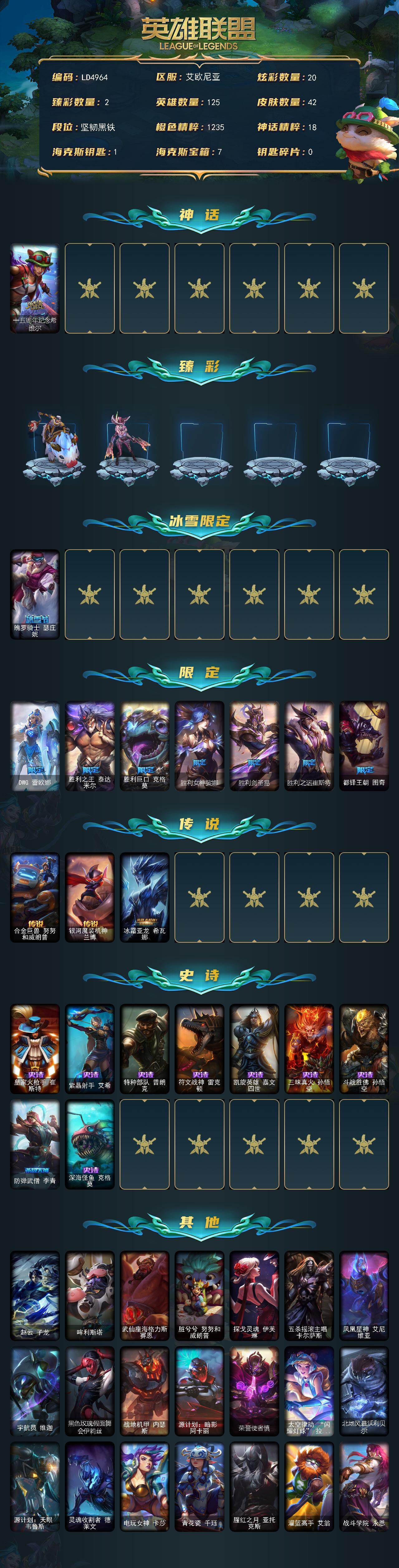 125英雄/42皮肤/1神话/8限定/2臻彩/20炫彩/3传说/9史诗/未定级/十五周年纪念希维尔/