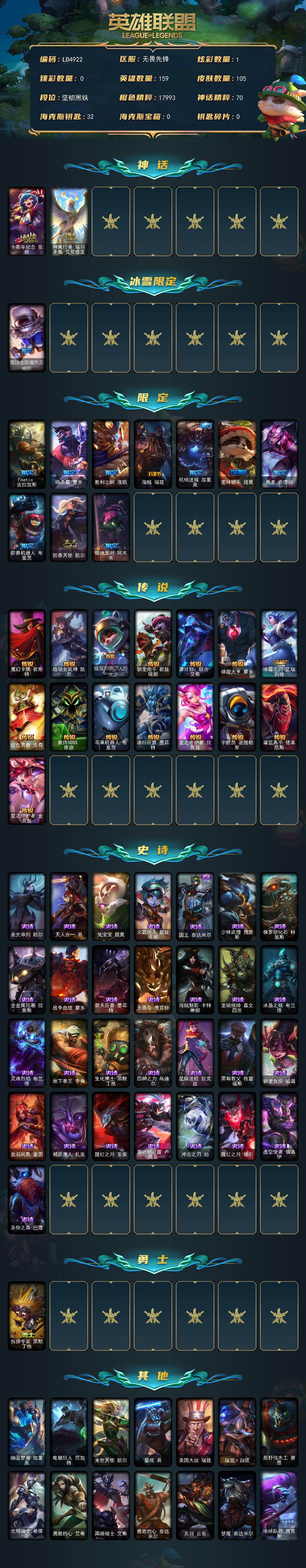 【LD4922】159英雄/105皮肤/2神话/11限定/1炫彩/15传说/29史诗/未定级/十周年纪念安妮/神凰行者瑞羽圣凰艾尼维亚/雪球也能爆炸吉格斯/Fnatic古拉加斯/暗杀星蒙多/胜利之树茂凯/海贼瑞兹/机械迷城加里奥/密林猎手提莫/勇者奈德丽/防暴机器人布里茨/防暴天使凯尔/惊悚派对阿木木/魔幻卡牌崔斯特/战场女武神凯尔/提莫约德尔人的一大步/驯龙炮手崔丝塔娜/源计划联合艾希/律政大亨蒙多/冰霜之刃艾瑞莉娅/红色男爵库奇/最终BOSS维迦/苹果机器人布里茨/冰川巨兽墨菲特/星之守护者