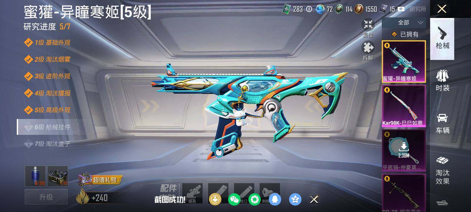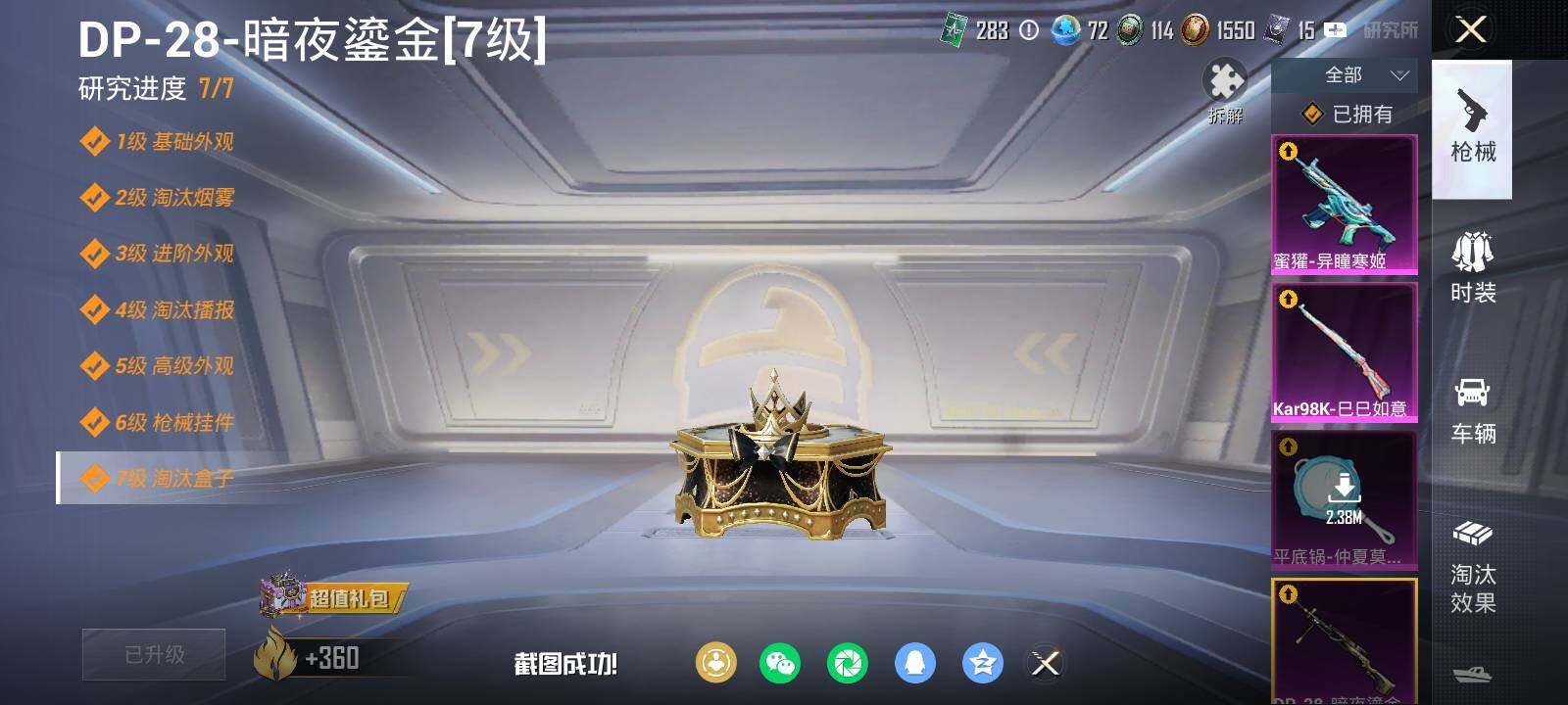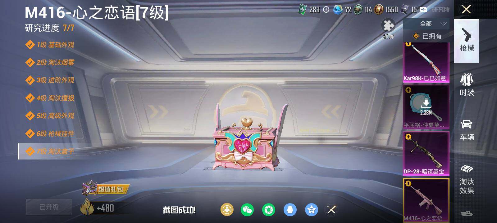 【粉色枪皮等级】:M416-心之恋语(七级),蜜獾-异瞳寒姬(五级),Kar98K-巳巳如意(五级),DP-28-暗夜鎏金(