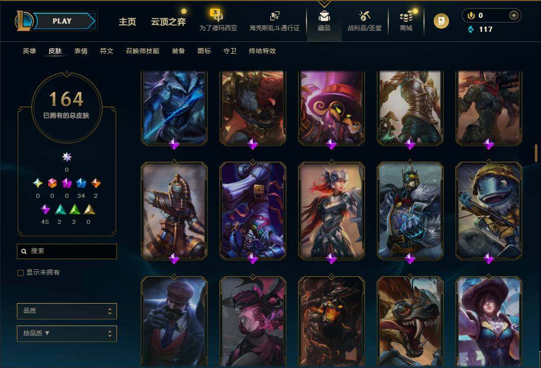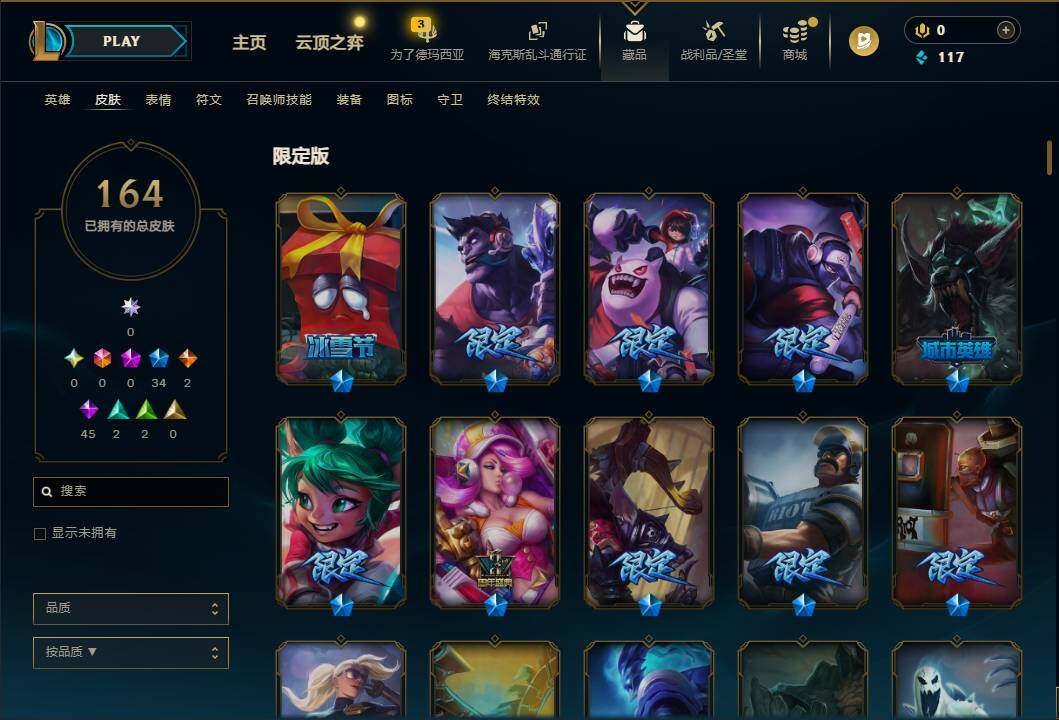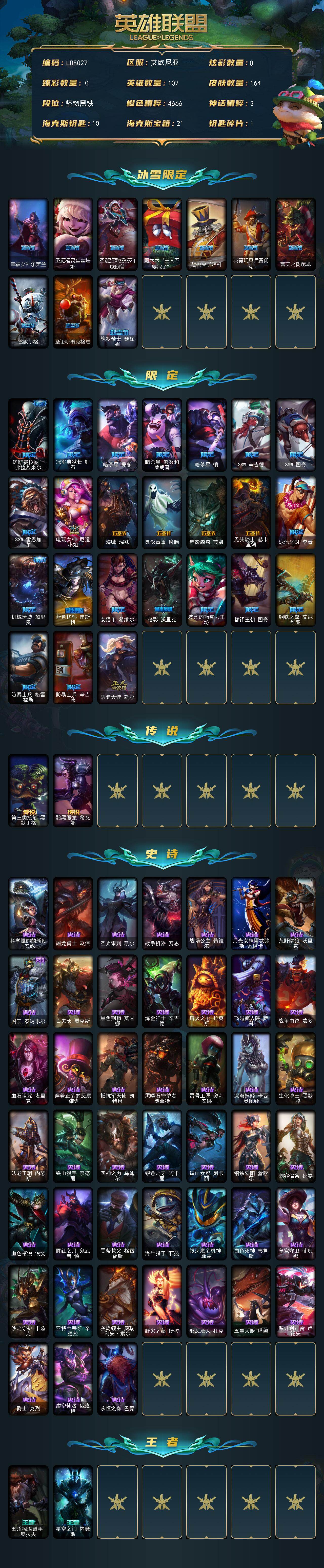 【LD5027】102英雄/164皮肤/34限定/2传说/45史诗/未定级账号等级:35/幸福女神乐芙兰/圣诞精灵崔丝塔娜/圣诞狂欢努努和威朗普/阿木木“主人不要我了”/胡桃夹子萨科/英勇玩具兵普朗克/喜庆之树茂凯/雪默丁格/圣诞驯鹿克格莫/魄罗骑士瑟庄妮/诺斯费拉图弗拉基米尔/冠军典狱长锤石/暗杀星蒙多/暗杀星努努和威朗普/暗杀星慎/SSW辛吉德/SSW图奇/SSW雷恩加尔/电玩女神厄运小姐/海贼瑞兹/鬼影重重魔腾/鬼影森森茂凯/无头骑士赫卡里姆/泳池派对李青/机械迷城加里奥/蓝色忧郁崔斯特/