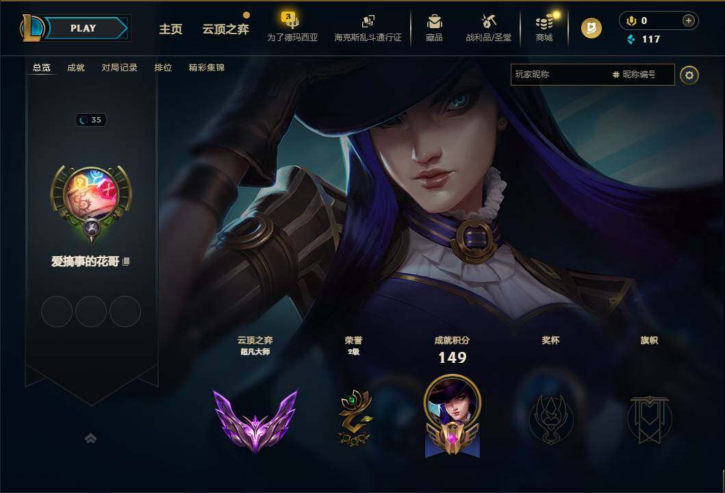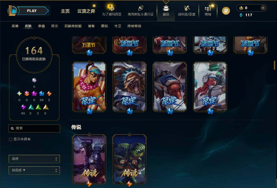 102英雄/164皮肤/34限定/2传说/45史诗/未定级账号等级:35/幸福女神乐芙兰/圣诞精灵崔丝塔娜/