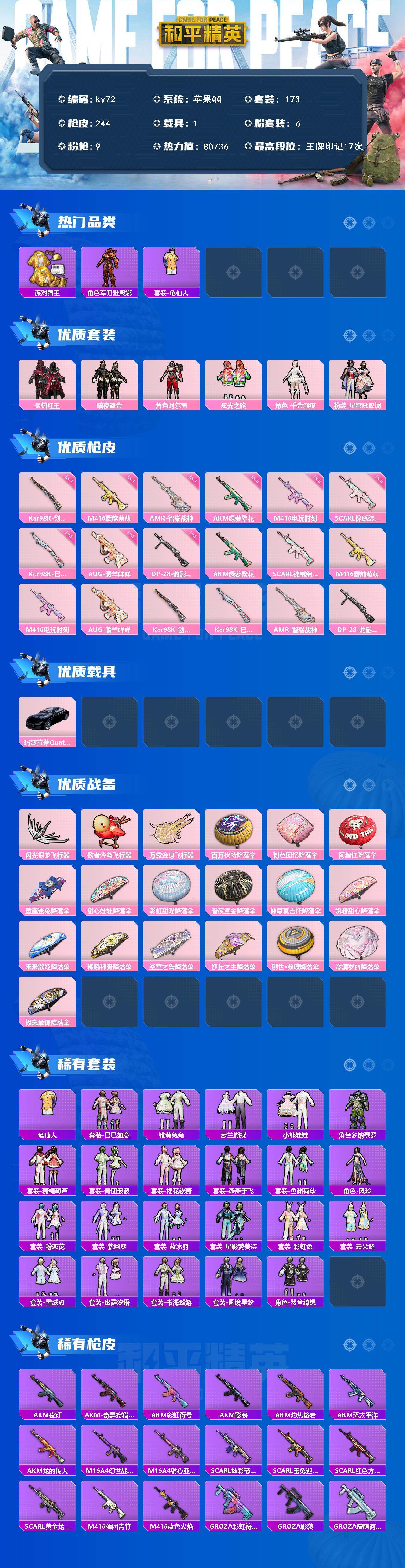 苹果 手Q-6粉装-9特效枪-1载具-3粉色飞行器-80736热力值-17王牌印记-173套装-244枪皮