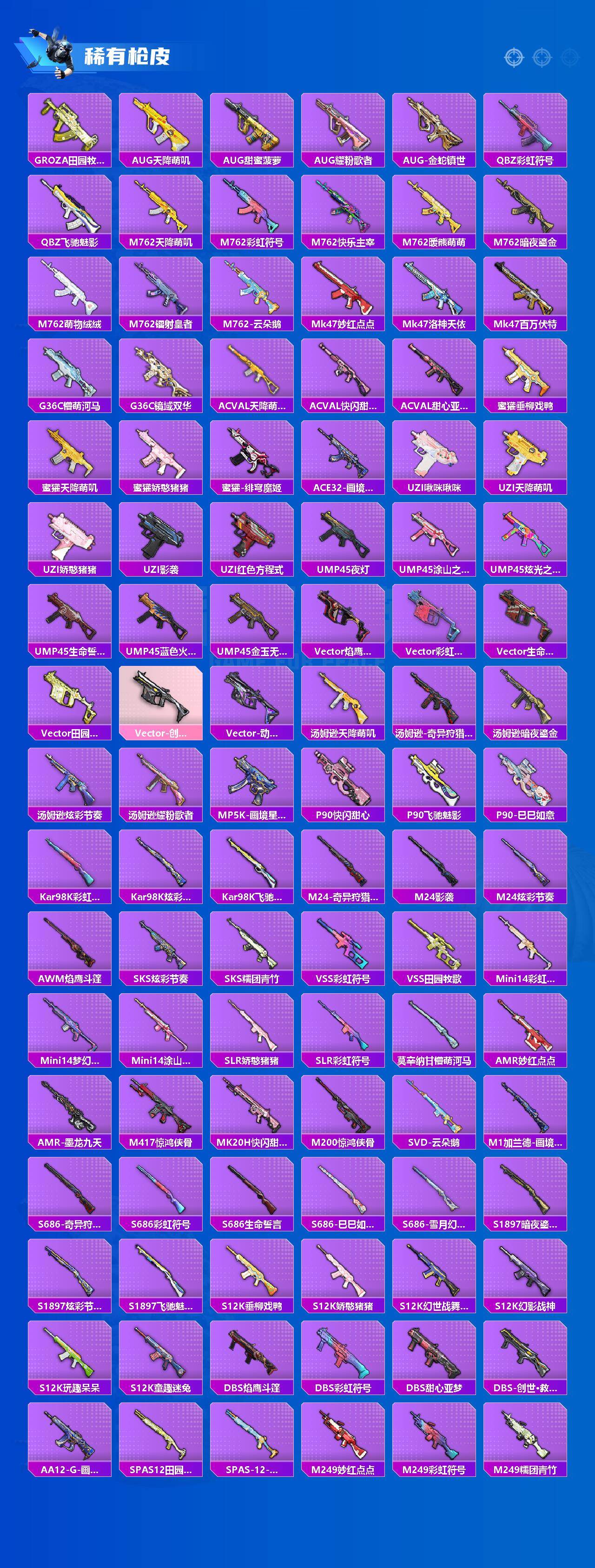 【粉色枪皮等级】:AKM-绿萝繁花(五级),SCAR-L-锦绣绵绵(五级),M416-暖熊萌萌(七级),M416-电玩